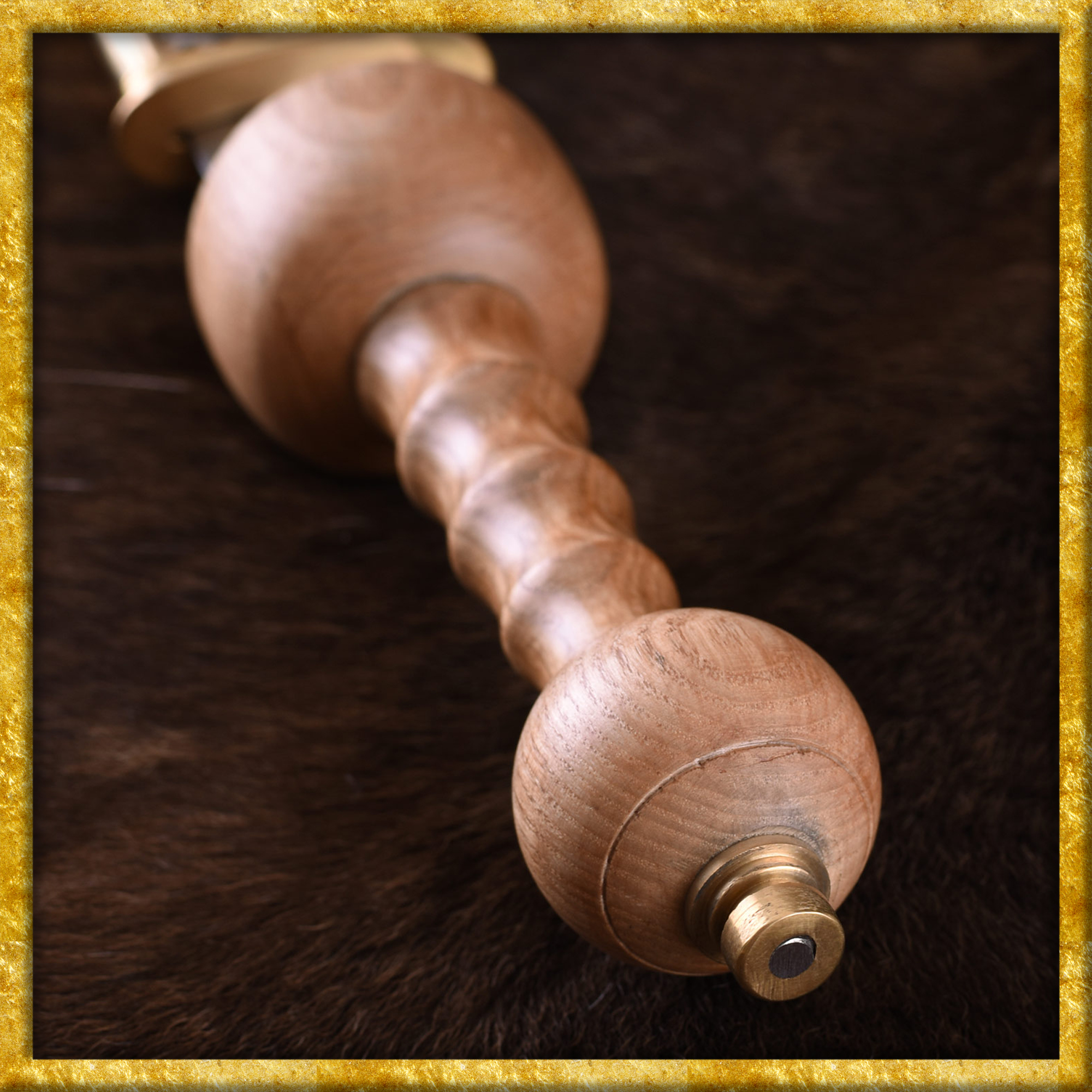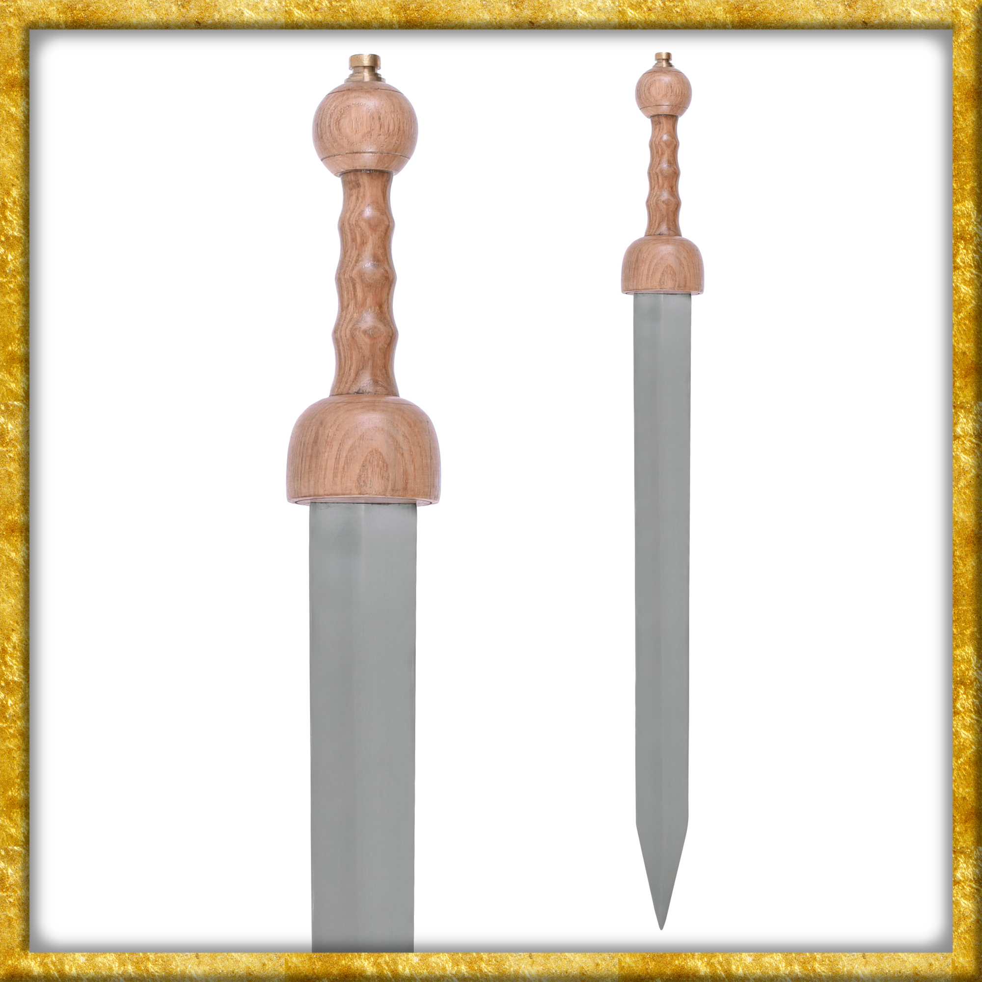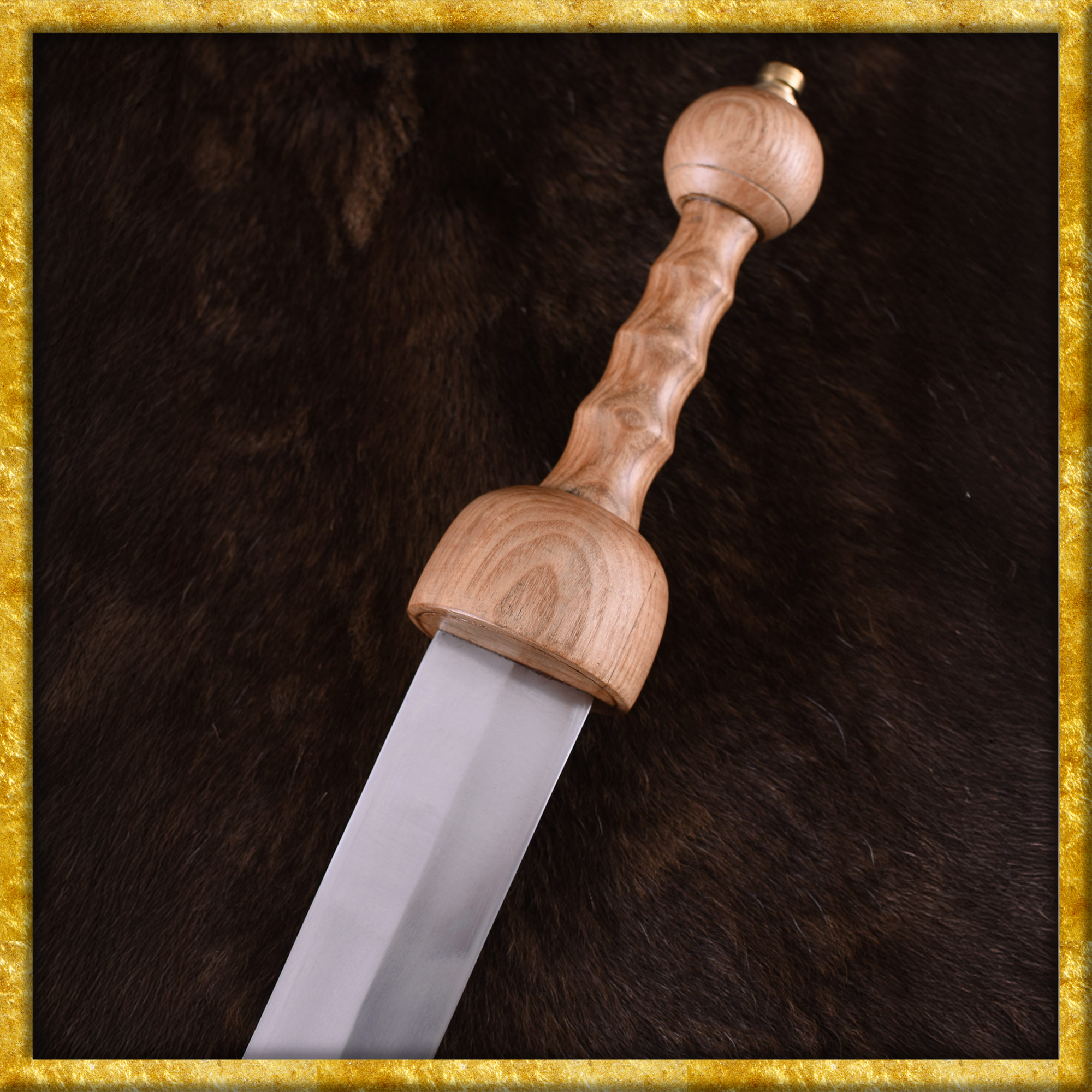 Das hier angebotene Römerschwert ist eine Rekonstruktion eines klassischen Gladius vom Typ Pompeji aus dem späten 1. Jahrhundert. Die Klinge mit geraden, parallel verlaufenden Schneiden und kurzer, dreieckiger Spitze ist aus Federstahl EN45 geschmiedet (weder gehärtet, noch wärmebehandelt). Die Schneiden sind nicht geschärft und die durchgehende Klingenangel ist am Griffende verschraubt (Gewindemutter aus Messing). Griffstück, Parier und Knauf sind aus Holz gearbeitet.