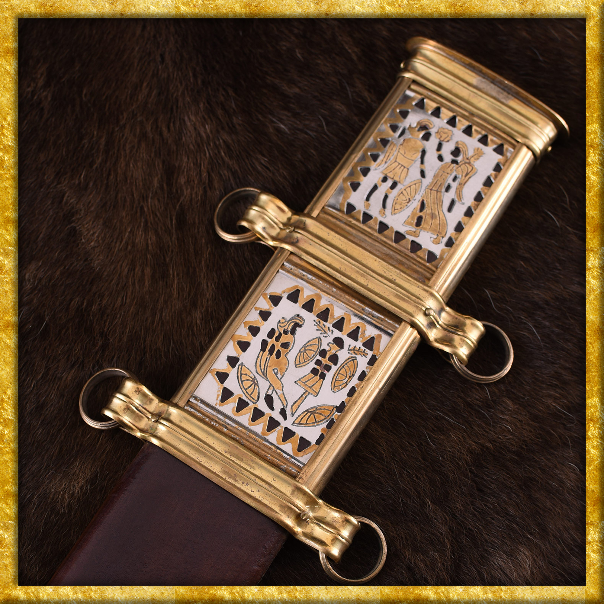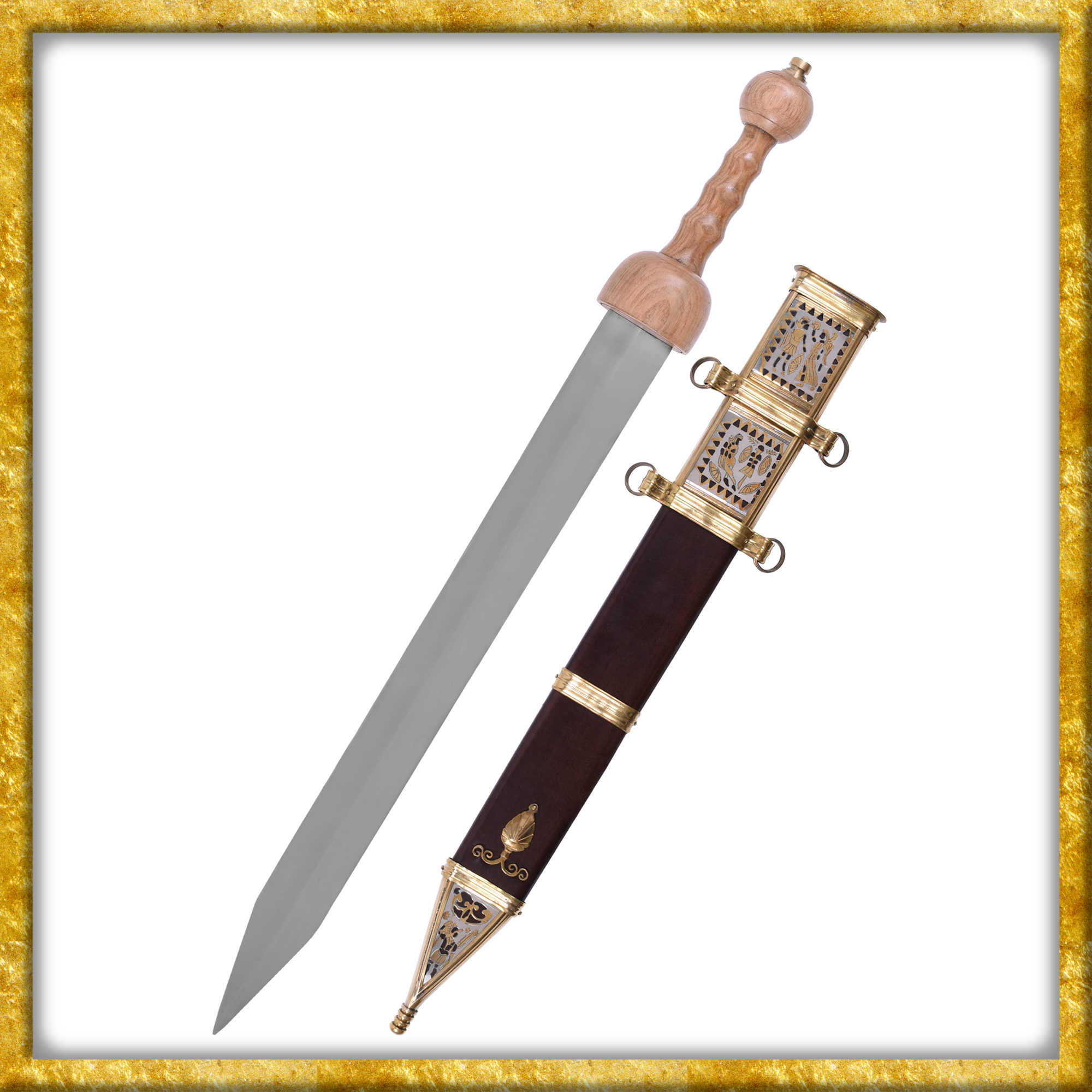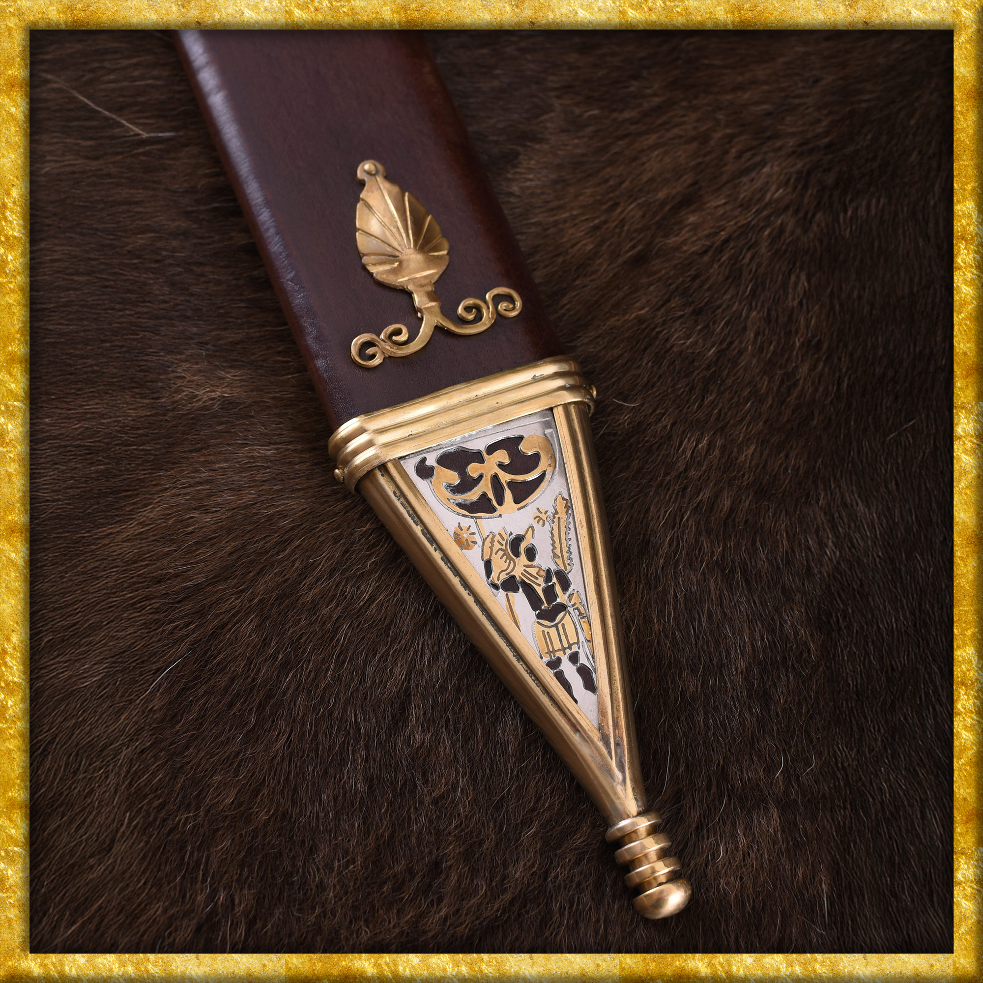 Geliefert wird der römische Einhänder samt kunstvoll verzierter Holz-/Lederscheide mit Messingbeschlägen, die auf archäologischen Fundstücken aus der Sammlung des Museums Het Valkhof in Nijmegen (Niederlande) basieren. Das schauseitig in zwei Zierfeldern geteilte Mundblech ist mit partiell verzinnten, teils durchbrochenen, teils gravierten Motiven dekoriert. Das Ortband besteht aus einer V-förmigen Einfassung mit Ortknopf, einem Horizontalband und einem mit dem Mundblech abgestimmten Zierblech. Oberhalb des Ortbandes ist eine Palmette angebracht. Tragringe aus Gussmessing ermöglichen es dem Träger, seinen Gladius wie ein echter Römer mitzuführen.