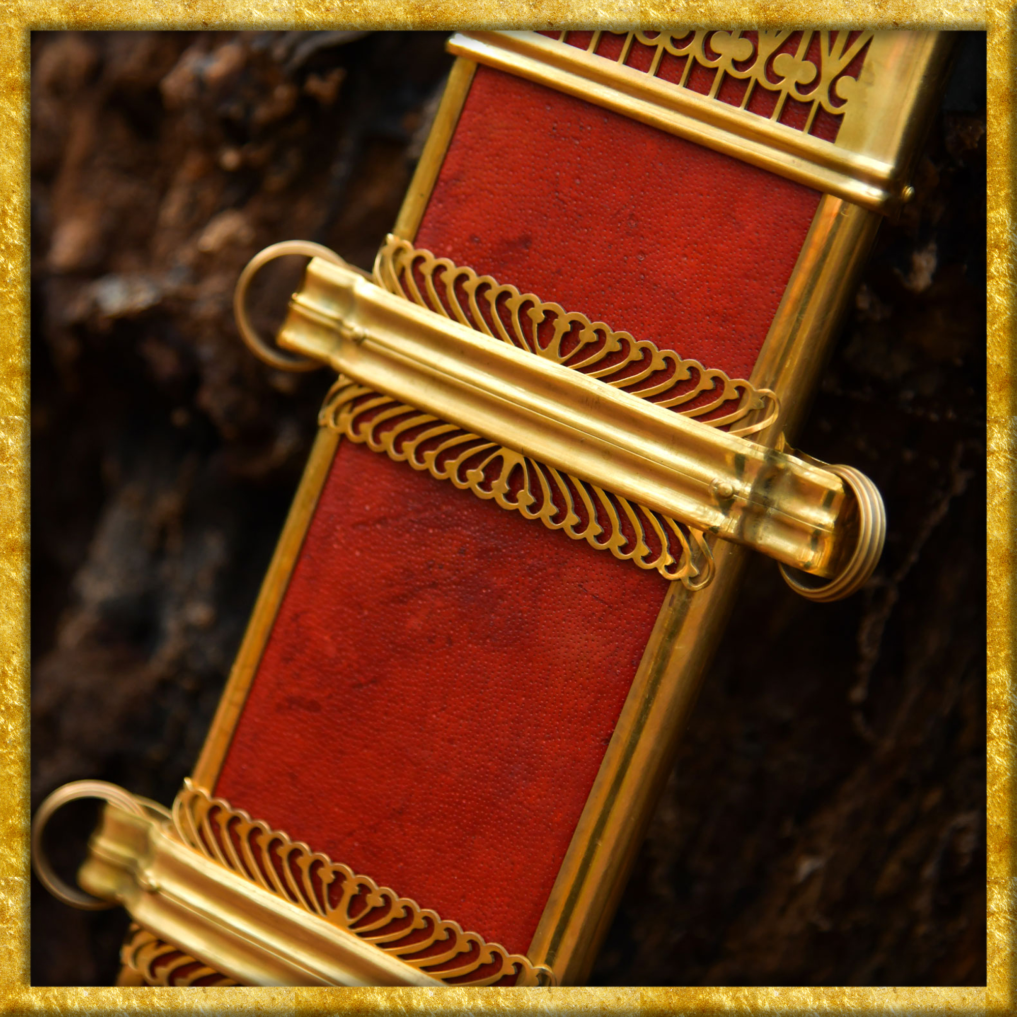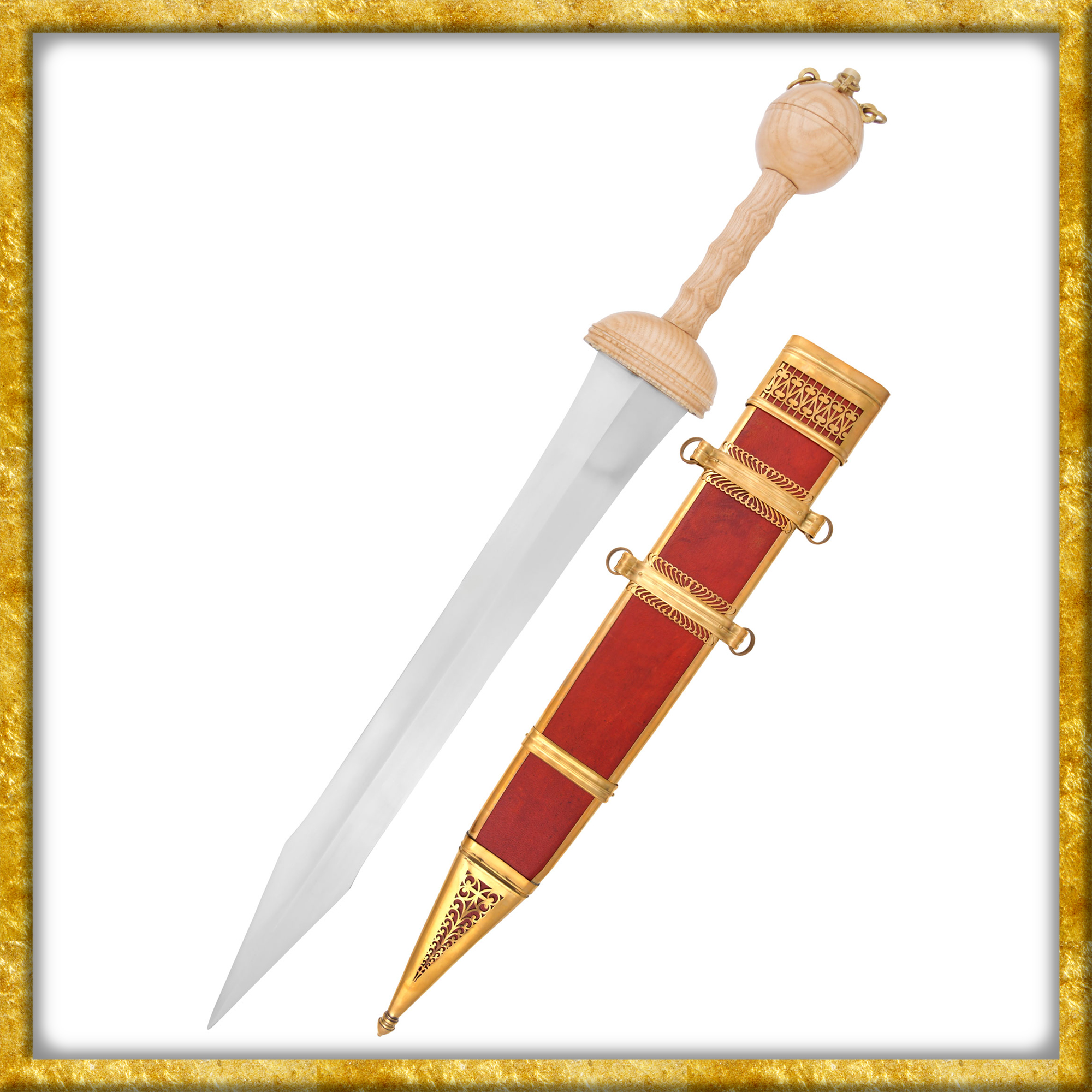 Geliefert wird das römische Kurzschwert samt einer schönen, mit rotem Leder bezogenen Holzscheide mit Messingbeschlägen. An den zwei oberen Bändern sind Trageringe aus Messing angebracht, die es dem Träger ermöglichen, seinen Gladius wie ein echter Römer zu führen.