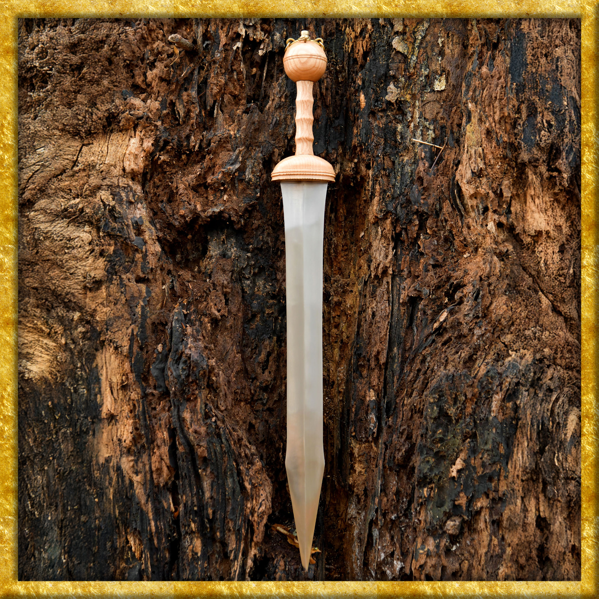 Bei diesem Kurzschwert handelt es sich um eine detailgetreue Replik eines römischen Gladius, der in den 1950er Jahren bei Baggerarbeiten in der Donau nahe Dubravica in Serbien entdeckt wurde. Es wird vermutet, dass der ursprüngliche Besitzer ein römischer Soldat oder ein Angehöriger der römischen Hilfstruppen war.