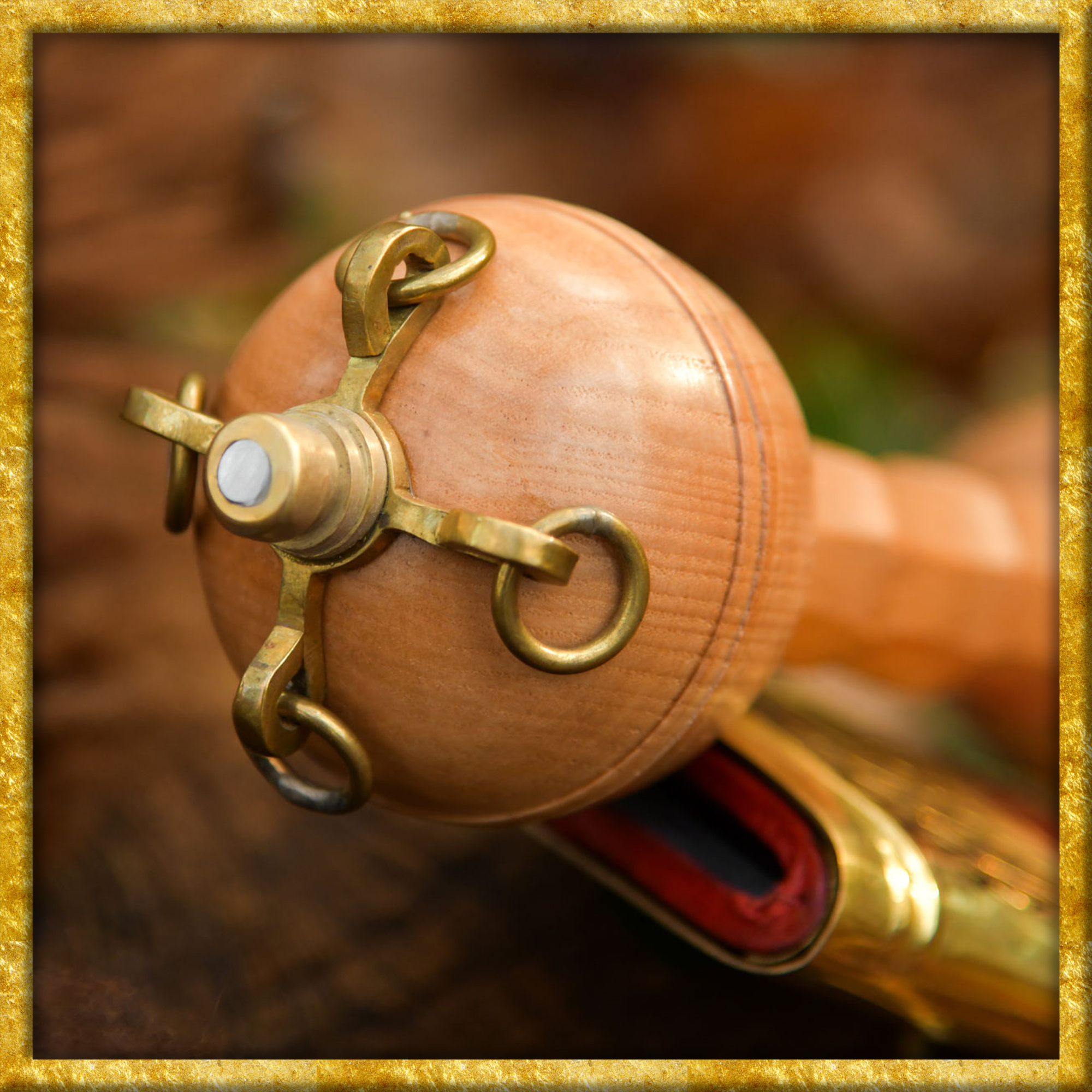 Griff, Parier und Knauf sind vollständig aus Holz gefertigt. Ein besonderes Merkmal dieses Gladius sind die vier Bronzeringe am oberen Ende des Knaufs, die vermutlich eine rangbezogene oder zeremonielle Bedeutung hatten. Ein weiteres schönes Detail ist die klingenseitig eingelassene Messingplatte an der Unterseite des Pariers.