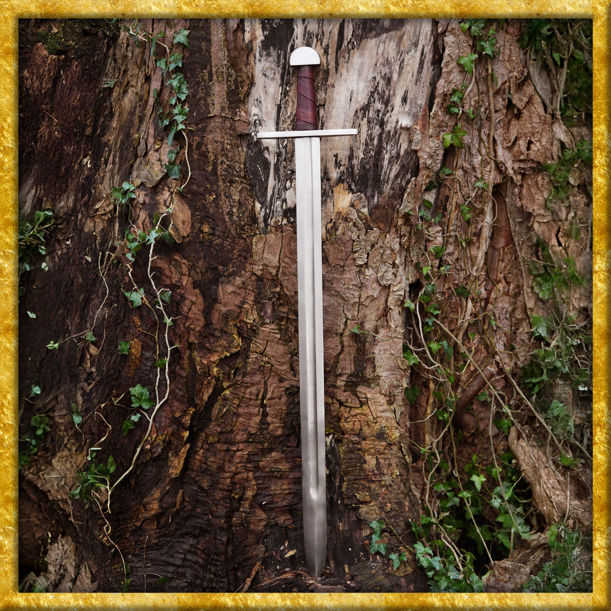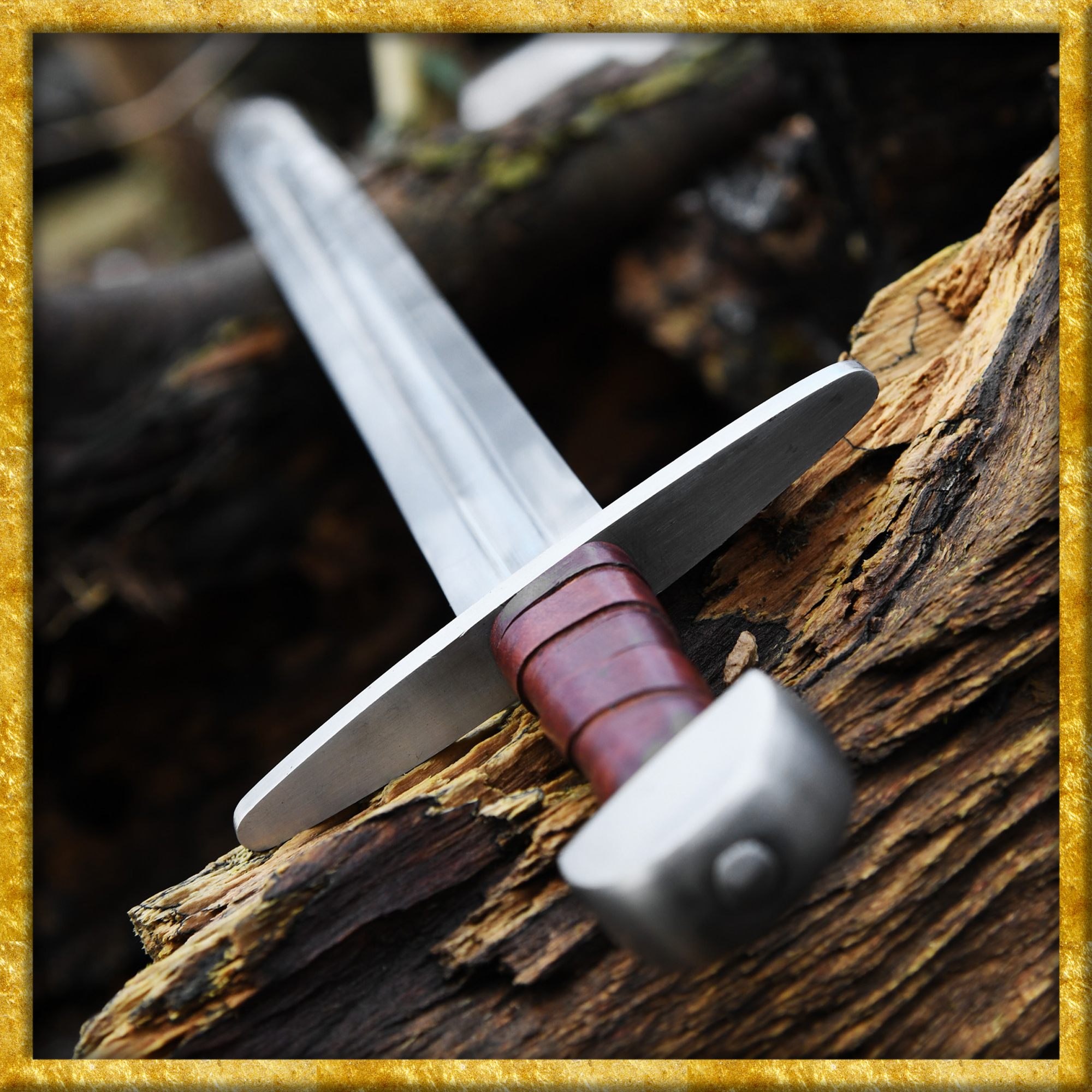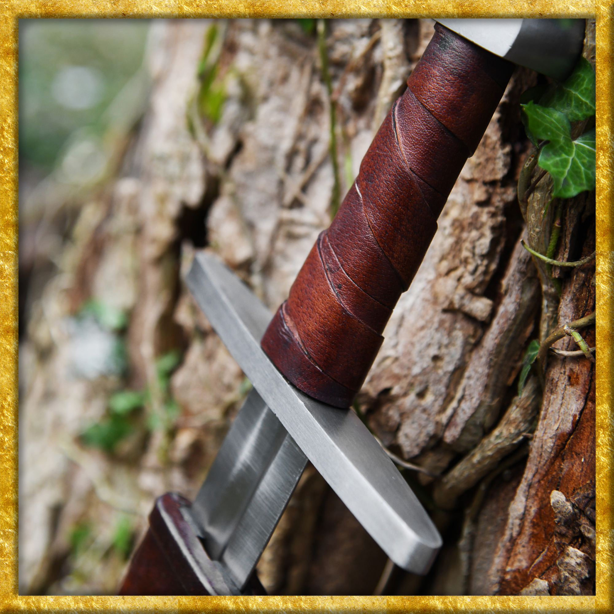 Diese wundervolle Replik eines Normannenschwerts ist ausschliesslich in Handarbeit gefertigt. Die Parierstange und der typische Knauf sind aus Eisen. Die Klinge ist bis zum Knauf durchgehend und dort handvernietet. Der Griff ist mit einem breiten Lederriemen umwickelt. Die Klinge verfügt über eine ausgeprägte Hohlkehle, welche dem Schwert große Elastizität und zugleich Leichtigkeit verleiht. Die Klingenschneide ist ungeschärft.