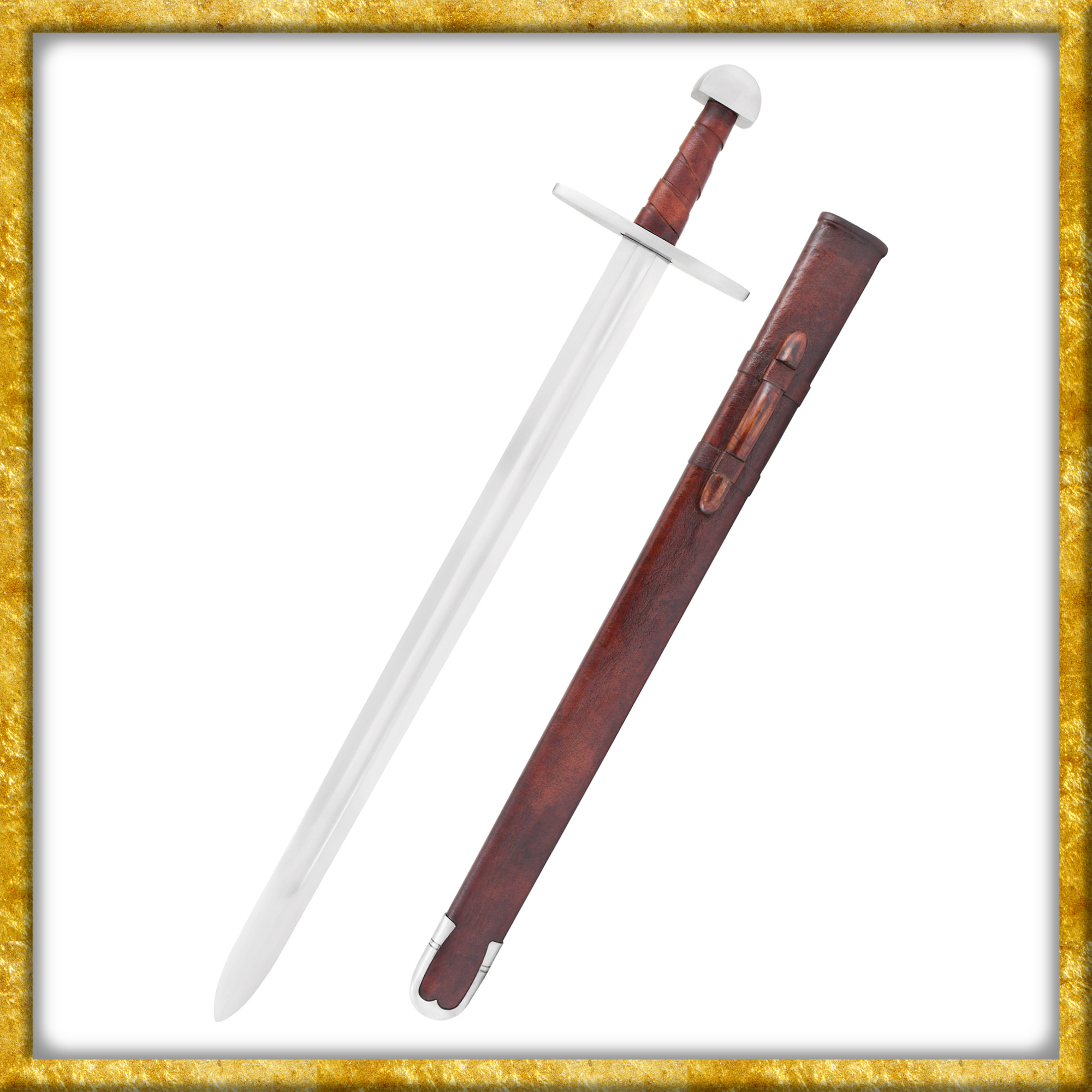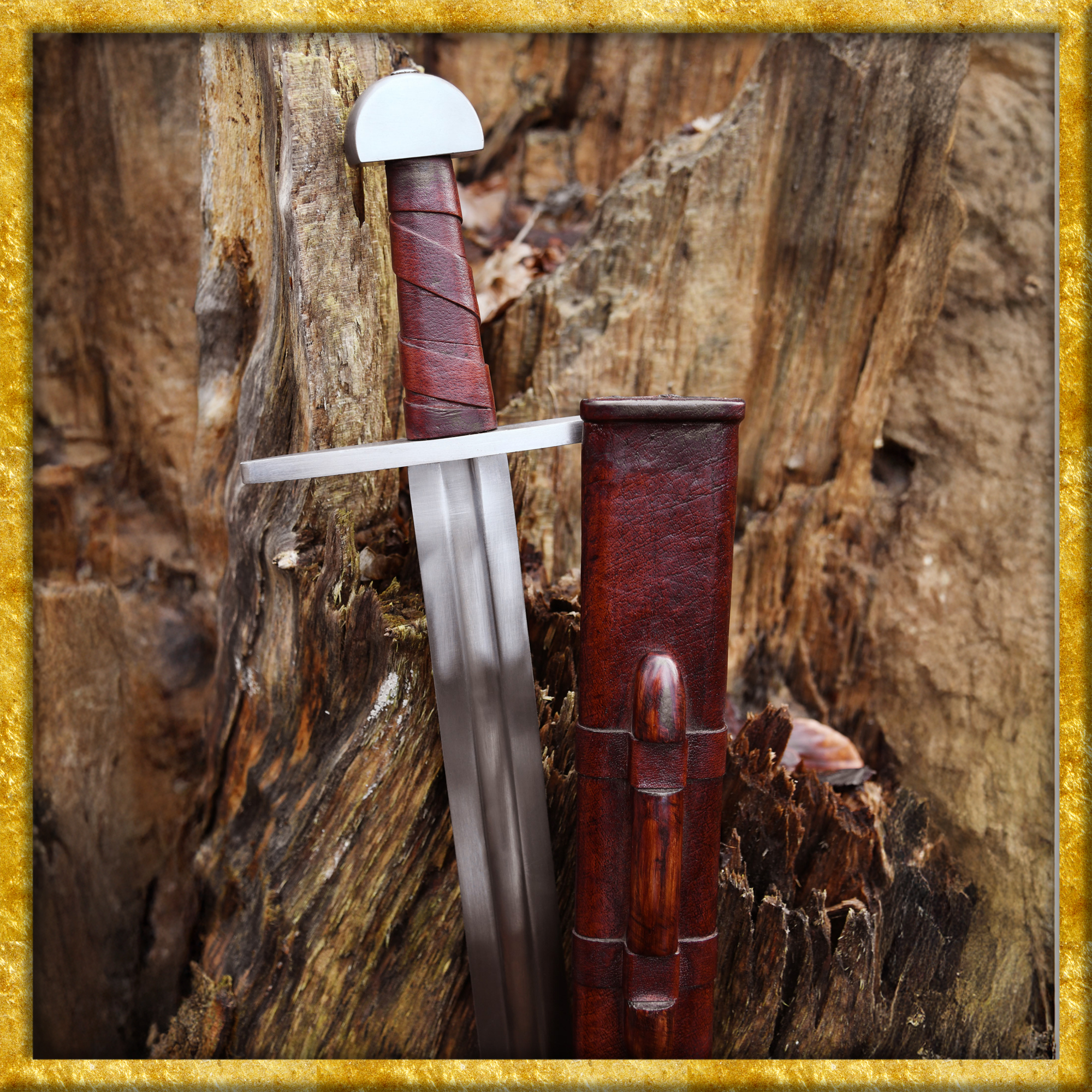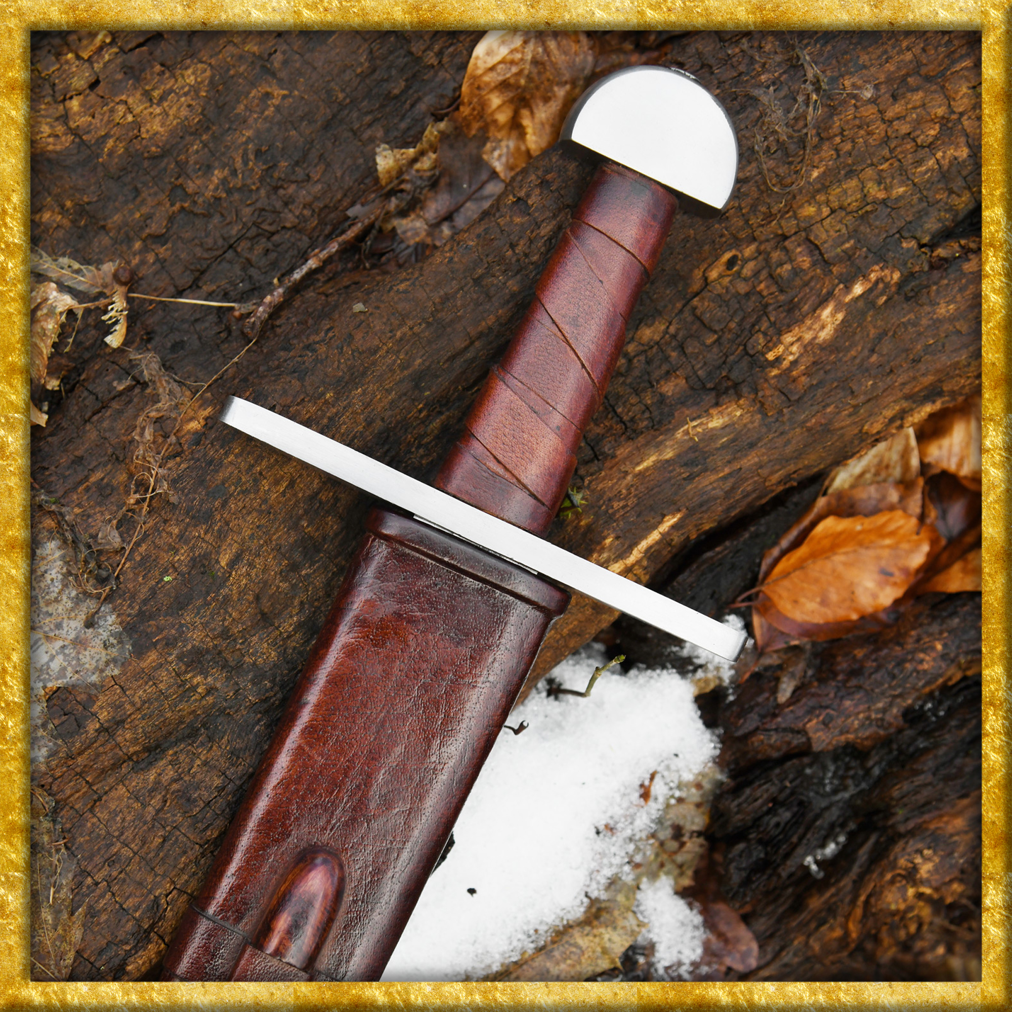 Diese wundervolle Replik eines Normannenschwerts ist ausschliesslich in Handarbeit gefertigt. Die Parierstange und der typische Knauf sind aus Eisen. Die Klinge ist bis zum Knauf durchgehend und dort handvernietet. Der Griff ist mit einem breiten Lederriemen umwickelt. Die Klinge verfügt über eine ausgeprägte Hohlkehle, welche dem Schwert große Elastizität und zugleich Leichtigkeit verleiht. Die Klingenschneide ist ungeschärft.