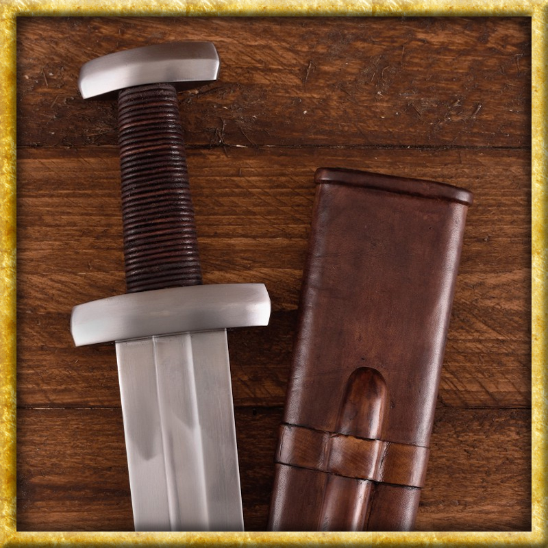 Basierend auf dem Design klassischer Wikingerschwerter bietet das Hurum Wikingerschwert eine breite Klinge aus EN45 Federstahl und verfügt über eine ausgeprägte Hohlkehle, welche dem Schwert grosse Elastizität und zugleich Leichtigkeit verleiht. Die Schneiden sind nicht geschärft und die Spitze ist abgerundet. Die kurze Parierstange sowie der Knauf bestehen aus Stahl. Der Griff des Schwertes ist mit Lederschnur umwickelt. Das Schwert kommt mit einer sehr schönen Holz-Lederscheide mit Holzbügel als Gürtelschlaufe für max. 5cm breite Gürtel. Die Scheide besitzt ein Ortblech aus Stahl.