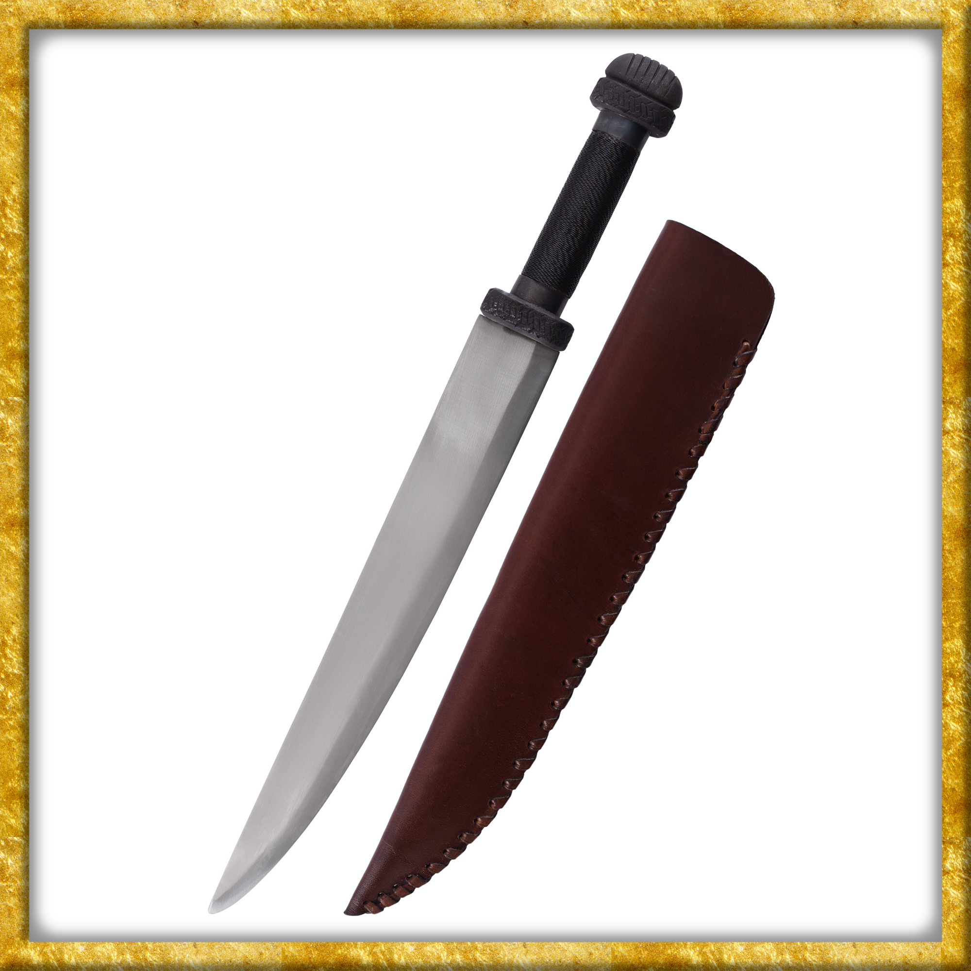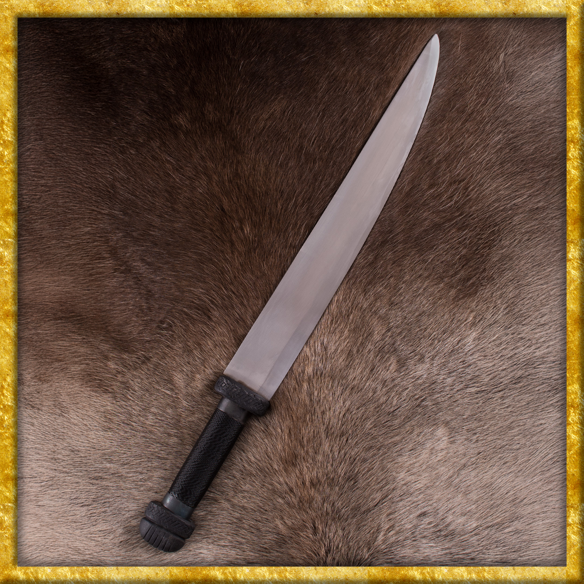 In Sachen Grösse liegt dieses handgefertigte wikingerzeitliche Saxmesser, an der Schwelle zwischen langem Dolch und Kurzschwert. Es besitzt eine einschneidige, ungeschärfte Klinge aus EN45-Federstahl mit einem kräftigen Rücken, einem spitzen Ort und einem Vollerl, der am Knauf verschraubt ist. Parier und Knauf sind beide aus Stahl gegossen und die Griffpartie mit Holzkern ist fest mit Draht umwickelt.