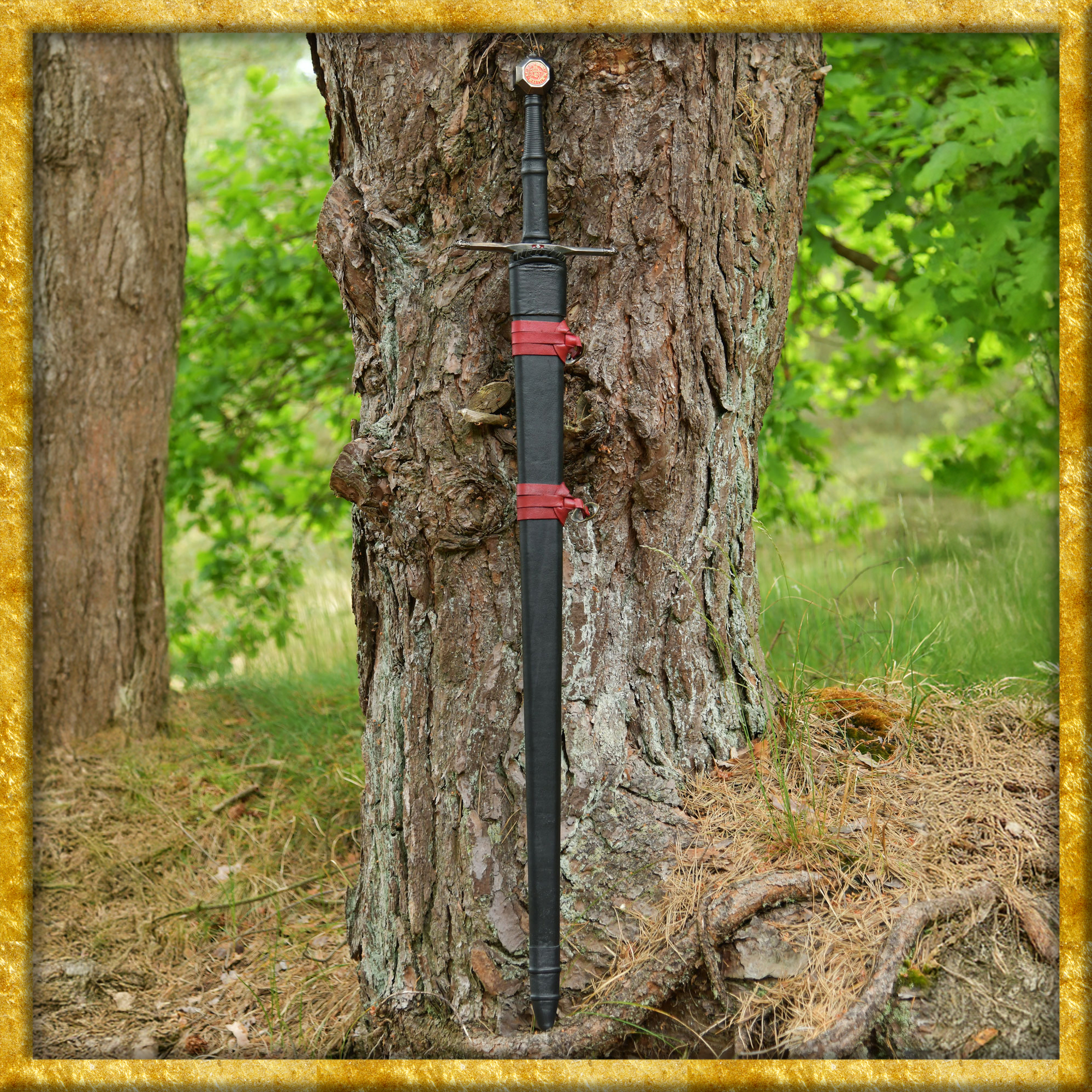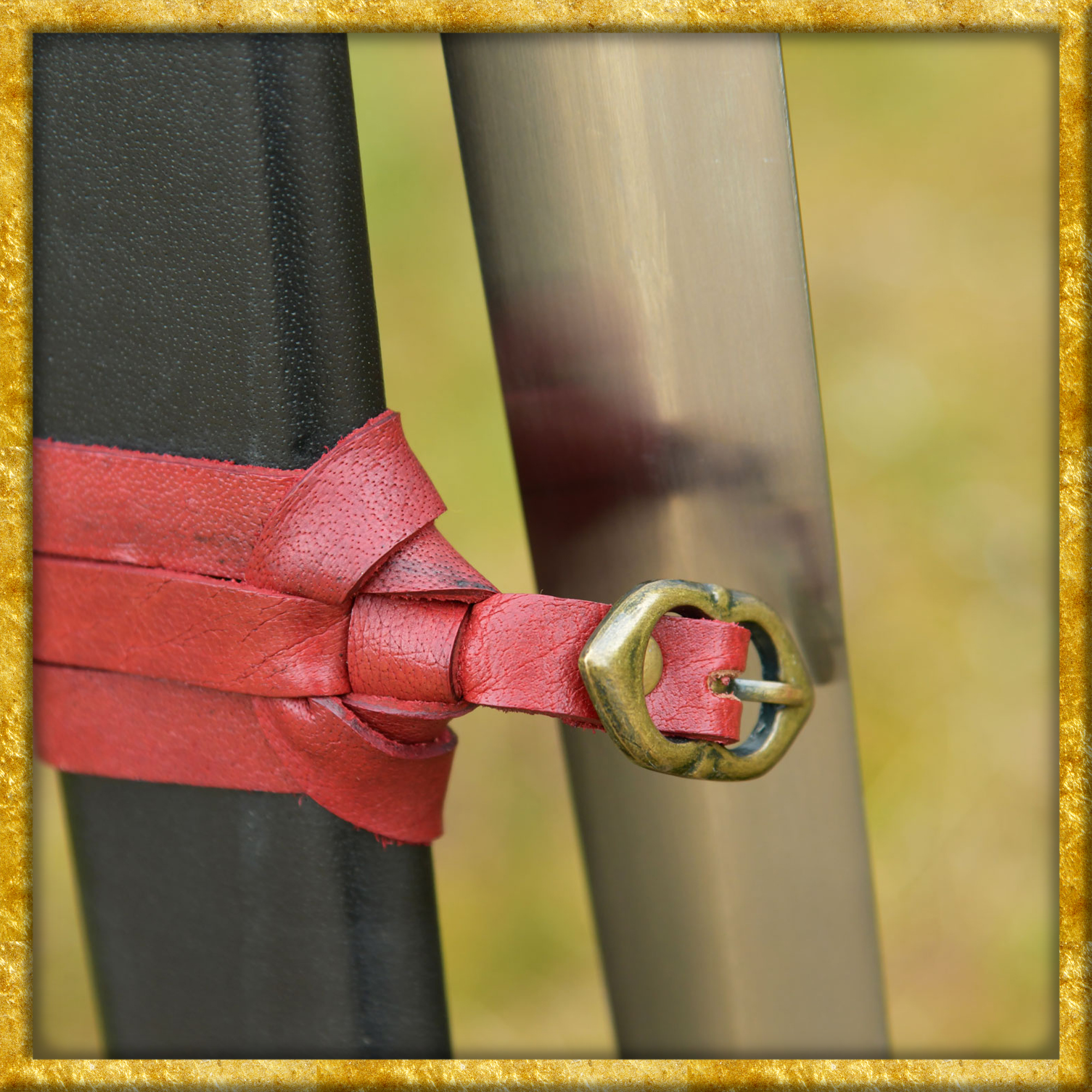 Geliefert wird das Ritterschwert inklusive einer schönen Schwertscheide aus Holz mit schwarzem Lederbezug. Zwei rote Lederbänder mit Messingschnallen im Antik-Finish setzten nicht nur dekorative Akzente, sondern ermöglichen auch die einfache Befestigung eines Schwertgürtels.