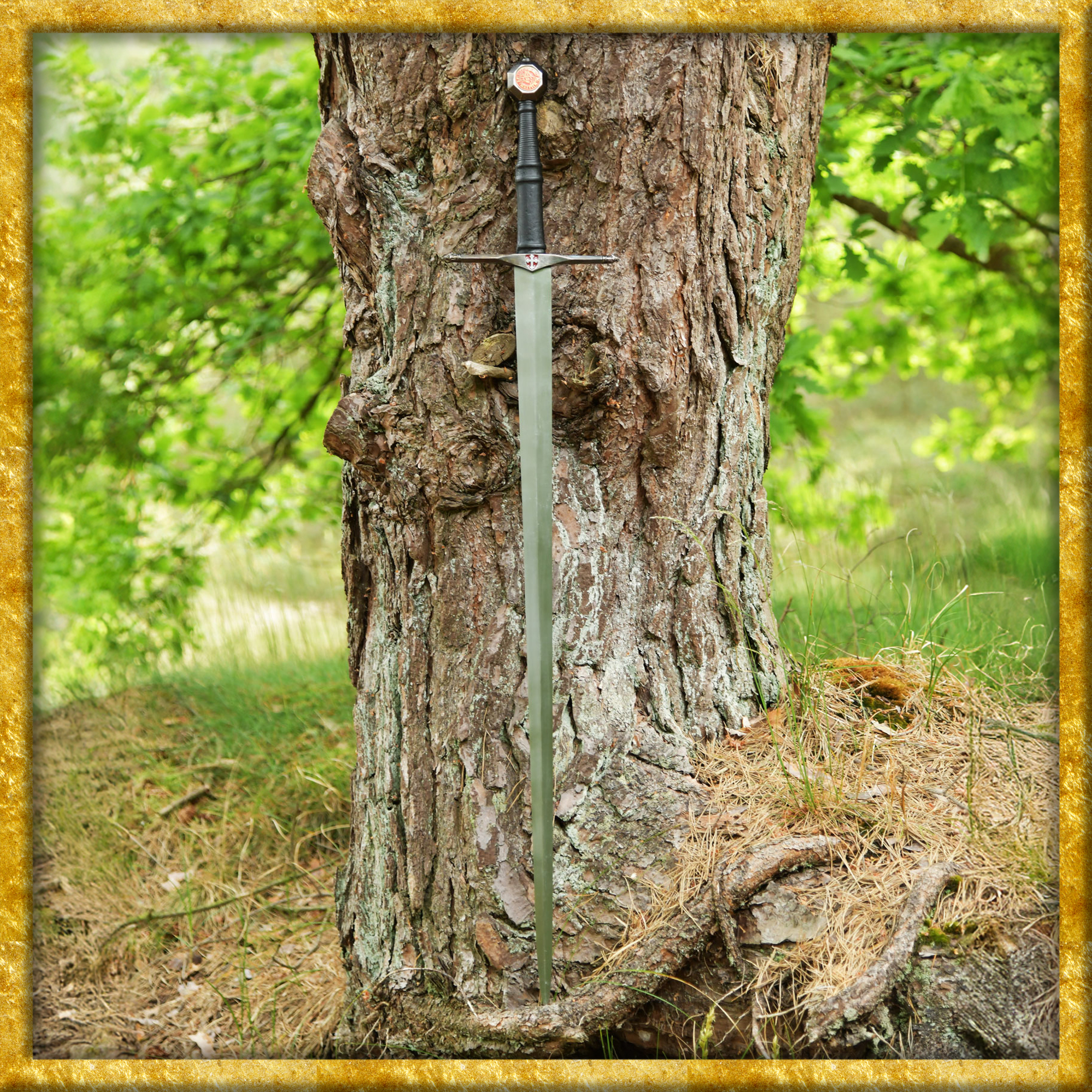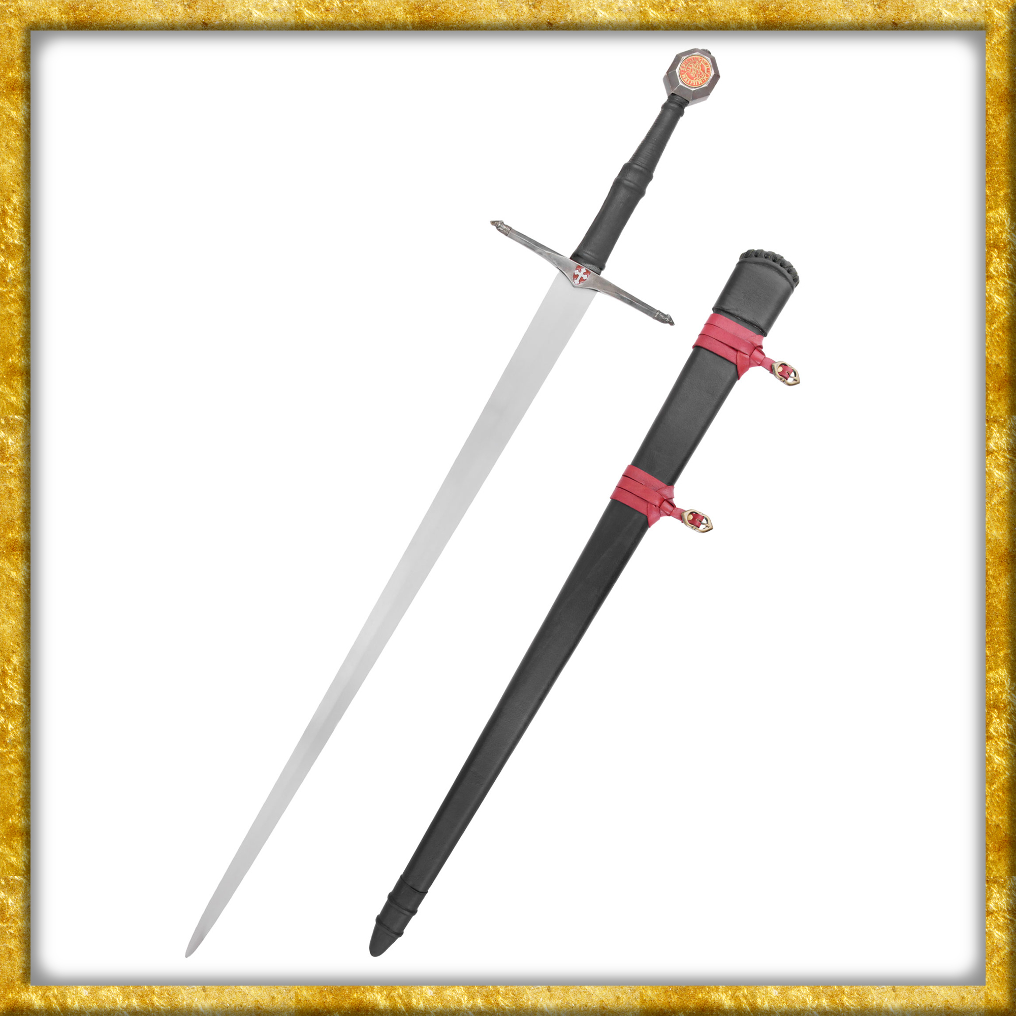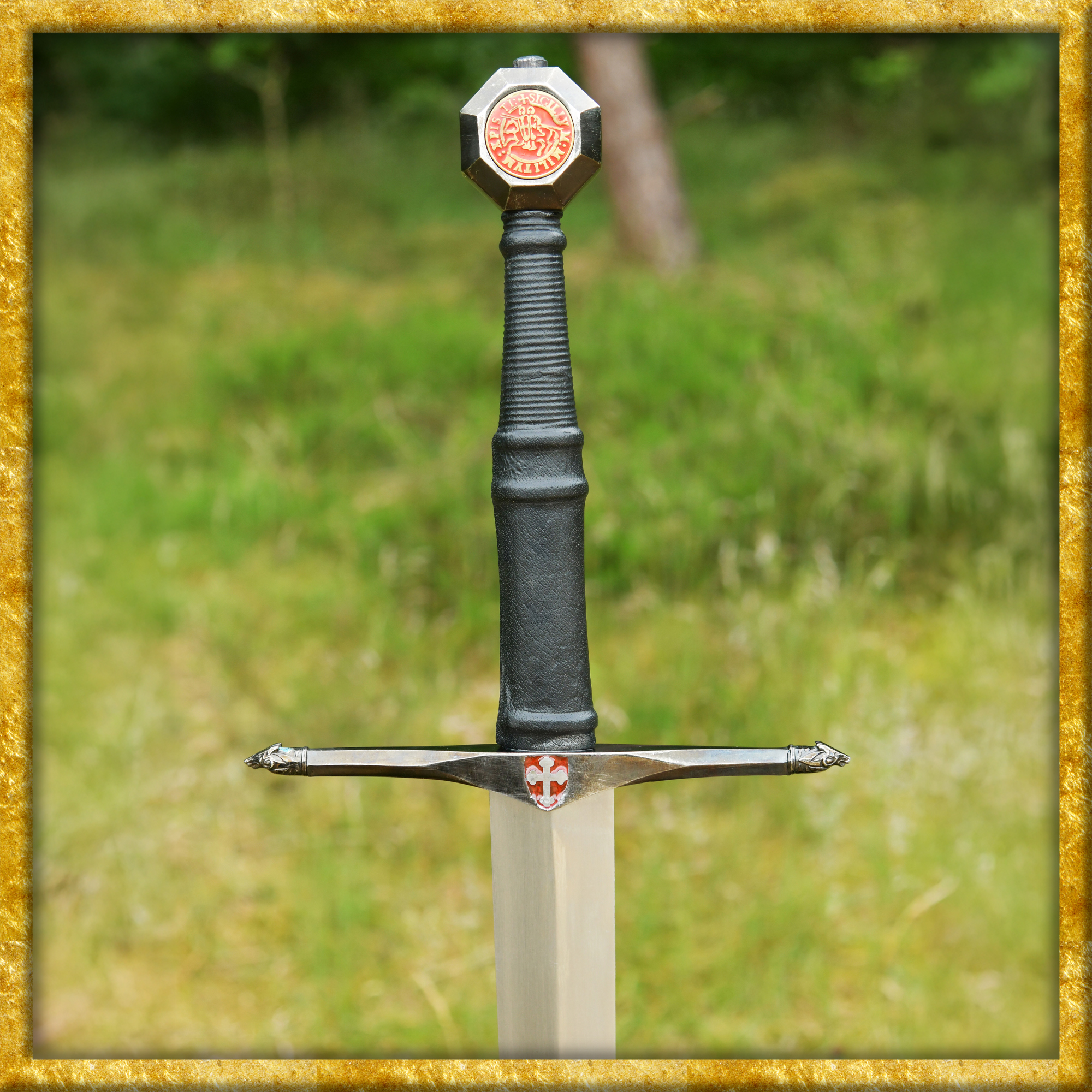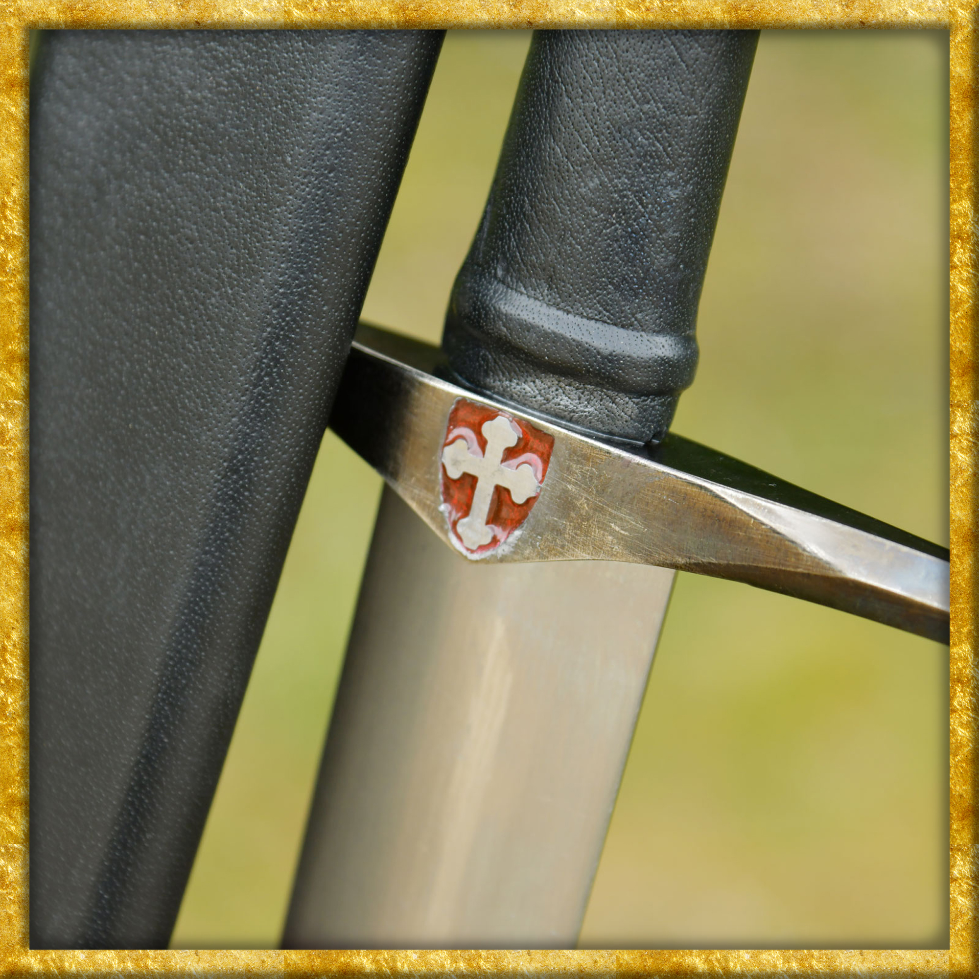 Bei diesem schönen Mittelalterschwert, das mit Symbolen und Wappen der Templer verziert ist, handelt es sich nicht um eine exakte Replik eines historischen Originalfundes, sondern um eine Hommage an die Tempelritter.