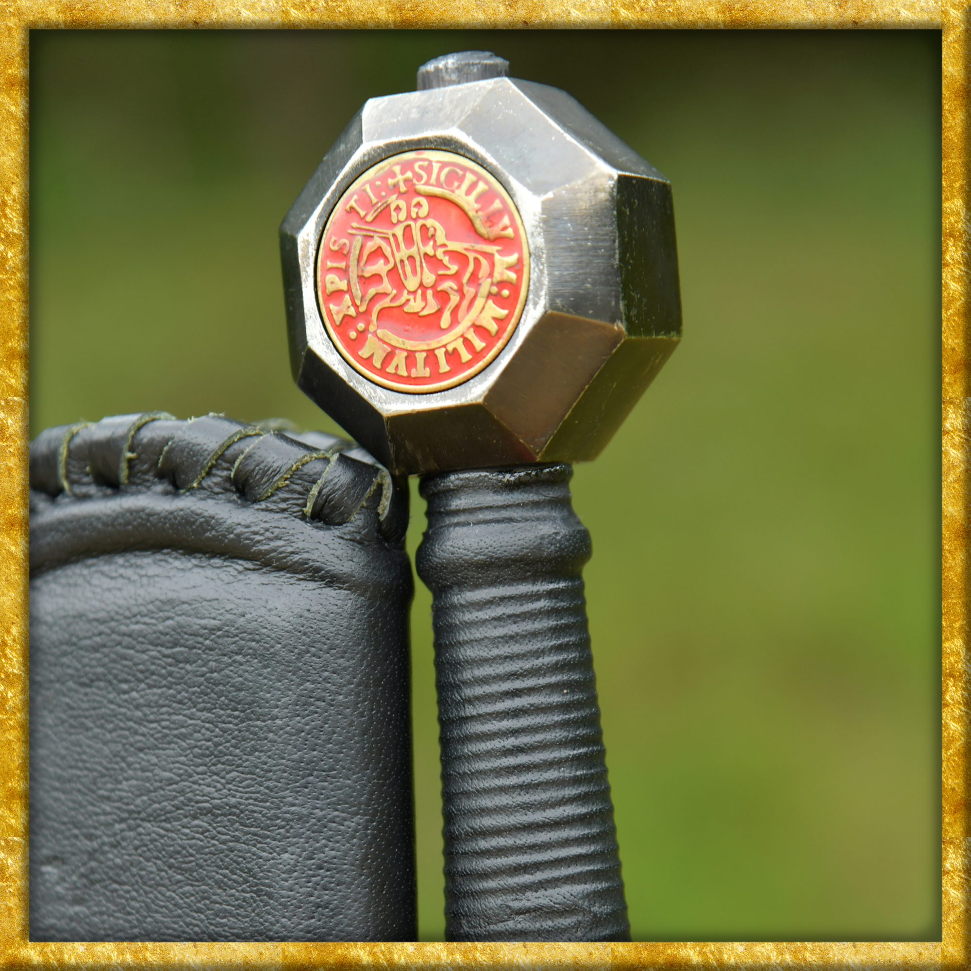Ein besonderes Detail ist der oktogonale Knauf. In seiner Mitte befindet sich ein rot emailliertes Wappen des Templerordens, das zwei Ritter auf einem Pferd zeigt. Umrahmt wird dieses Motiv von der lateinischen Inschrift MILITUM XPISTI SIGILLUM, was übersetzt Siegel der Soldaten Christi bedeutet.