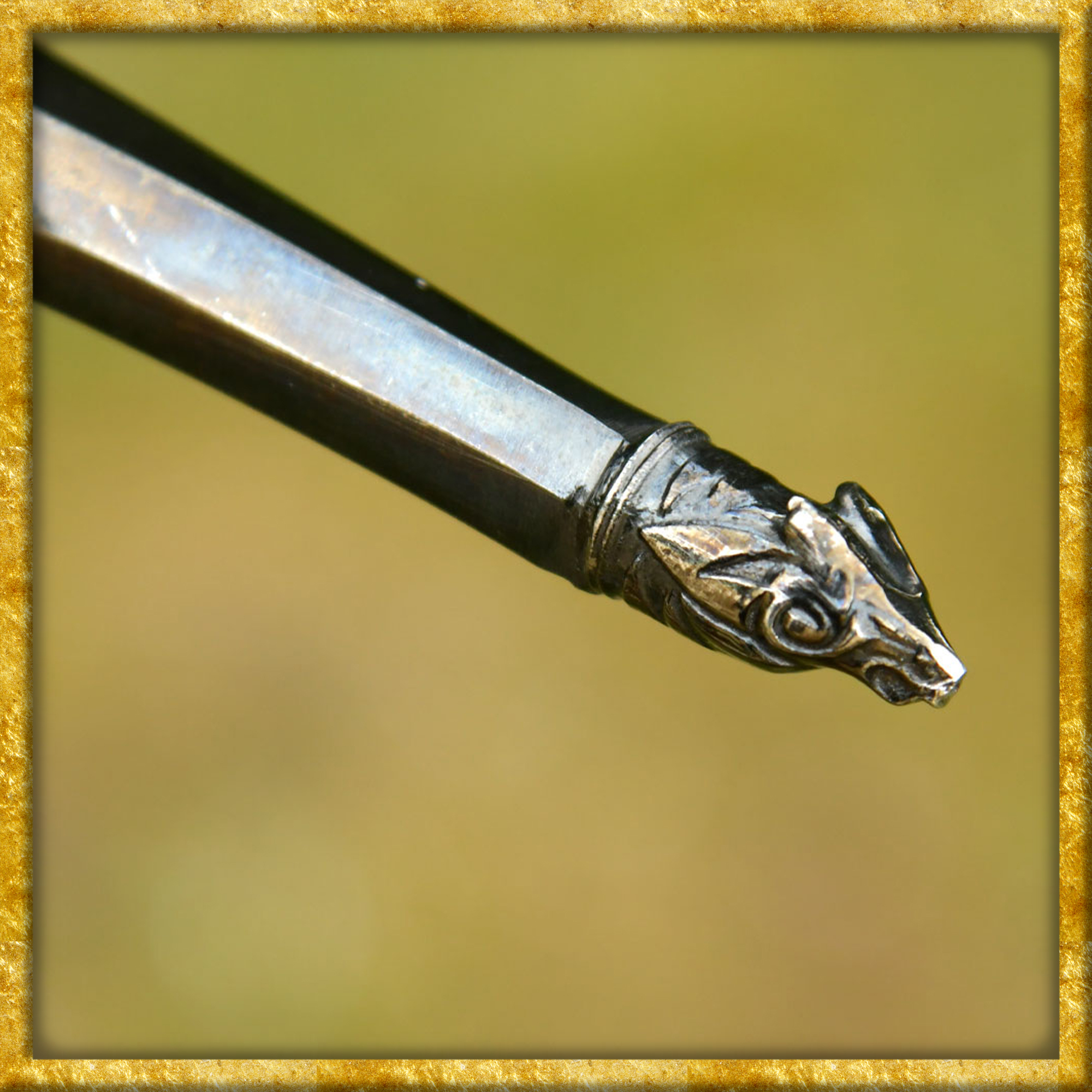 Der Zweihänder verfügt über ein mit schwarzem Leder umwickeltes Griffstück aus Holz, das einen angenehmen und sicheren Halt bietet. Parierstange und Knauf bestehen aus Stahl mit Antik-Finish. Die gerade Parierstange endet in stilisierten Wolfsköpfen, während ihre Mitte von einem silbernen Templerkreuz auf rot emailliertem Hintergrund geziert wird.