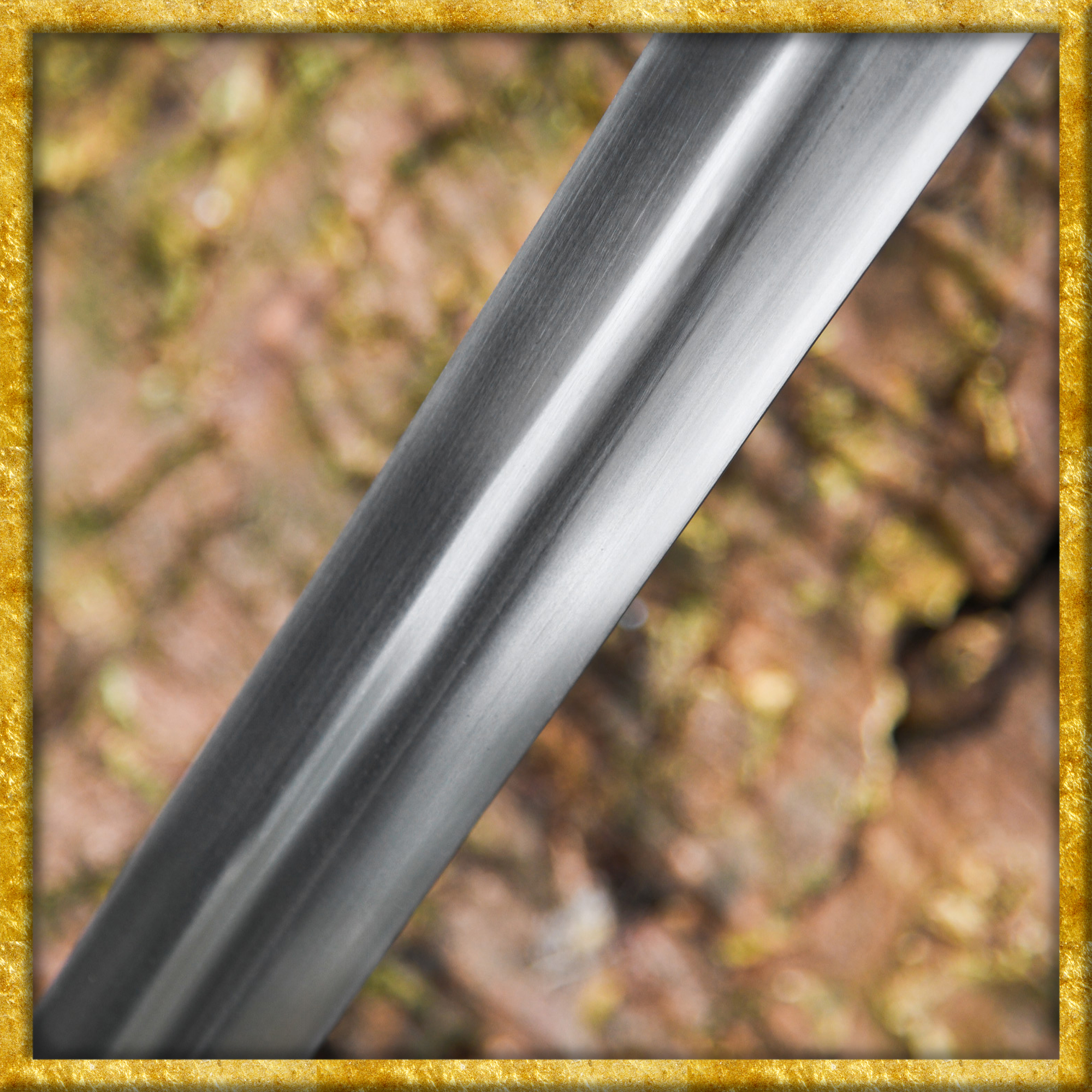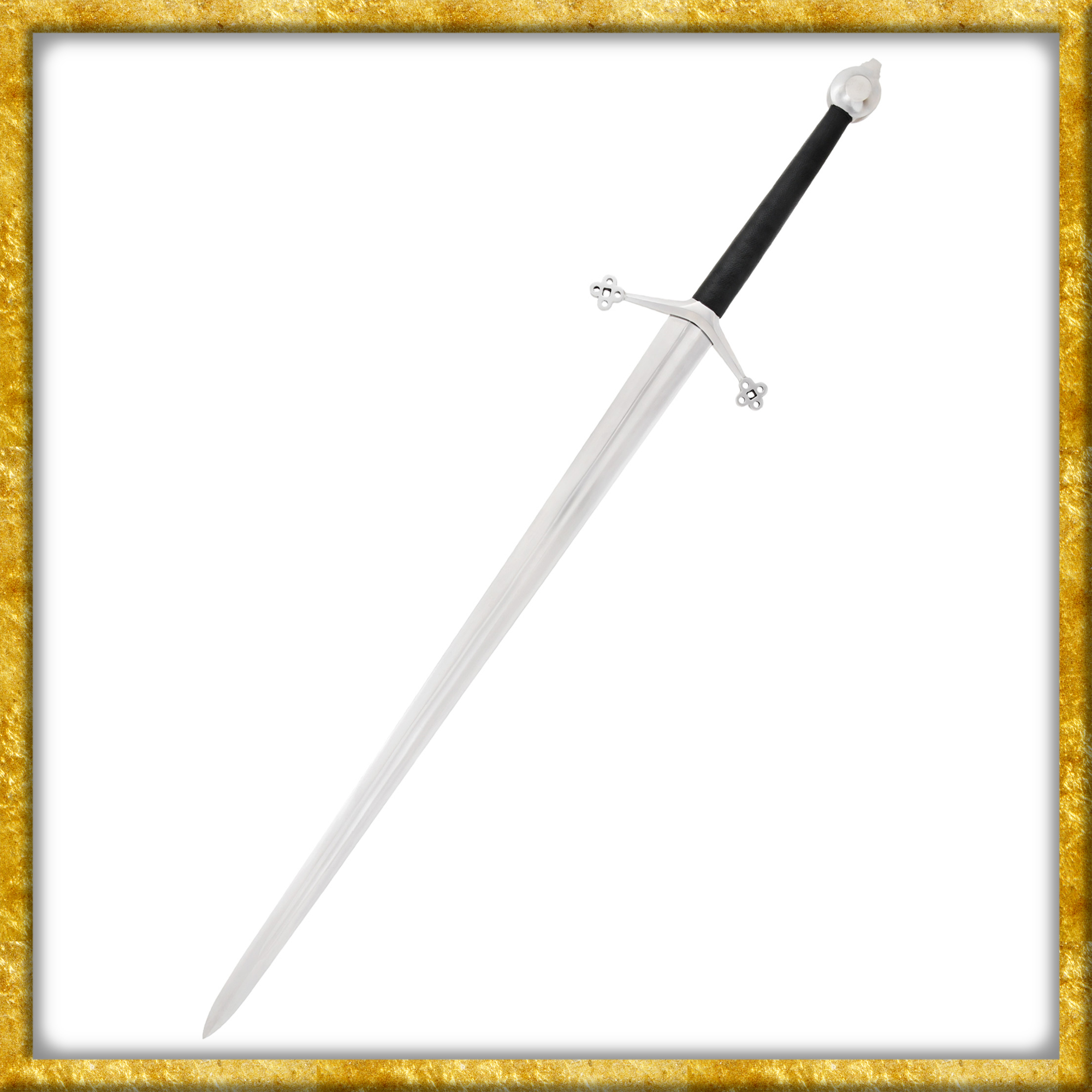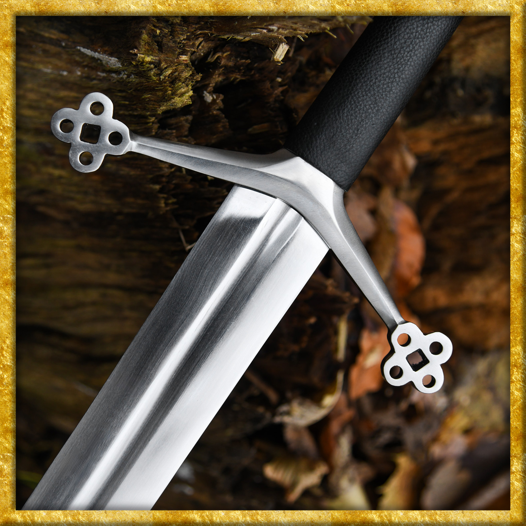 Die Klinge dieses schottischen Claymores wurde aus Karbonstahl handgeschmiedet. Das Schwert besitzt die für Claymore-Schwerter typische Parierstange mit Kleeblatt-Verzierungen. Die Klinge geht bis zum Griffende durch und ist dort mit dem Knauf verschraubt. Der Holzgriff hat eine schwarze Lederwicklung. Die Klinge ist nicht geschärft.