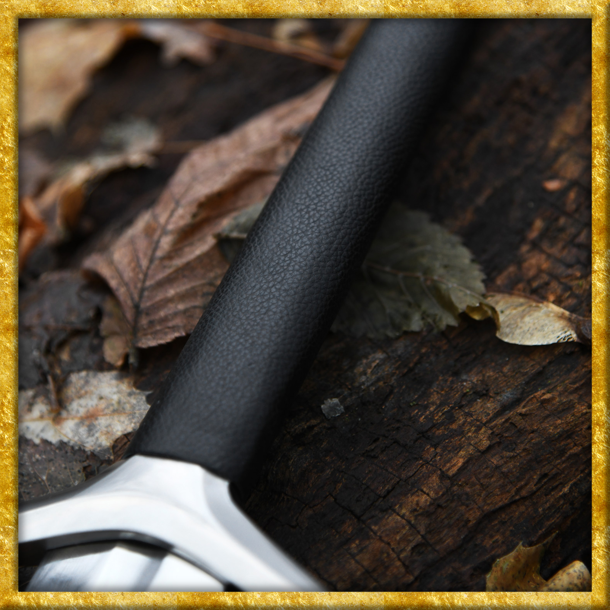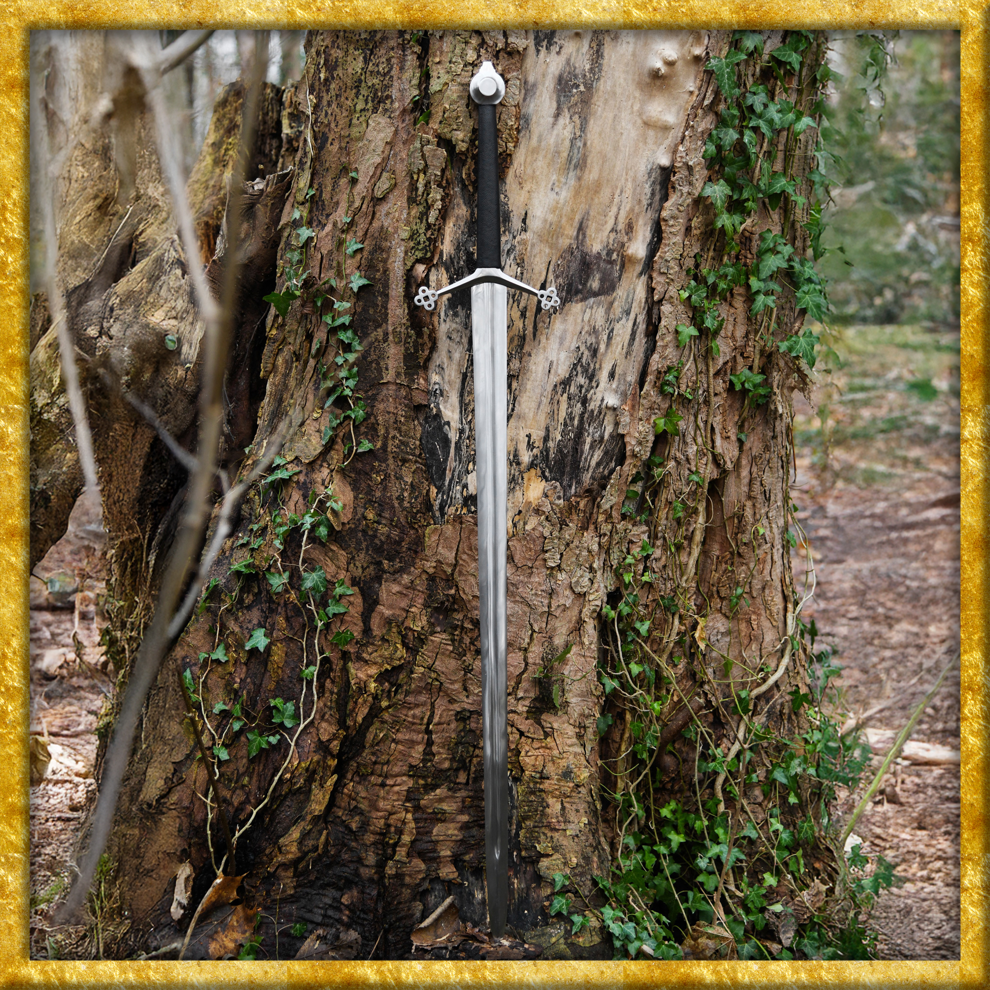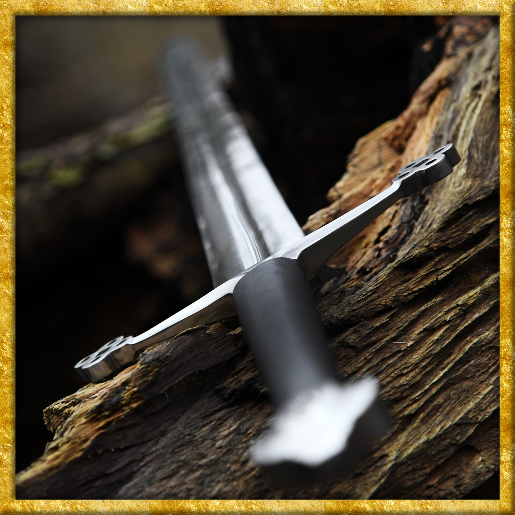 Die Klinge dieses schottischen Claymores wurde aus Karbonstahl handgeschmiedet. Das Schwert besitzt die für Claymore-Schwerter typische Parierstange mit Kleeblatt-Verzierungen. Die Klinge geht bis zum Griffende durch und ist dort mit dem Knauf verschraubt. Der Holzgriff hat eine schwarze Lederwicklung. Die Klinge ist nicht geschärft.