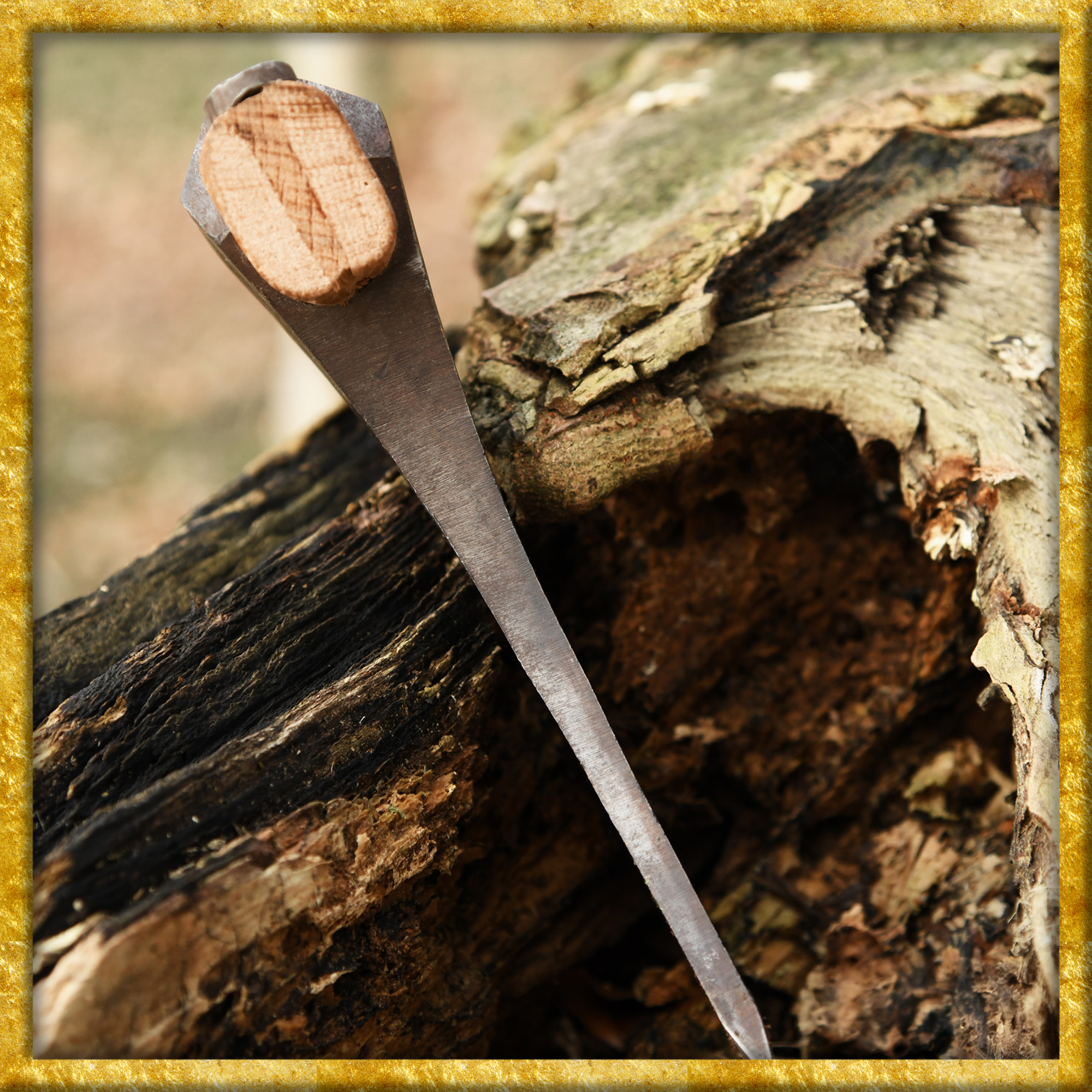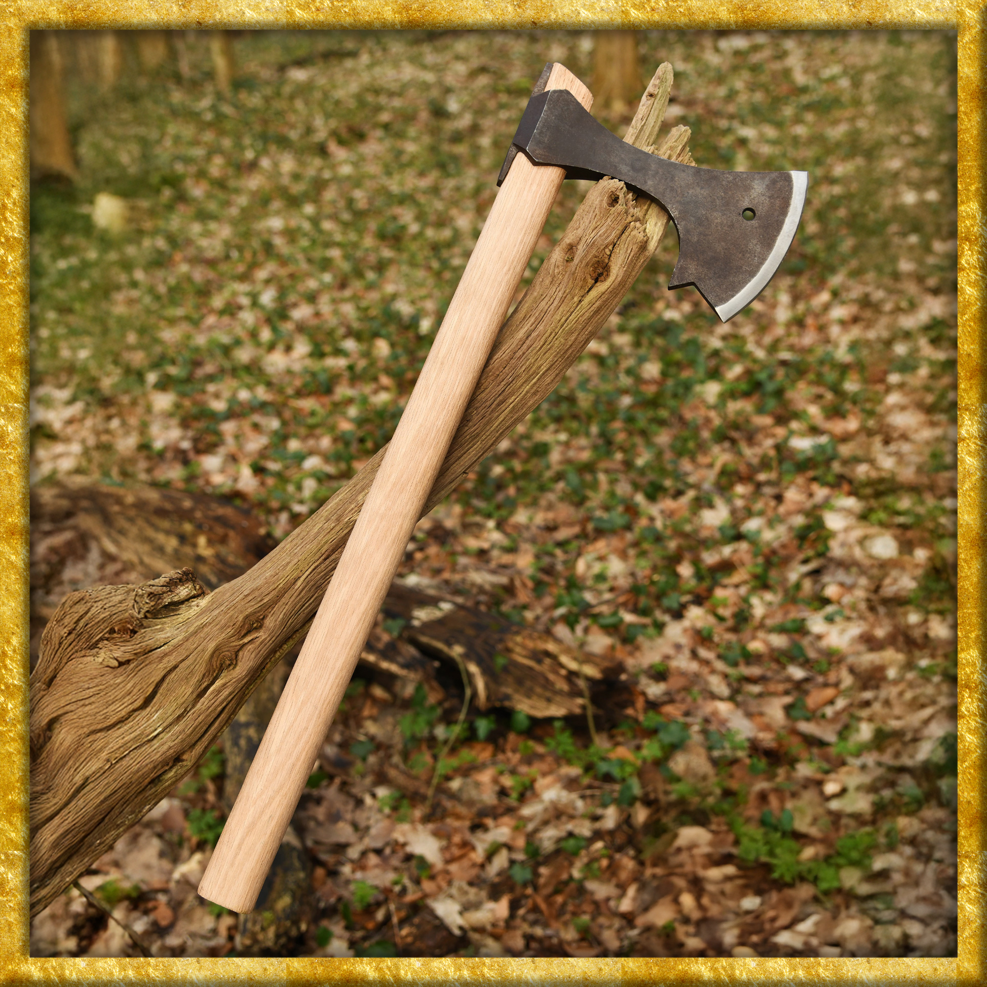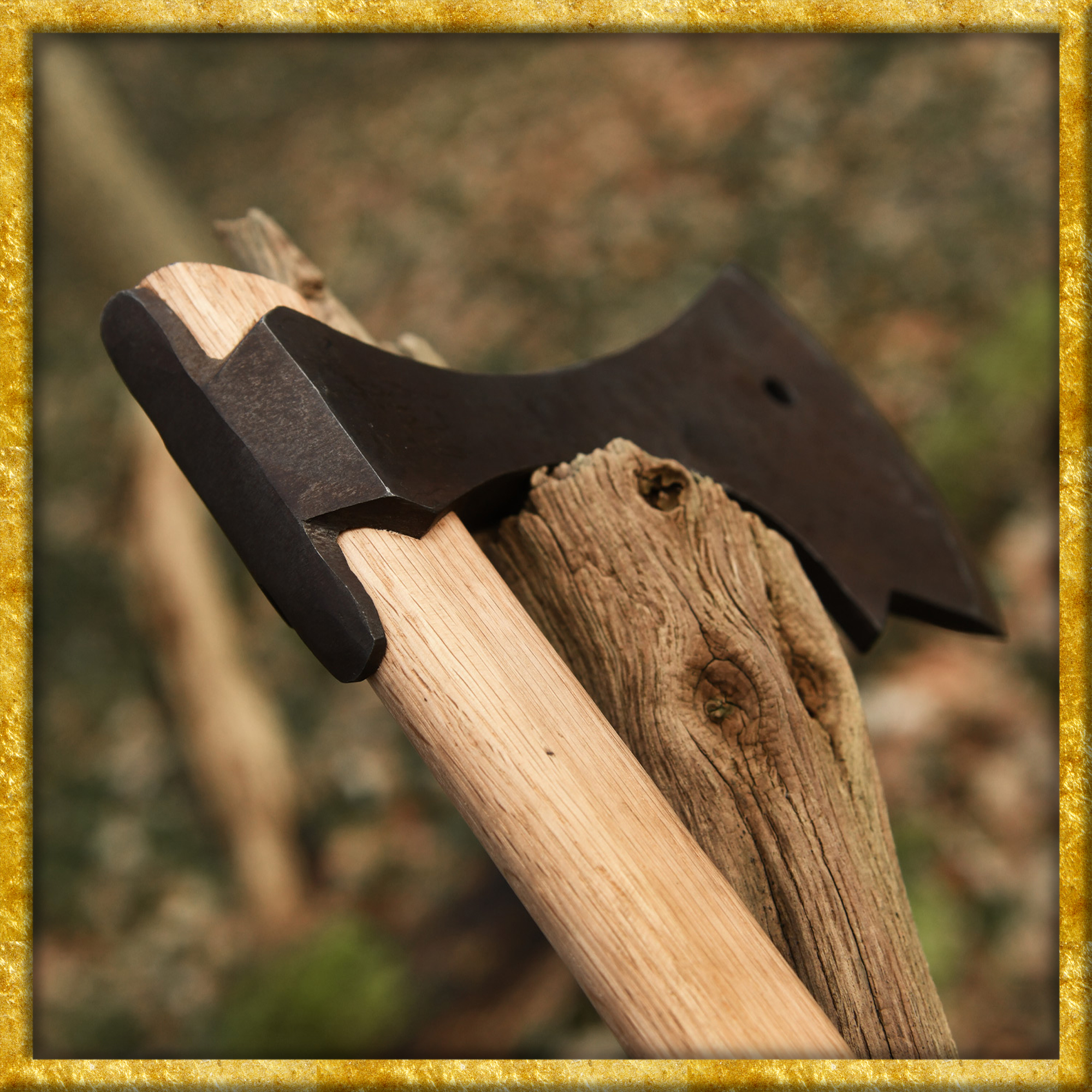 Die hochwertige Wikingeraxt die wir hier anbieten, wurde nach dem Vorbild eines archäologischen Fundes aus der schwedischen Insel Gotland gefertigt. Das Axtblatt ist aus Karbonstahl handgeschmiedet und auf einem Schaft aus bemaltem Holz montiert. Es wird darauf hingewiesen, dass die Schneide geschärft und voll funktionsfähig ist. Daher ist diese gotländische Wikinger-Axt für den Schaukampf nicht geeignet und nur als Sammlerstück bzw. Dekorationsobjekt konzipiert.