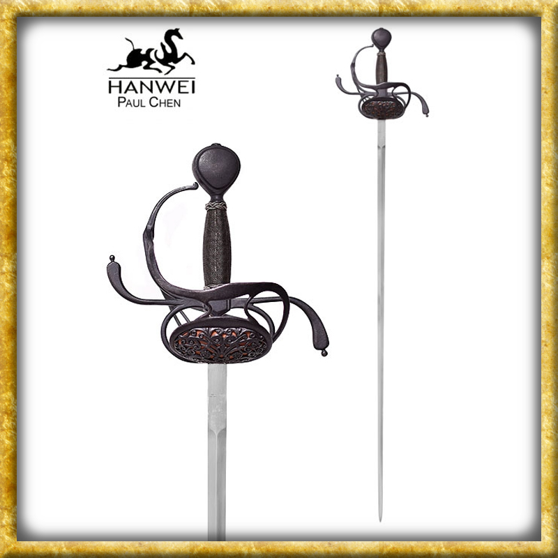 Die besondere Parierstange kann als Klingenfänger dienen, und der Griff ist mit verdrilltem Draht umwickelt. Da das Gefäss in genau derselben Größe angefertigt wurde wie die Originalvorlage, bietet es eine authentische Haptik und kommt auch im Hinblick auf Gewicht und Balance seinem Vorbild gleich. Die Klinge kann gegen die stumpfe Hanwei Trainingsklinge ausgetauscht werden, die für das sichere Sparring mit dem Rapier konzipiert wurde.