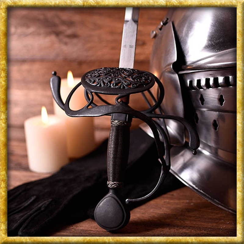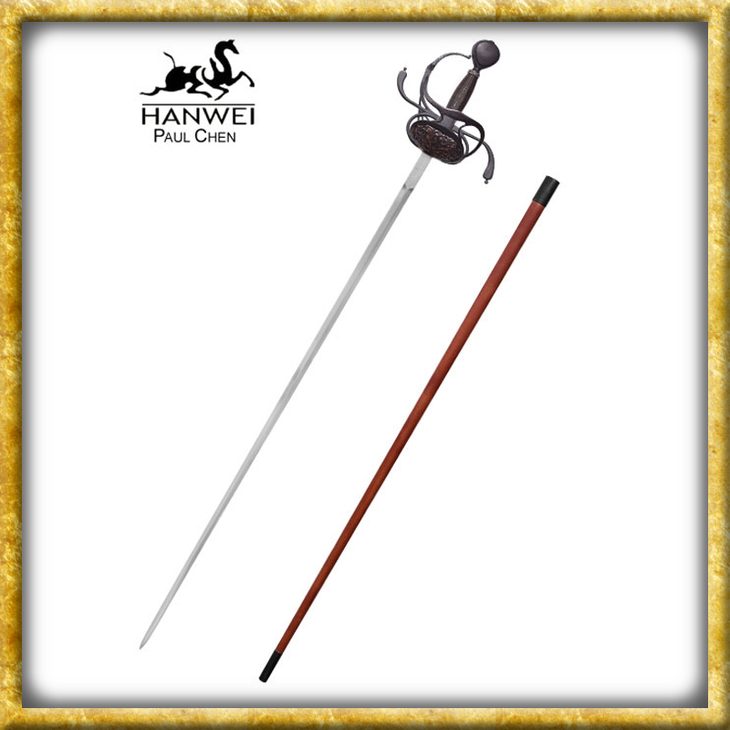 Dieses hervorragend austarierte Hanwei Rapier in der Antikversion ist eine Nachbildung der Waffe des grossen Königs Gustav II. Das Stichblatt dieses Rapiers ist zwar ungewöhnlich, aber höchst effektiv. Das Rapier verfügt über klassische Linien. Die Klinge ist aus flexibel gehärtetem Karbonstahl. Im Sinne eines geringen Pflegeaufwands ist das Heft aus rostfreiem Stahl hergestellt.