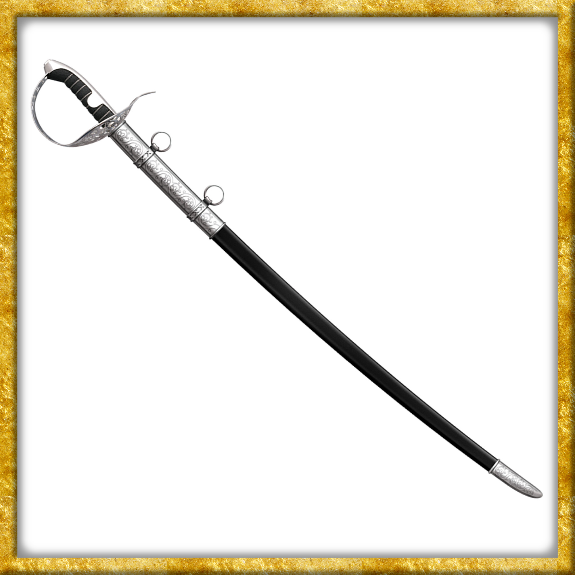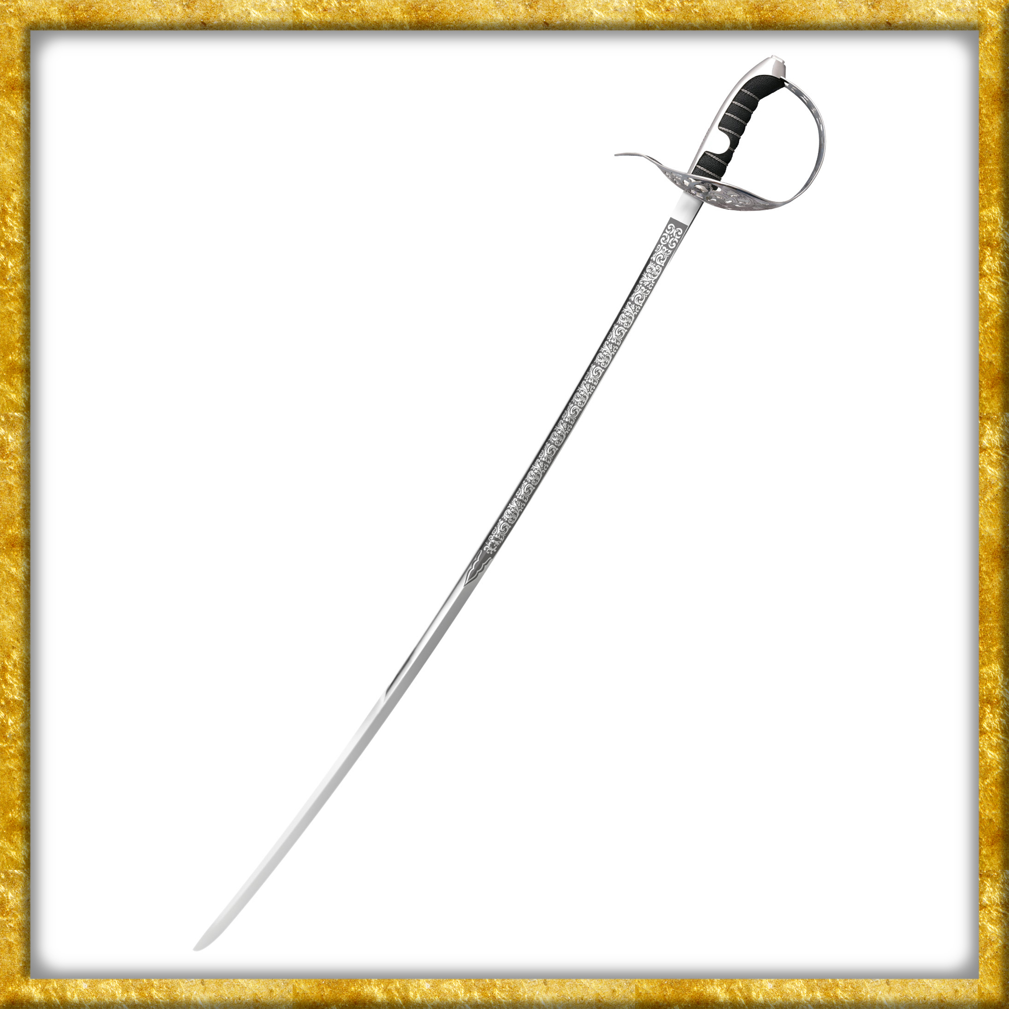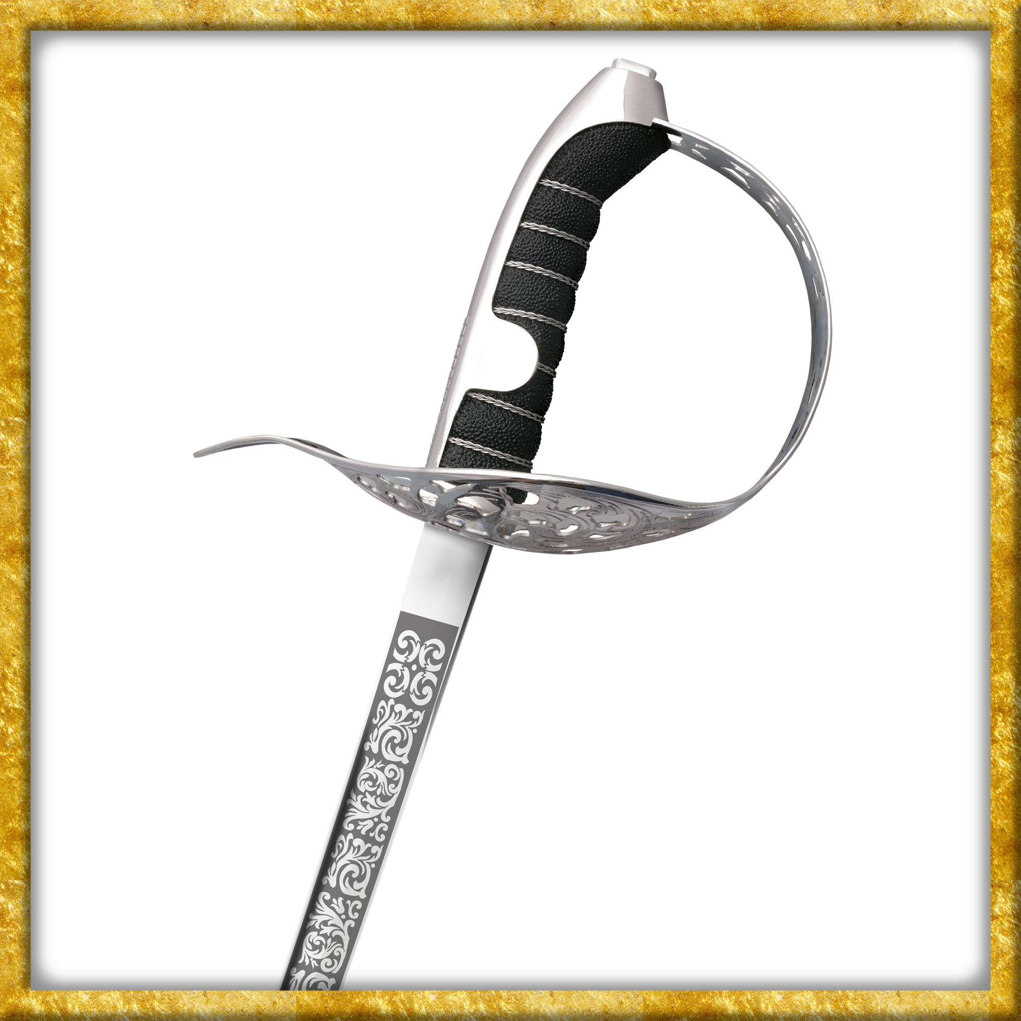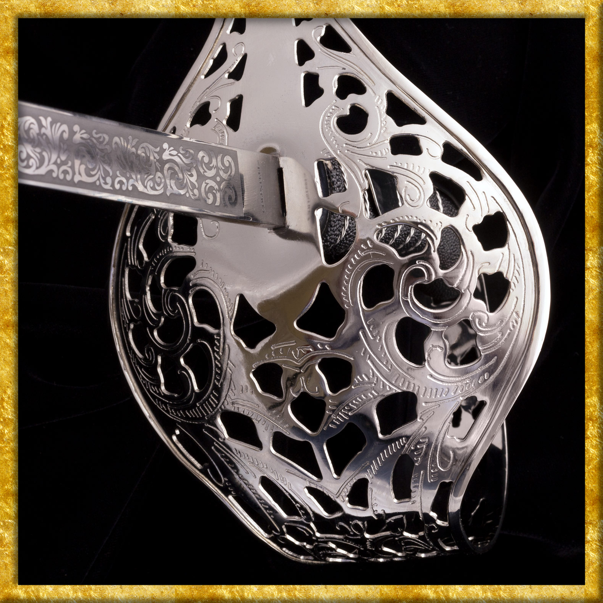 Das raffiniert durchbrochene Stichblatt aus blank poliertem Nickelstahl hat verstärkte gerollte Kanten und sorgt für unübertroffenen Schutz von Hand und Unterarm. Die wunderschöne Scheide aus kräftigem, schwarzem Leder ist mit zwei Tragringen ausgestattet. Mundblech und Ortband wurden auf Hochglanz poliert und mit Zierätzungen versehen.