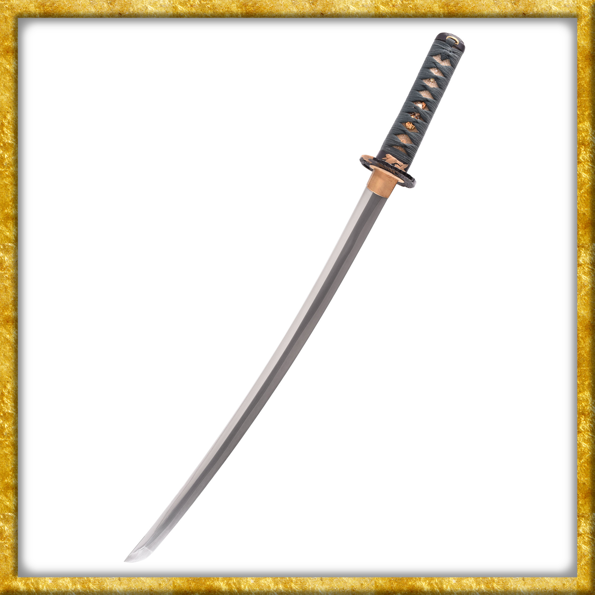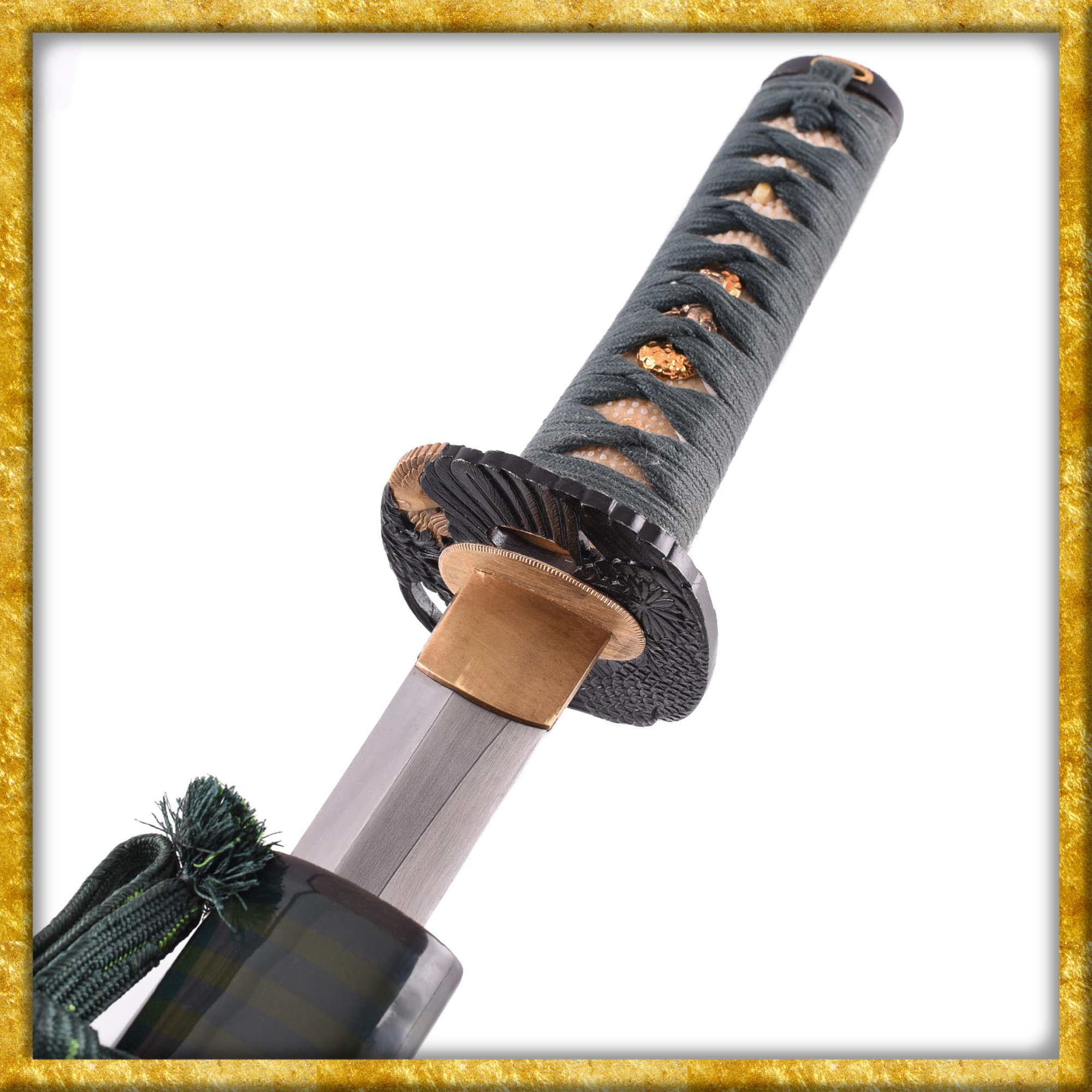 Das Hunter Wakizashi besitzt eine L6/Bainit-Klinge im Shinogi Zukuri-Stil und eine ausgezeichnete Koshirae, was es zu einem begehrten und äusserst funktionellen Stück macht. Die gedeckte grüne Seiden-Ito und gestreifte grüne Saya ergänzen die geschwärzte Eisen-Tsuba mit ihren goldenen Akzenten, welche einen jagenden Raubvogel zeigt.