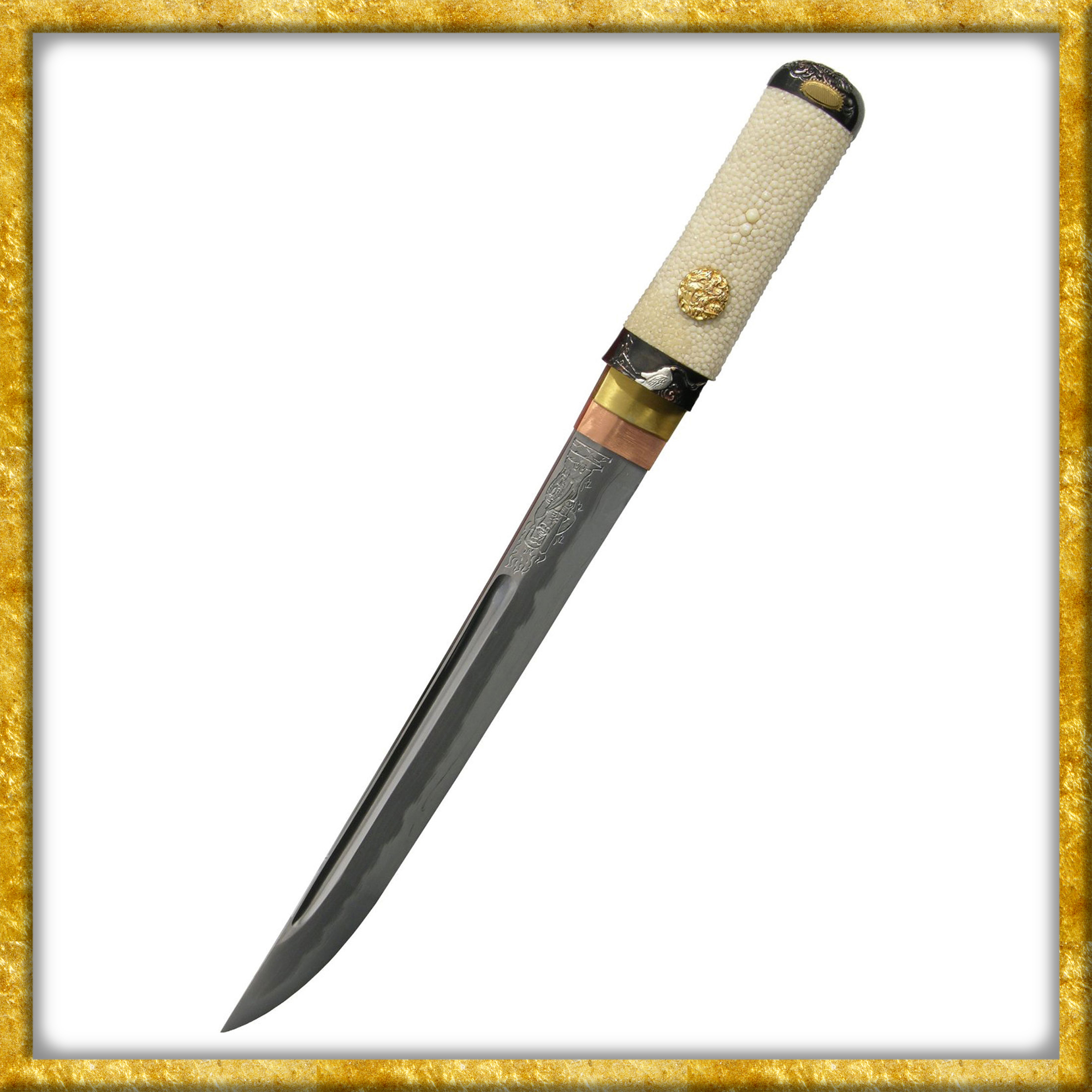 Für die Tsuka wurde Rochenhaut höchster Qualität verwendet, und das Sageo ist aus hochwertiger japanischer Seide gewebt. Fuchi, Kashira, Kojiri, Koiguchi und Kurigata bestehen alle aus geschwärzter Bronze mit Reliefdekor und einzelnen Details in Kupfer, Silber und Gold. Die Fuchi zeigt die Wächtergeister der Shinto-Religion.
