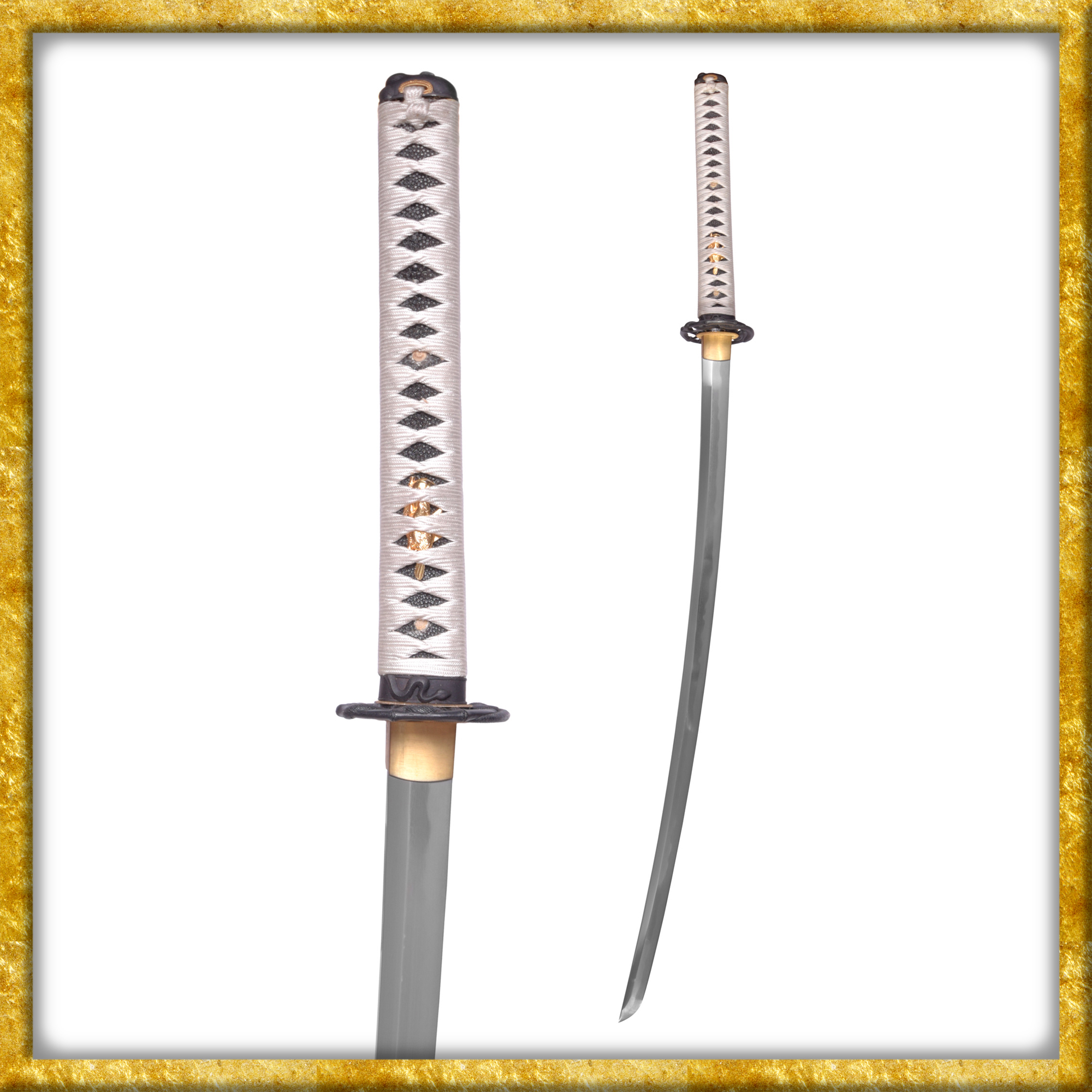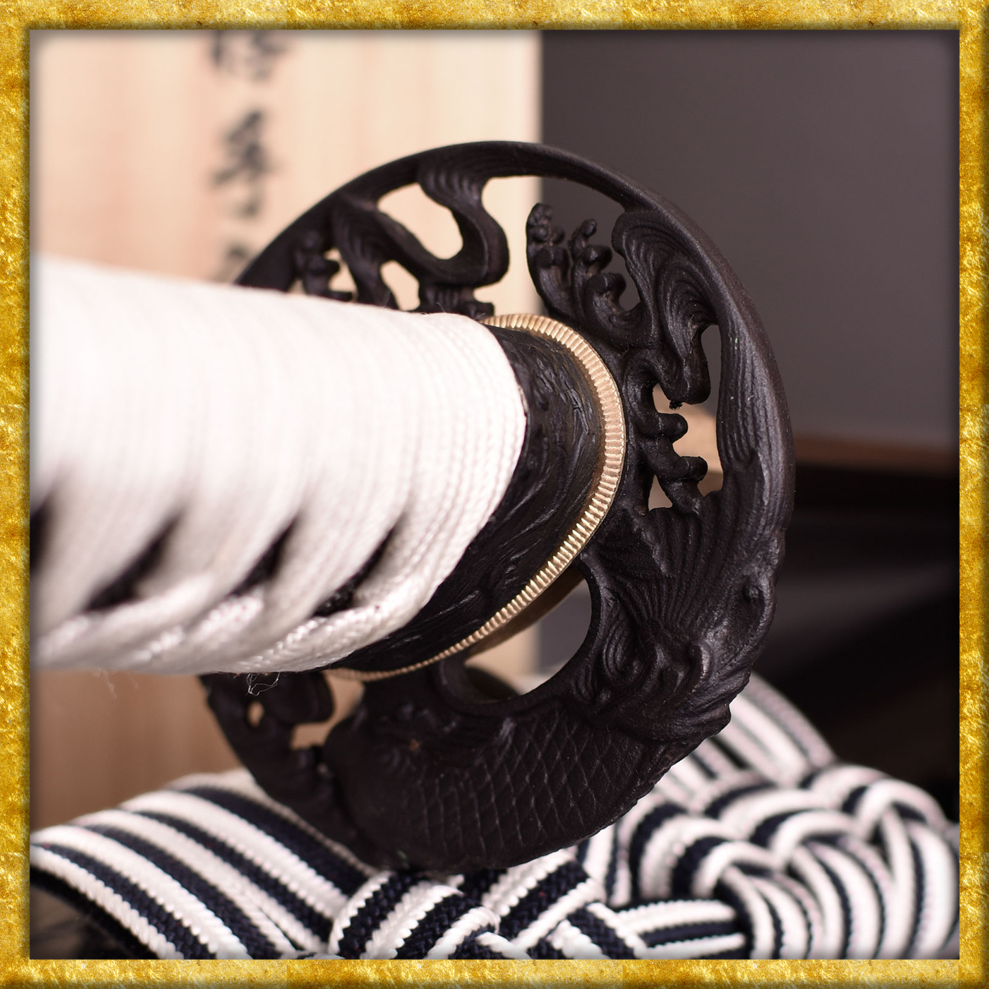 Dieses Samuraischwert besitzt eine schwarz-weisse Montur und einen schwarzen Rochenhaut-Überzug an der Tsuka. Die Tsuka-Ito ist aus hochwertiger weisser Baumwolle aus Japan hergestellt. Ein fein gearbeitetes Koi-Motiv ziert die geschwärzte Eisen-Tsuba von beiden Seiten. Die prächtigen Beschläge sind antik aufbereitet, was der Ästhetik des Stückes zugutekommt.