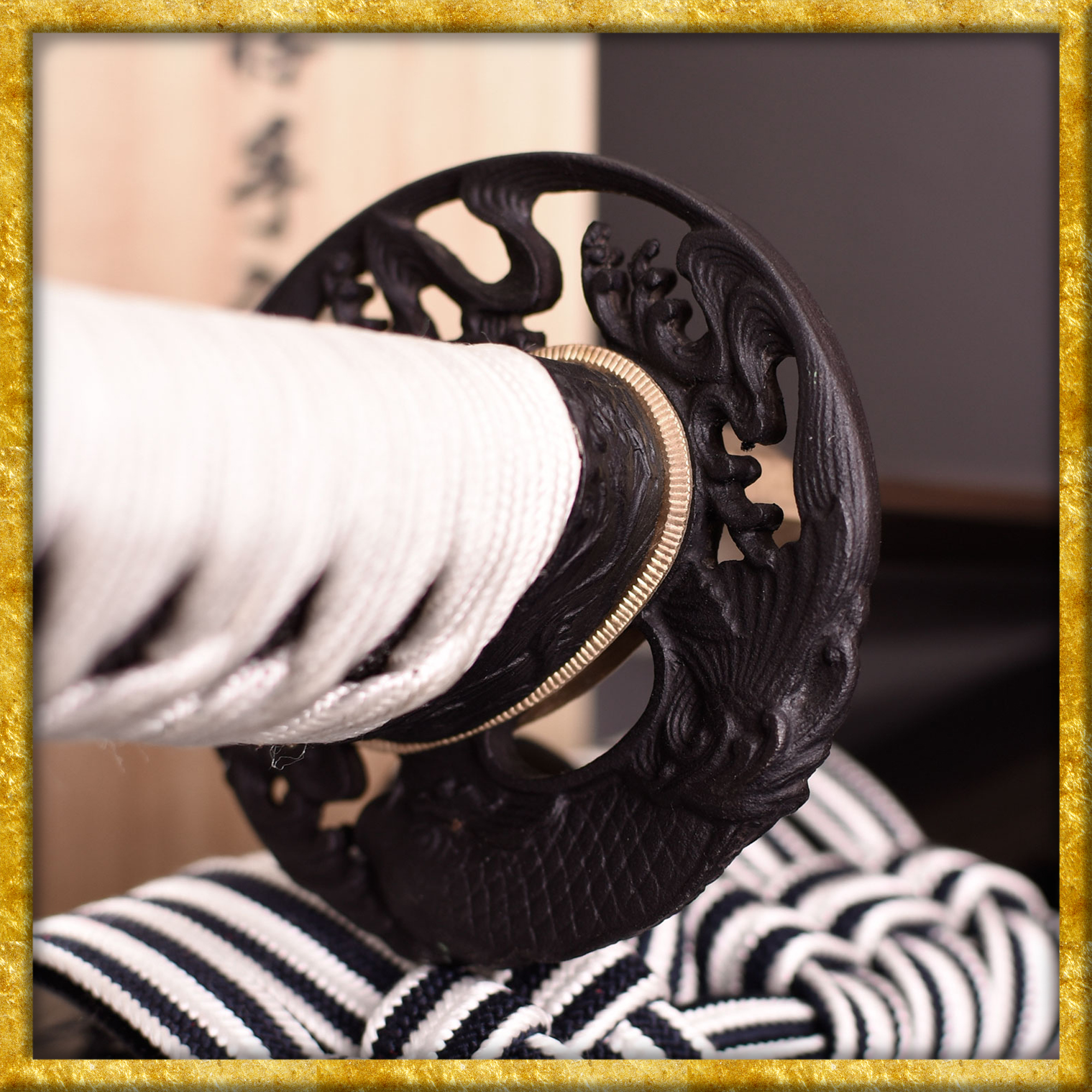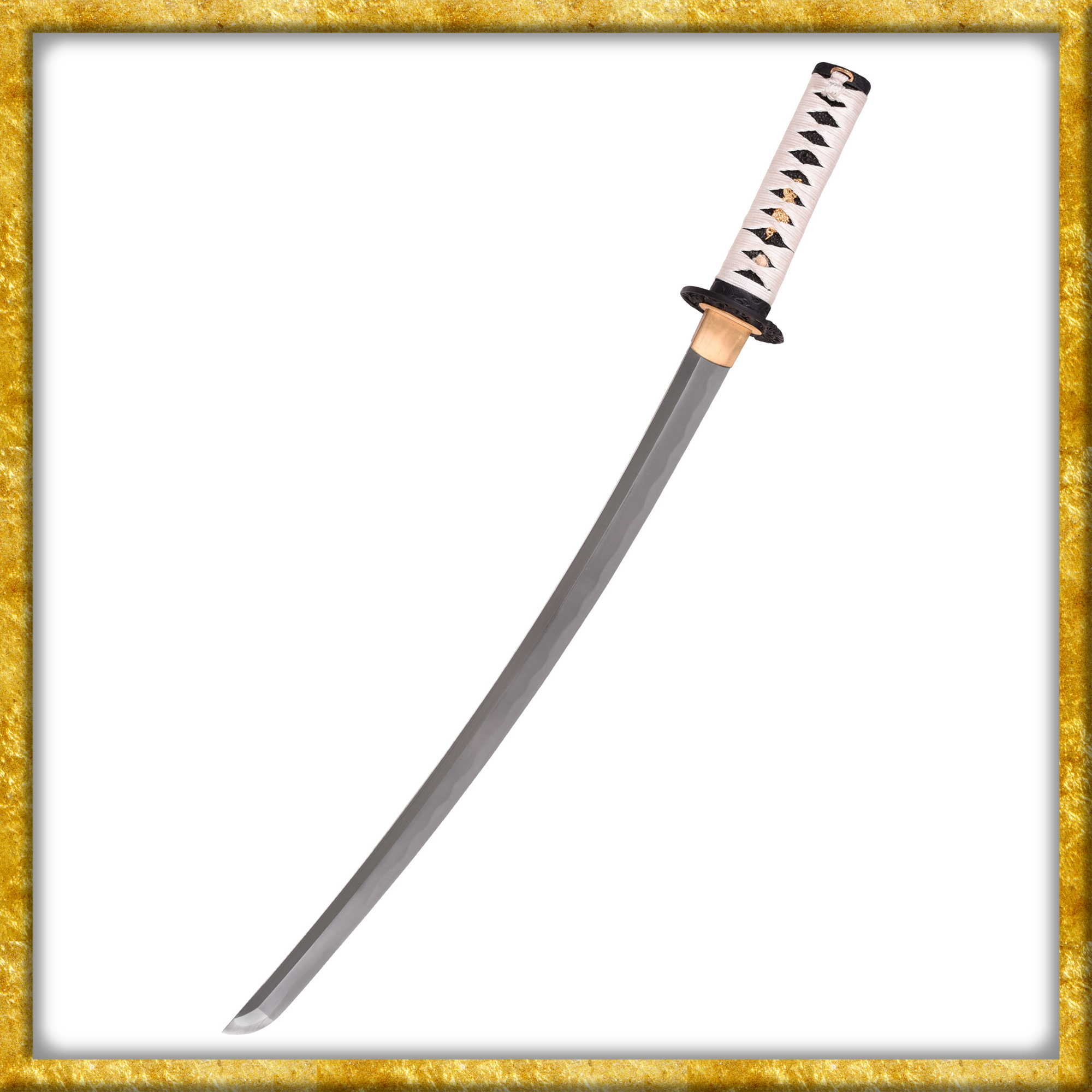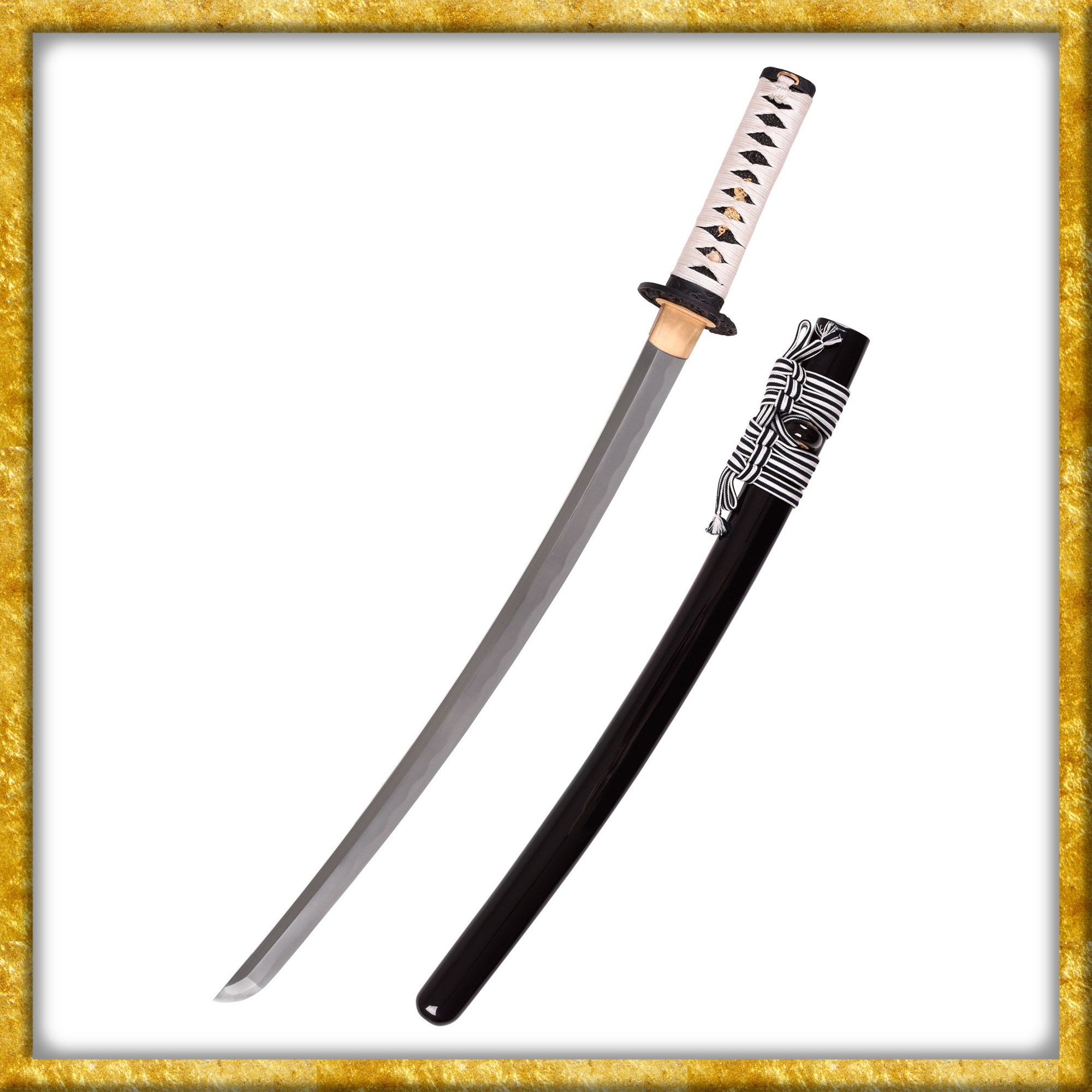 Dieses Samuraischwert besitzt eine schwarz-weisse Montur und einen schwarzen Rochenhaut-Überzug an der Tsuka. Die Tsuka-Ito ist aus hochwertiger weisser Baumwolle aus Japan hergestellt. Ein fein gearbeitetes Koi-Motiv ziert die geschwärzte Eisen-Tsuba von beiden Seiten. Die prächtigen Beschläge sind antik aufbereitet, was der Ästhetik des Stückes zugutekommt.