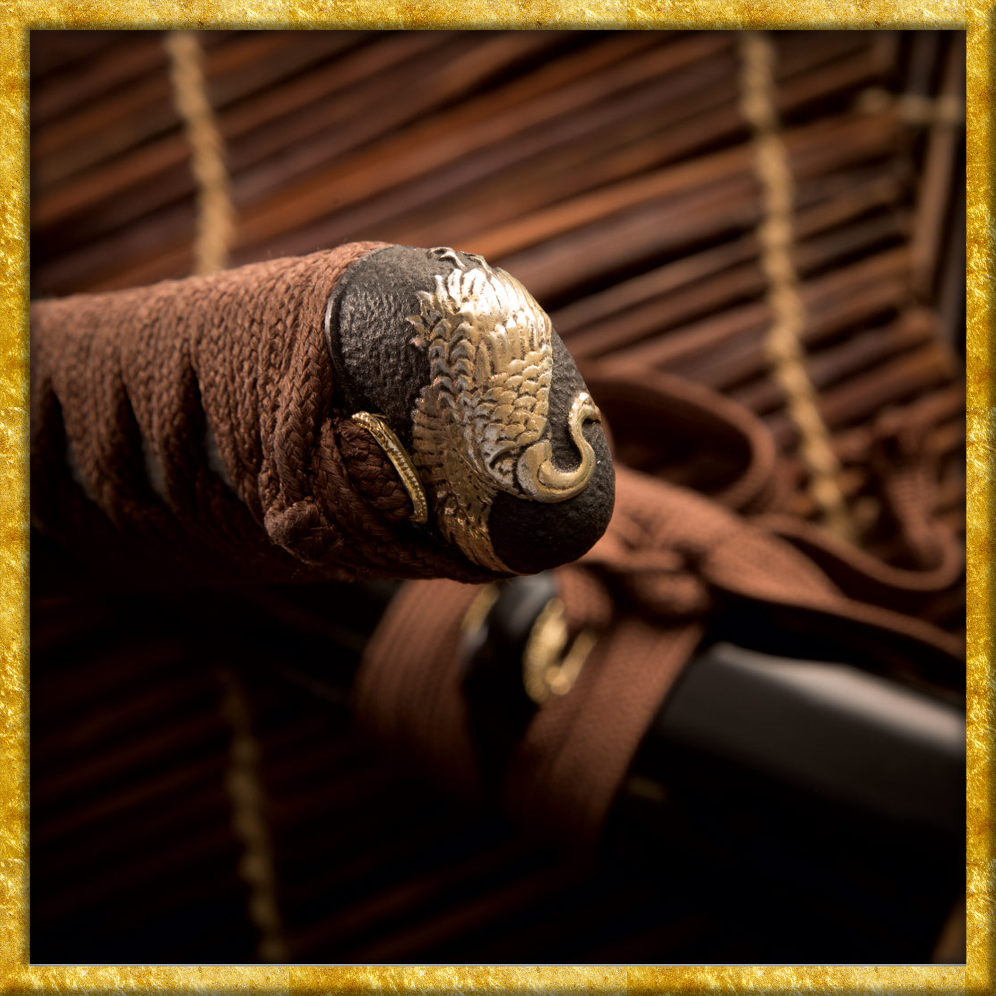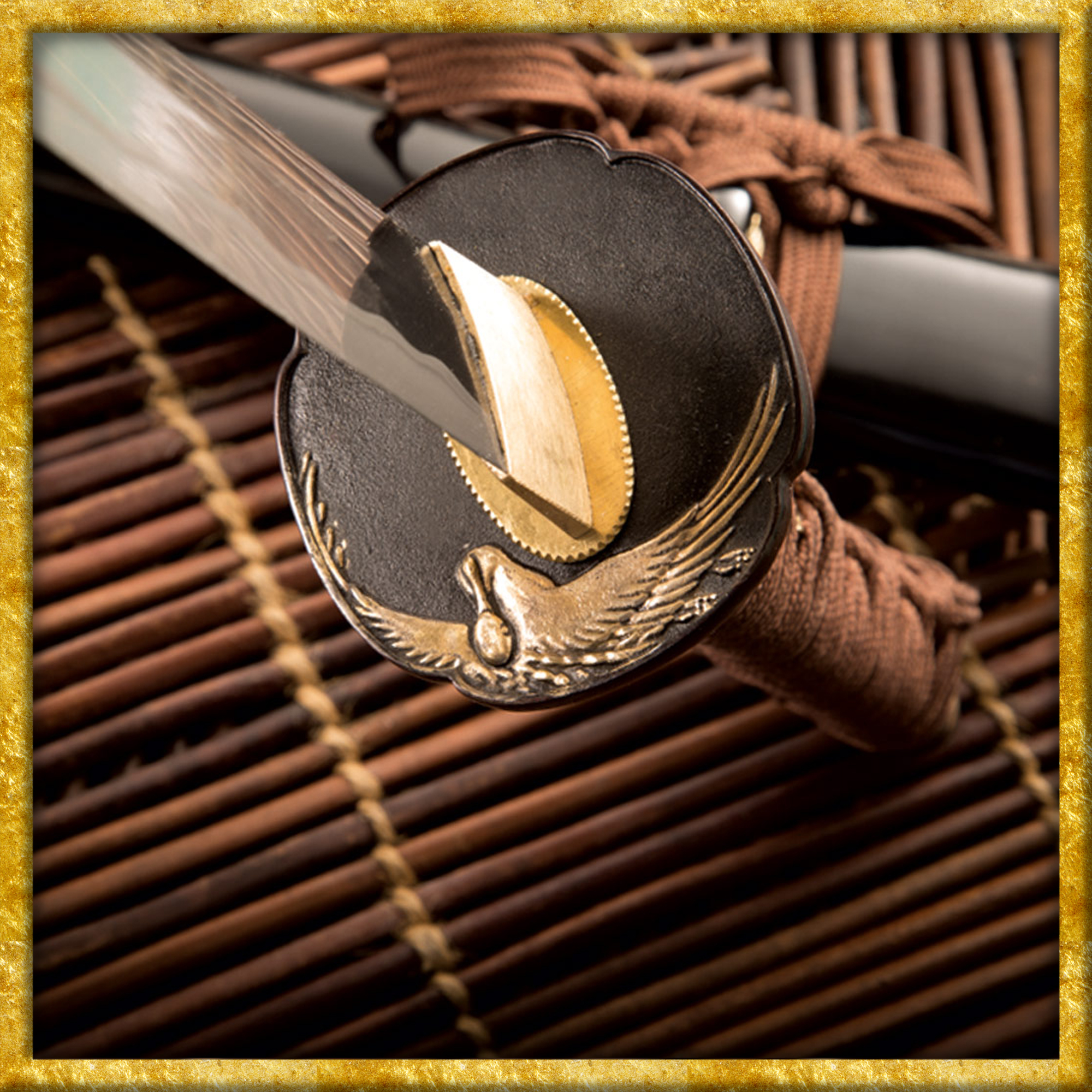 Tsuba und Menuki sind mit einem Motiv des symbolträchtigen Kranichs verziert, und der mit hochwertiger Rochenhaut bezogene Griff ist mit brauner Seidenkordel fest umwickelt. Dies sorgt für noch mehr Detailtiefe und verleiht dem Schwert eine unfassbar schöne Optik.