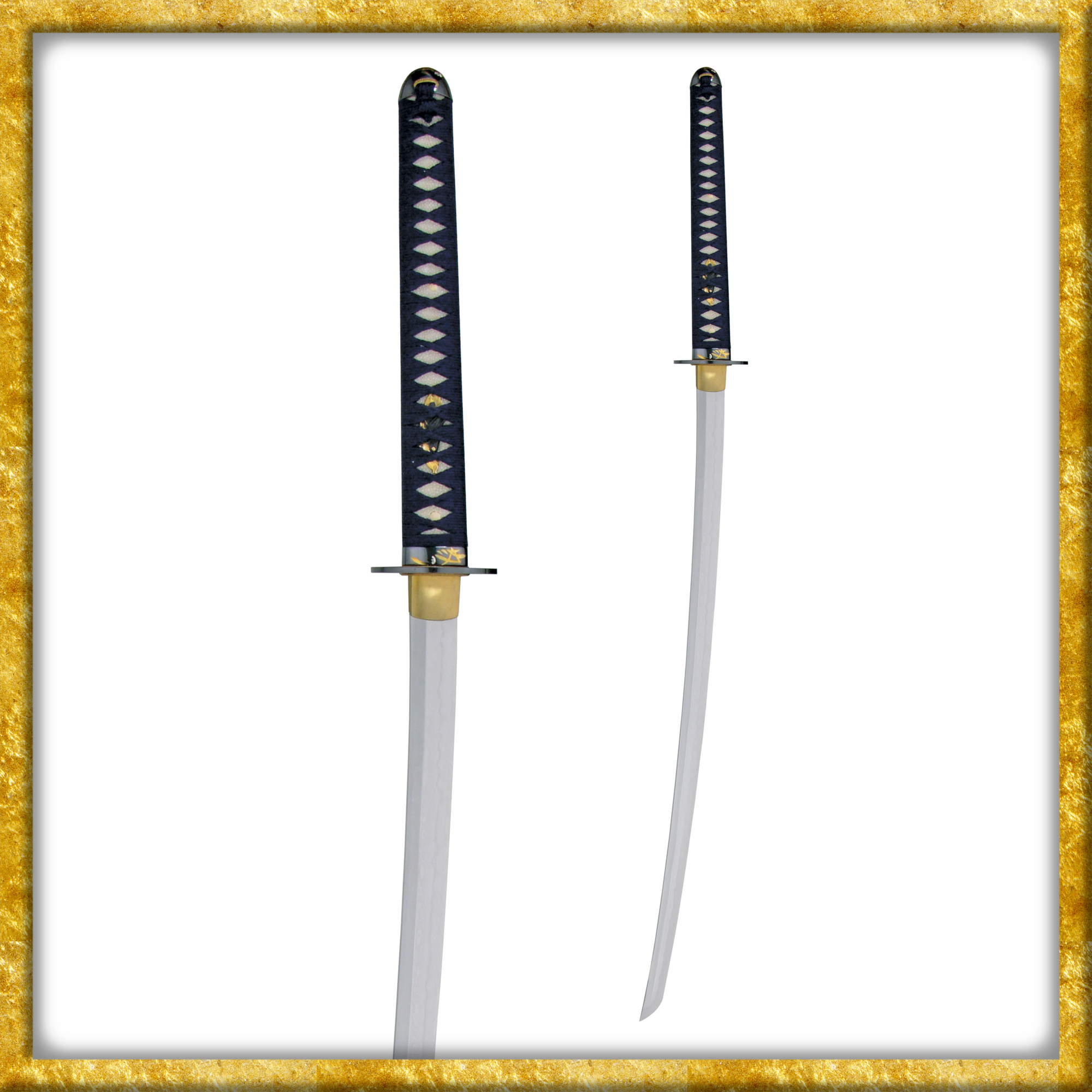 Die Saya ist dunkelblau lackiert, Koiguchi und Kurikata bestehen aus Büffelhorn. Fuchi, Kashira und Kojiri sind aus mit Bronze beschichtetem Eisen mit silbernen und goldenen Details. Das Habaki wurde aus Messing in einem Stück gefertigt.