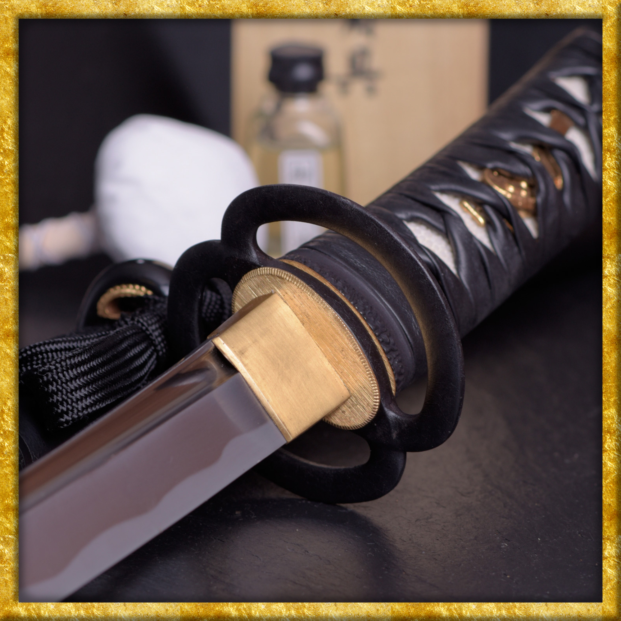 Passend zu Hanweis Musashi Katana ist das Wakizashi in Schwarz gehalten und besitzt eine strukturierte, strapazierfähige Saya. Die Tsuka-Ito besteht aus Leder und ist über Rochenhaut gewickelt. Die Karbonstahlklinge ist handgeschmiedet und an der Schneide gehärtet, um eine ausgeprägte Härtelinie zu erzeugen.