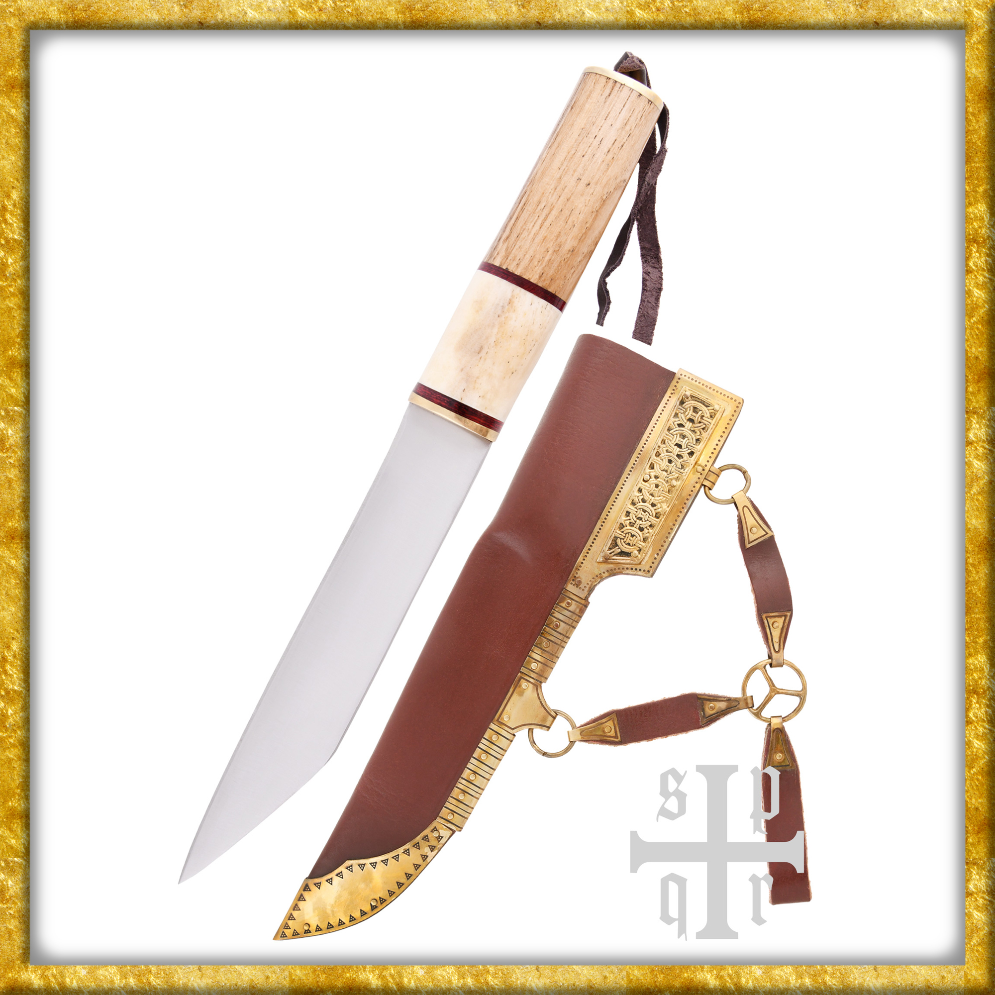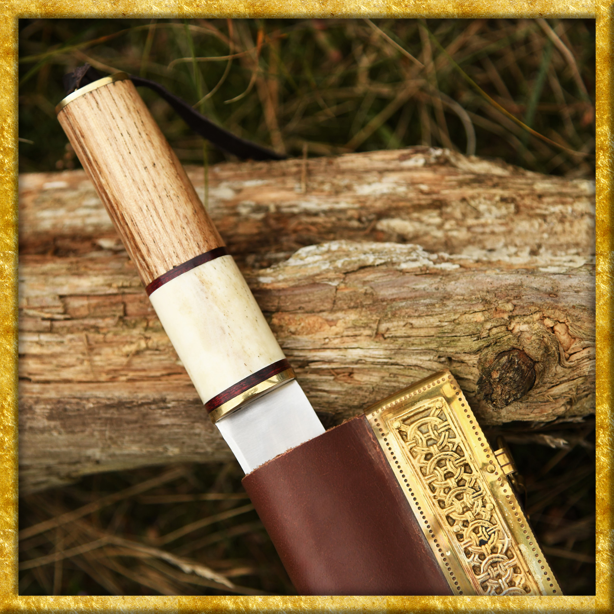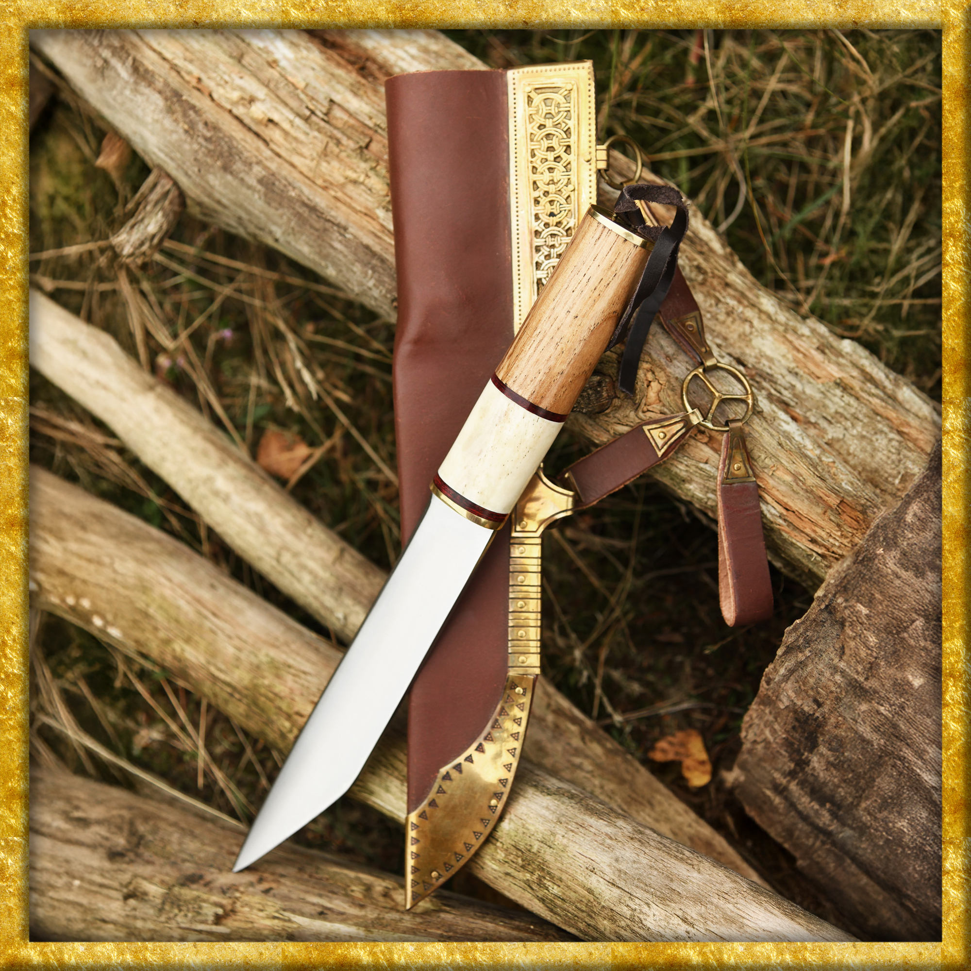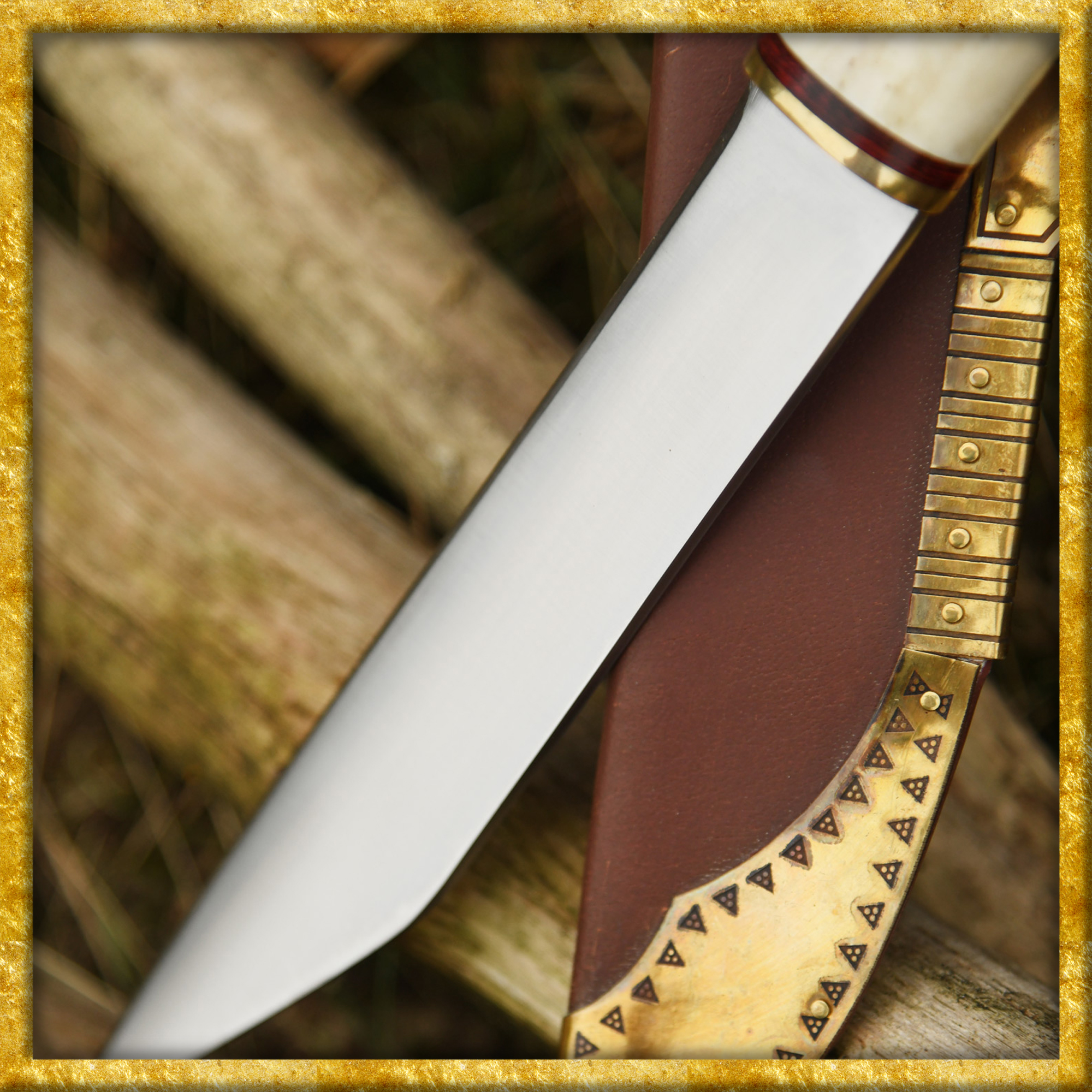 Dieses handgefertigte wikingerzeitliche Saxmesser, aufgrund seiner besonderen Klingenform auch broken back Sax genannt, besitzt eine scharfe Klinge aus Kohlenstoffstahl und einen Griff aus Holz und Knochen mit Zwinge und Endkappe aus Messing. Die Kappe besitzt eine praktische Öse zur Aufnahme eines Tragebands oder zum bequemen Herausziehen des Messers aus der Scheide.