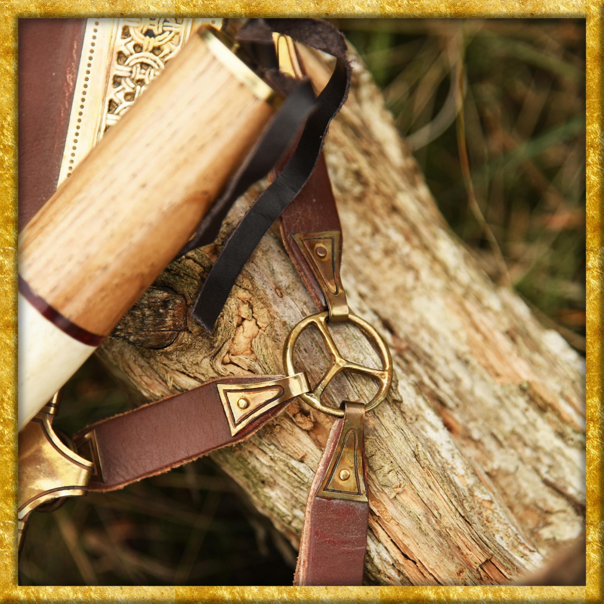Der Kurzsax kommt samt wunderschöner Scheide aus vegetabil gegerbtem, von Hand gefärbtem Leder mit reich verzierten Messingbeschlägen. Das Tragesystem besteht aus zwei Tragringen, einem Riemenverteiler und drei Lederriemen.