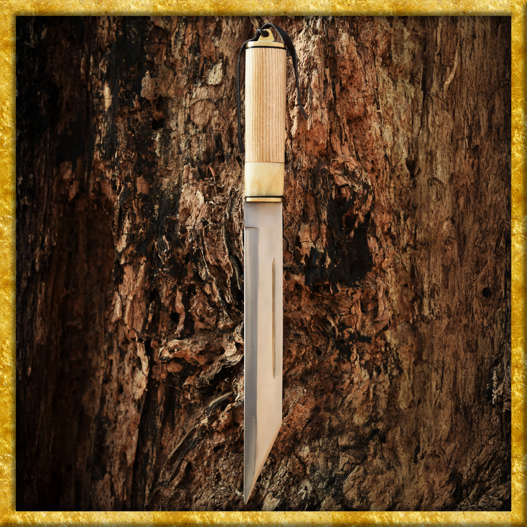 Dieses broken back Saxmesser besitzt eine Klinge aus Kohlenstoffstahl. Zur Klinge hin schliesst der Holzgriff mit einer Lage aus Knochen und einer Zwinge aus Messing ab. Die Griffkappe mit praktischer Fangriemenöse ist ebenfalls aus Messing gefertigt.