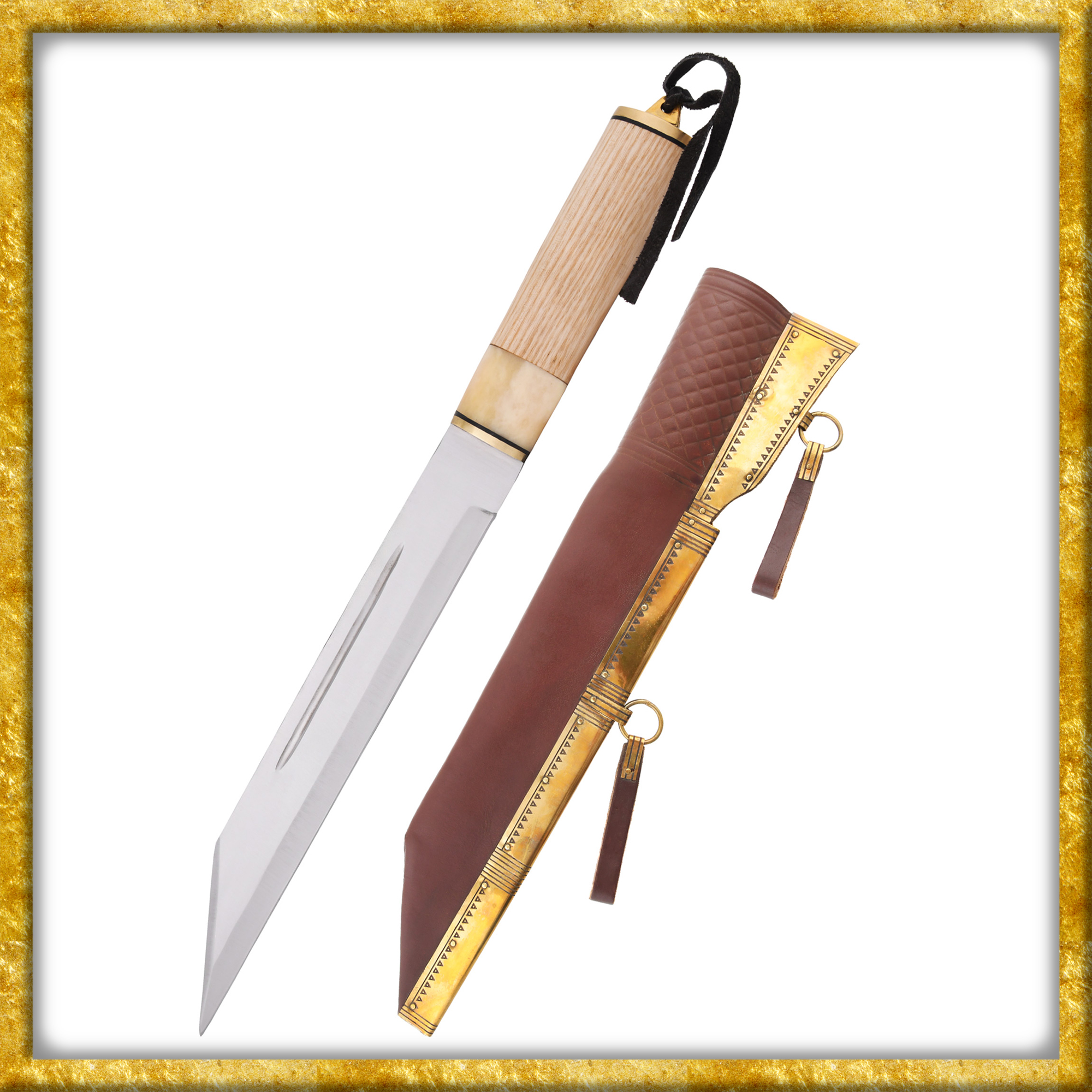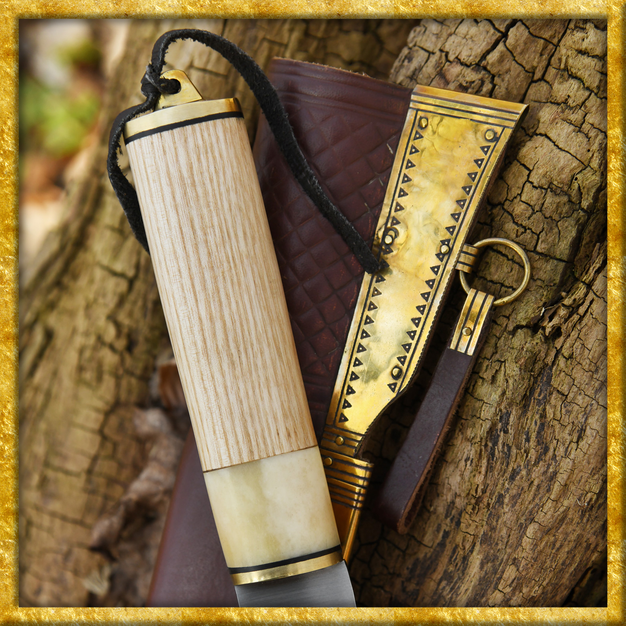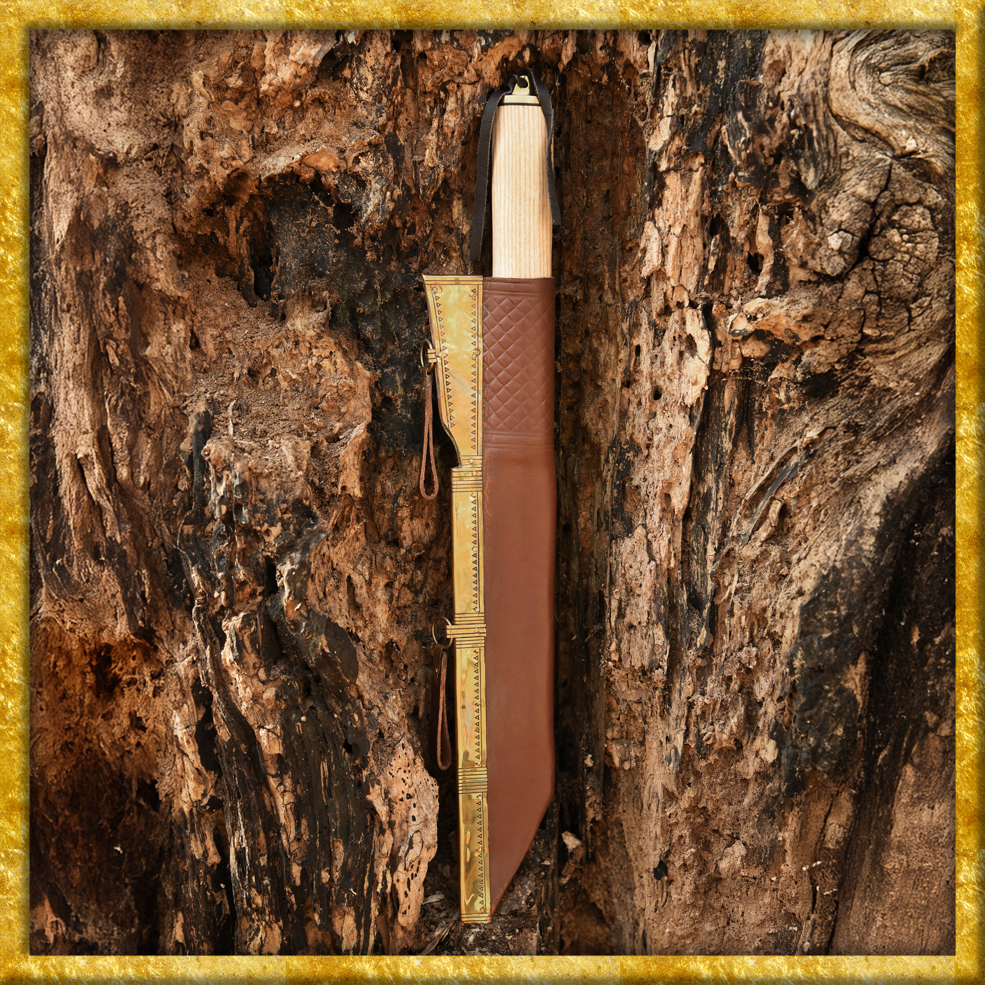 Die wunderschöne Scheide aus Leder ist mit Messingbeschlägen reich verziert. Dank zweier an Messingringe angebrachten Lederschlaufen lässt sich der Sax im typischen Wikingerstil horizontal am Gürtel tragen. Dieser Skramasax ist als Sammlerstück bzw. Dekorationsobjekt konzipiert.