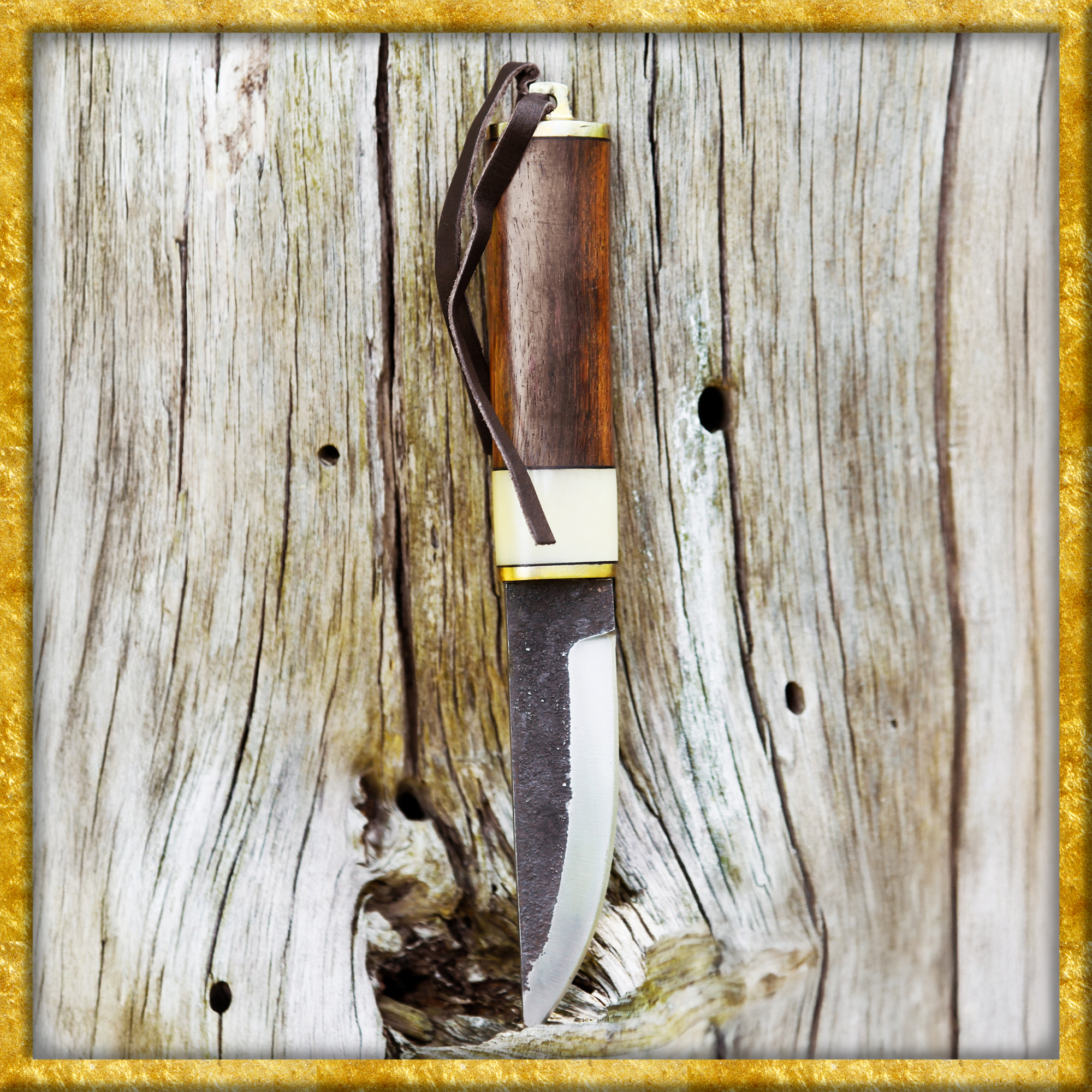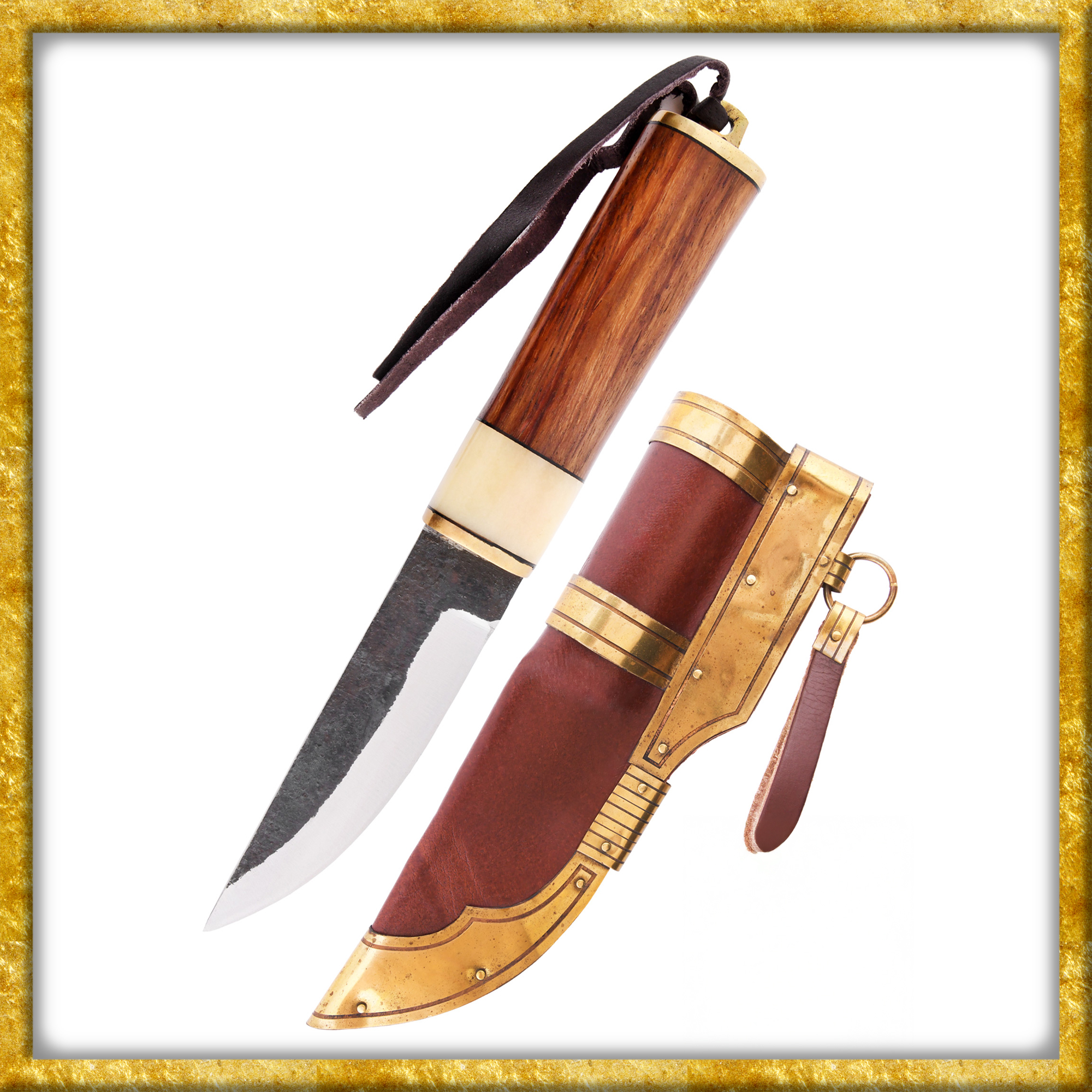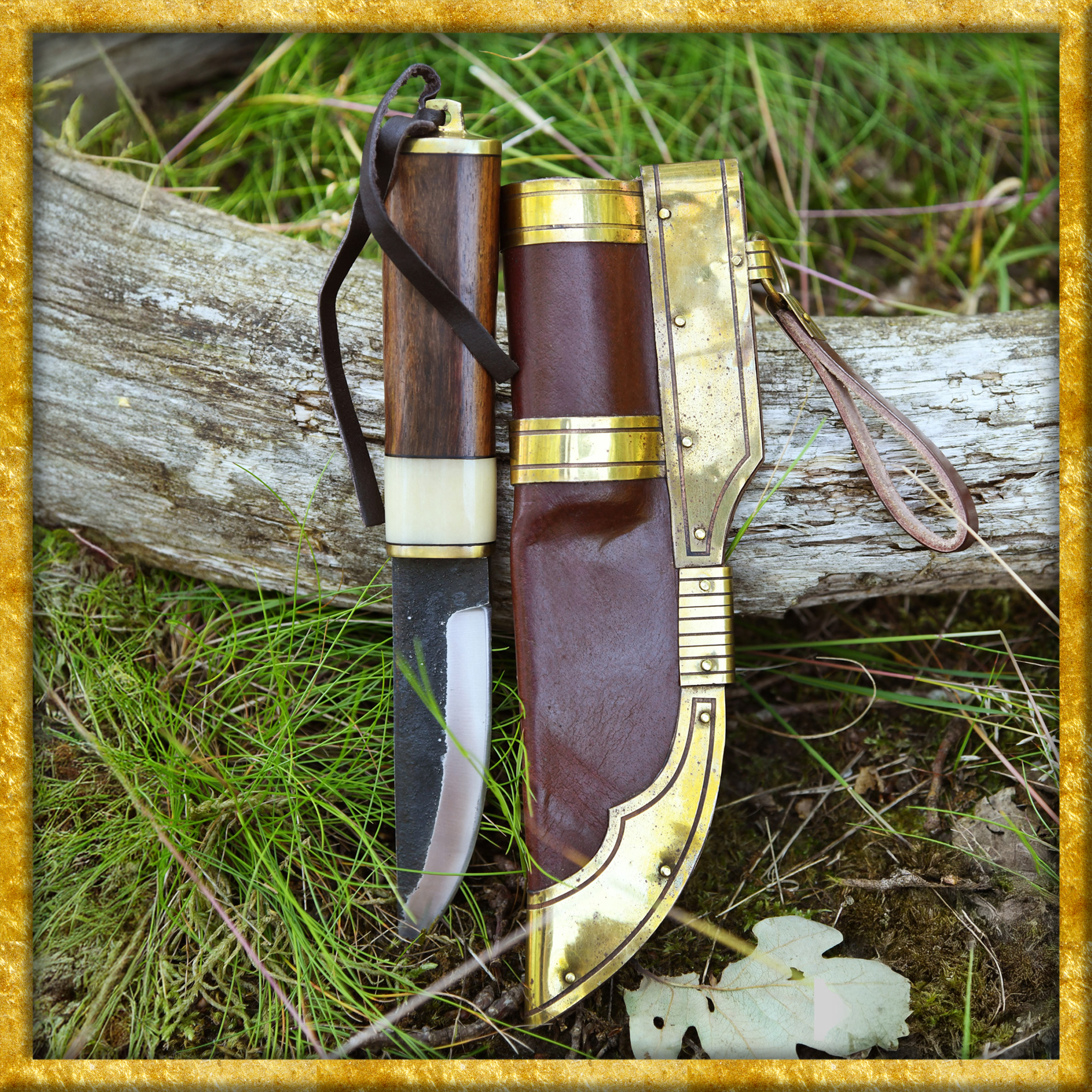 Dieses hochwertige wikingerzeitliche Messer wurde nach einem Originalfund aus Gotland, Schweden, ca. 9./10. Jh., handgefertigt. Die handgeschmiedete Karbonstahklinge wurde scharf geschliffen und die schmiedeschwarze Zunderschicht, die auf dem Klingenspiegel belassen wurde, verleiht dem Messer eine rustikale Optik. Wie bei vielen typischen gotländischen Messern aus der Wikingerzeit schließt der Walnussgriff zur Klinge hin mit einer Lage aus Knochen und einer Zwinge aus Messing ab. Die Griffkappe mit praktischer Öse, zur Aufnahme eines Tragebands oder zum bequemen Herausziehen des Messers aus der Scheide, ist ebenfalls aus Messing gefertigt. Die wunderschöne Scheide aus gegerbtem Leder mit reich verzierten Messingbeschlägen ist mit einem grosszügigen Tragring ausgestattet. So lässt sich das Wikinger-Messer bequem am Gürtel tragen.