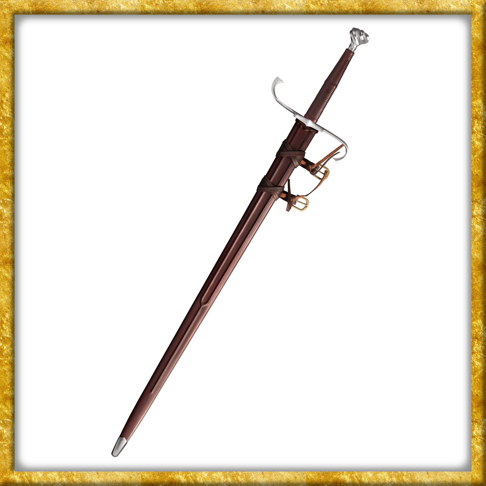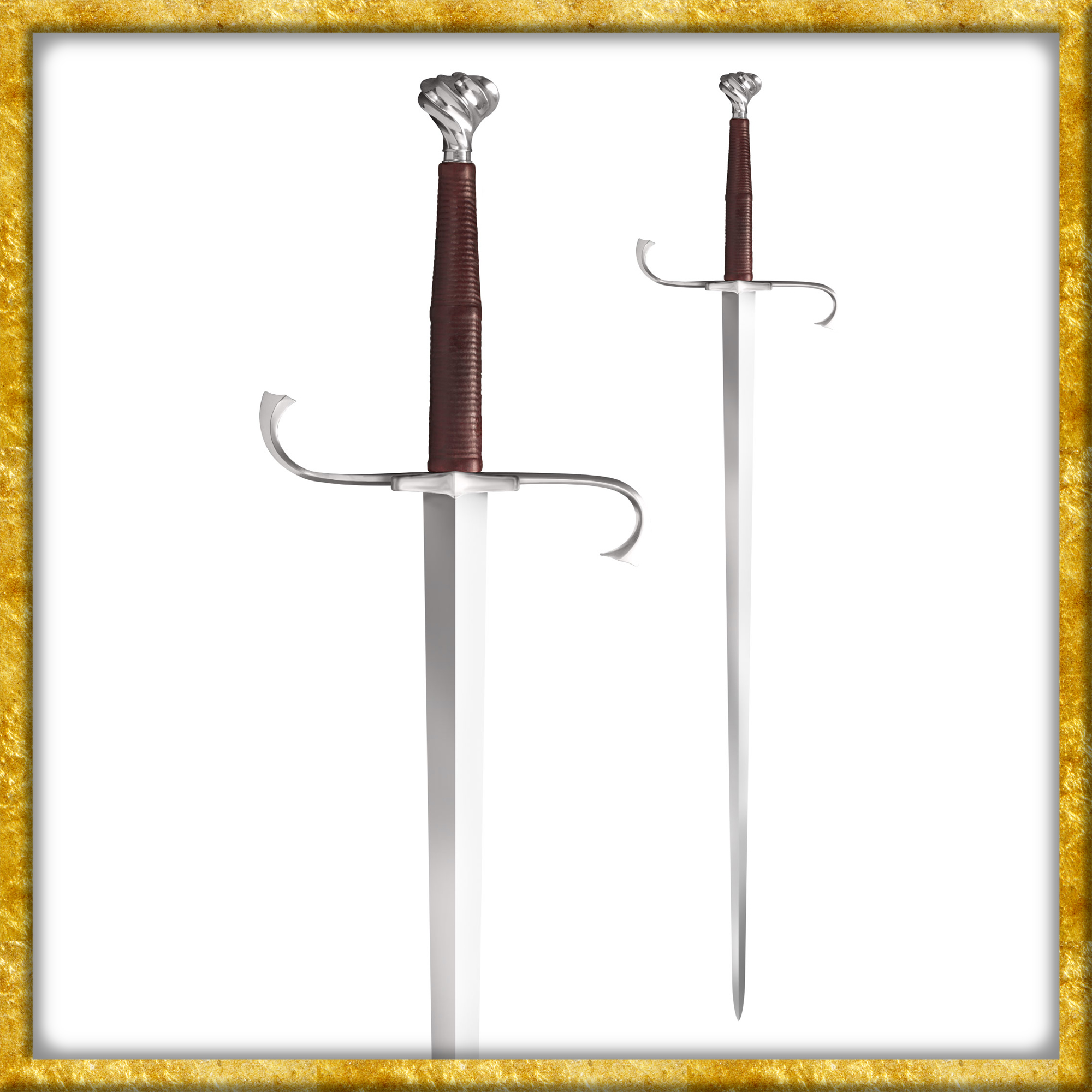 Der lederumwickelte Griff schliesst mit einem schweren Stahlknauf ab, der nicht nur das Gewicht der langen Klinge ausgleicht, sondern auch an sich eine wirkungsvolle Waffe ist. Das spiralförmige Design des Knaufes ist mehr als nur eine gutaussehende dekorative Besonderheit: Es bietet auch mit Handschuhen bzw. Panzerhandschuhen einen bequemen und sicheren Halt.