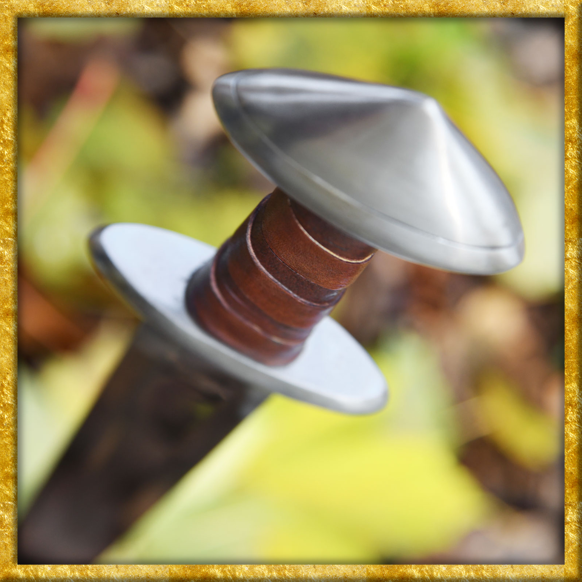 Wie bei vielen erhaltenen historischen Exemplaren aus dieser Zeit ist der Dreiecksknauf eine zweiteilige Konstruktion: Die durchgehende Klingenangel ist am unteren Teilstück verankert, und das obere Teilstück mittels zweier Nieten mit der Basis verbunden.
