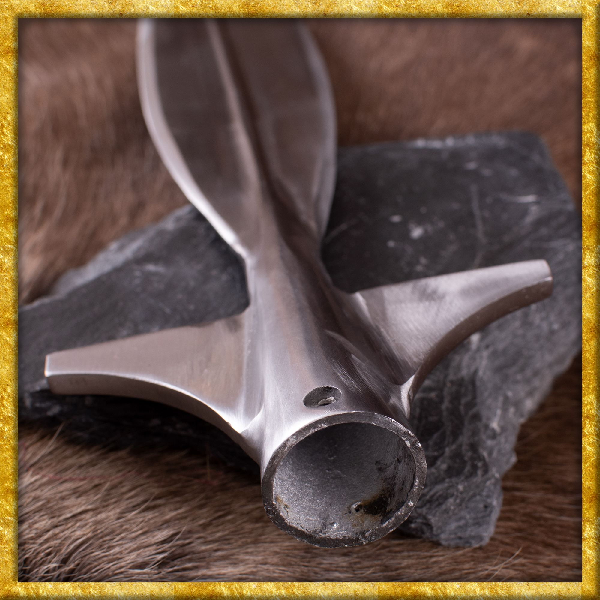 Sie ist ca. 43,5cm lang und die Klinge ist mit einer markanten Mittelrippe verstärkt, die für zusätzliche Stabilität und höhere Durchschlagskraft sorgt. Die vorstehenden Flügel sind ca. 4mm stark. Zwei Bohrungen ermöglichen die Montage an einem Holzstiel Deiner Wahl, um einen ganz eigenen Speer zu kreieren. Die Lieferung erfolgt ohne Schaft und ohne Befestigungsmaterial.