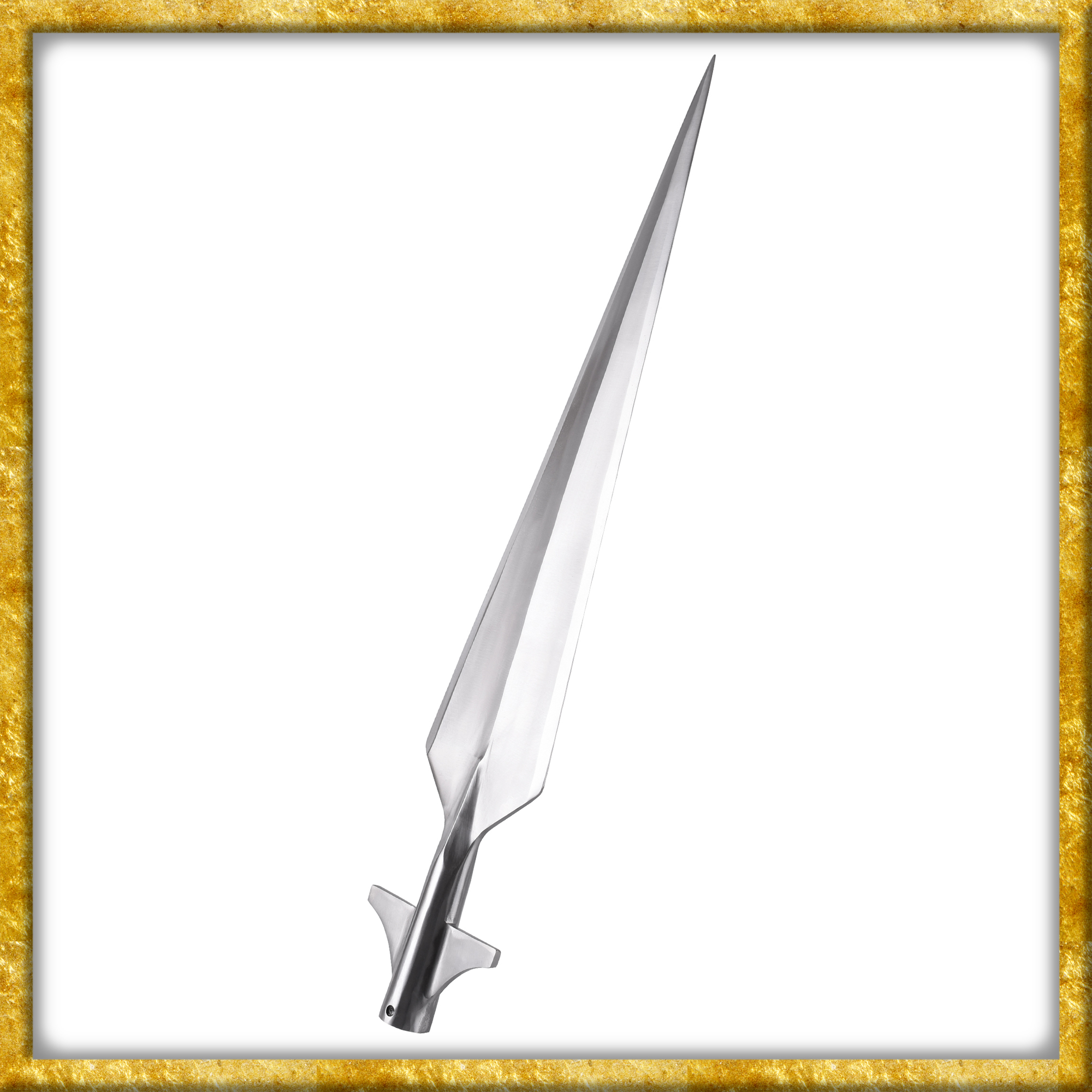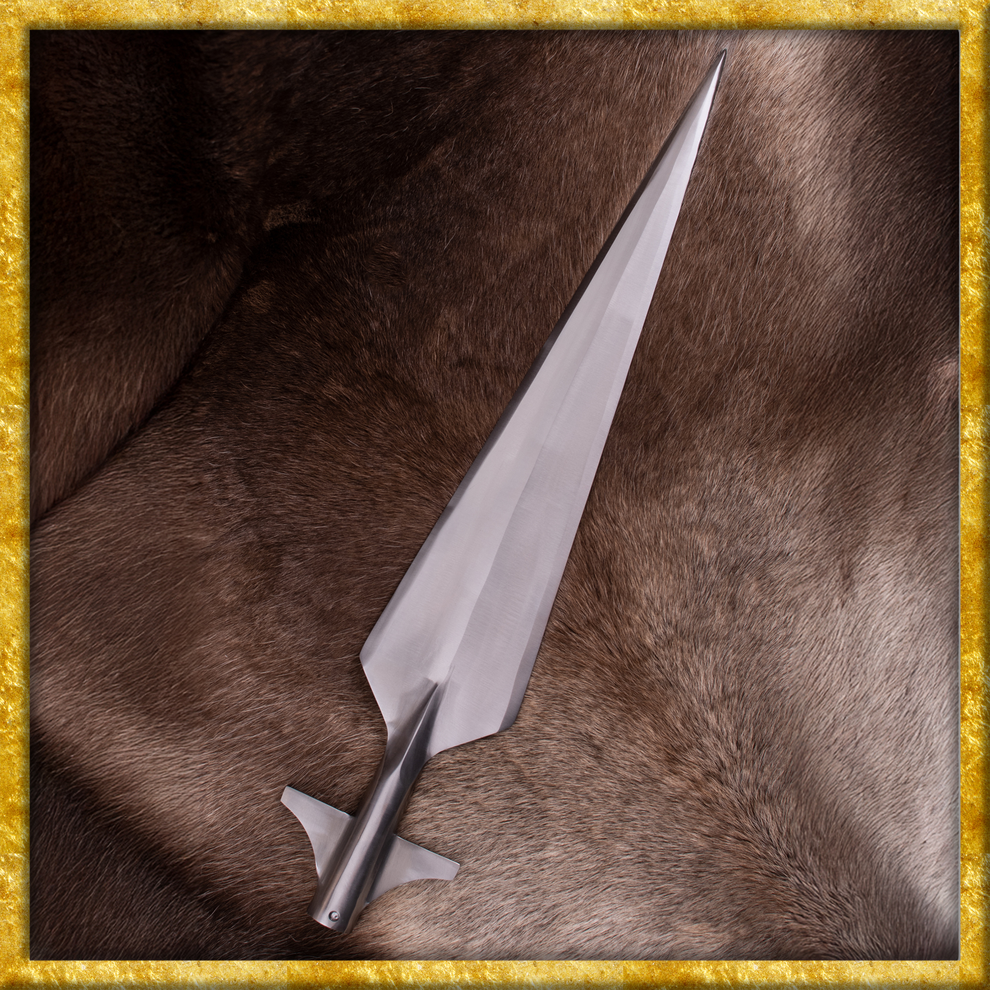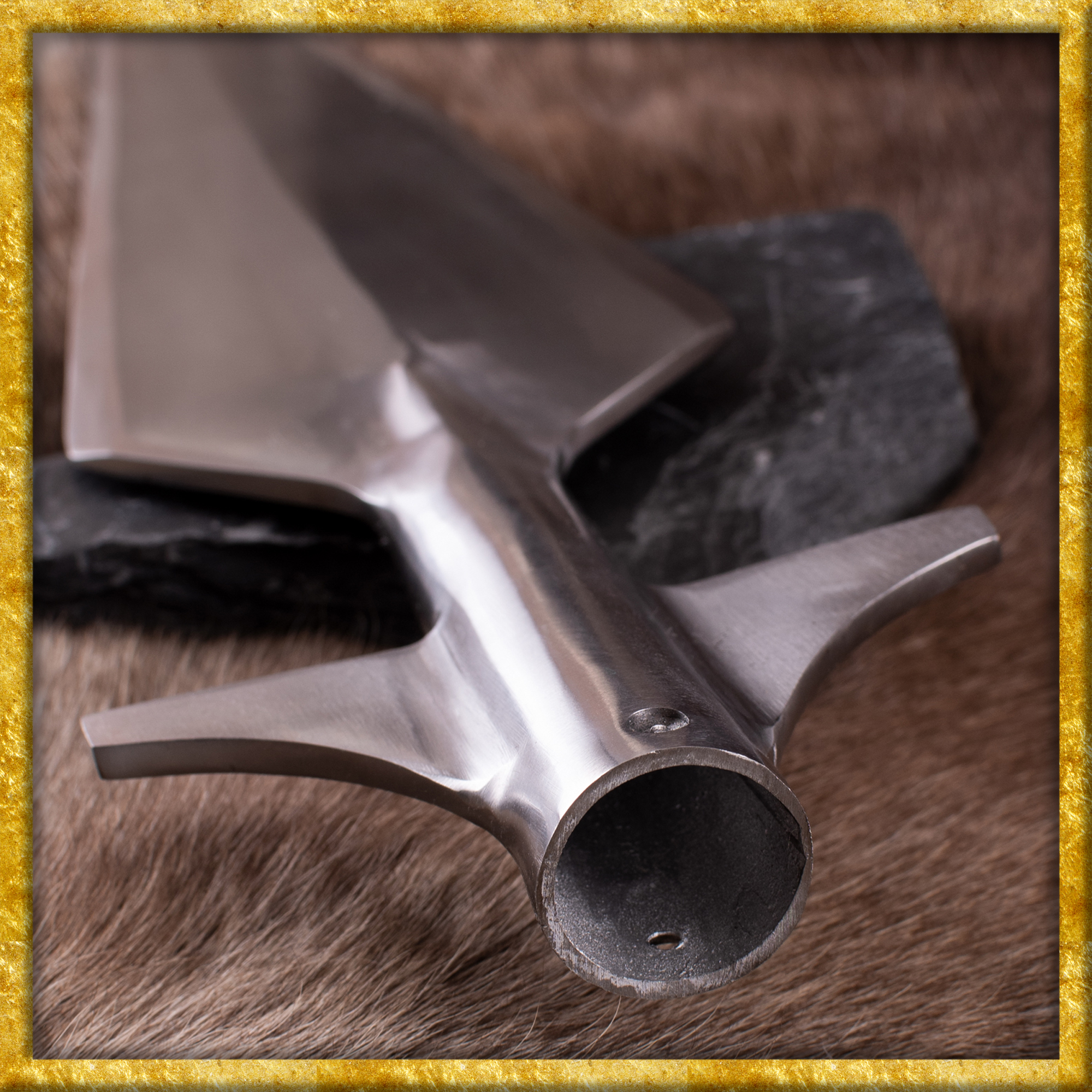 Mit einer solchen gewaltigen Klinge, die sich von einer breiten Basis zu einer langen, schmalen Spitze hin stark verjüngt, wäre der Speerträger nicht nur in der Lage gewesen, tiefe und breite Stichwunden zuzufügen, sondern auch schneidende und schlagende Hiebe zu versetzen. Zwei Bohrungen ermöglichen die Montage an einem Holzstiel Deiner Wahl, um eine ganz eigene Flügellanze zu kreieren. Die Lieferung erfolgt ohne Schaft und ohne Befestigungsmaterial.