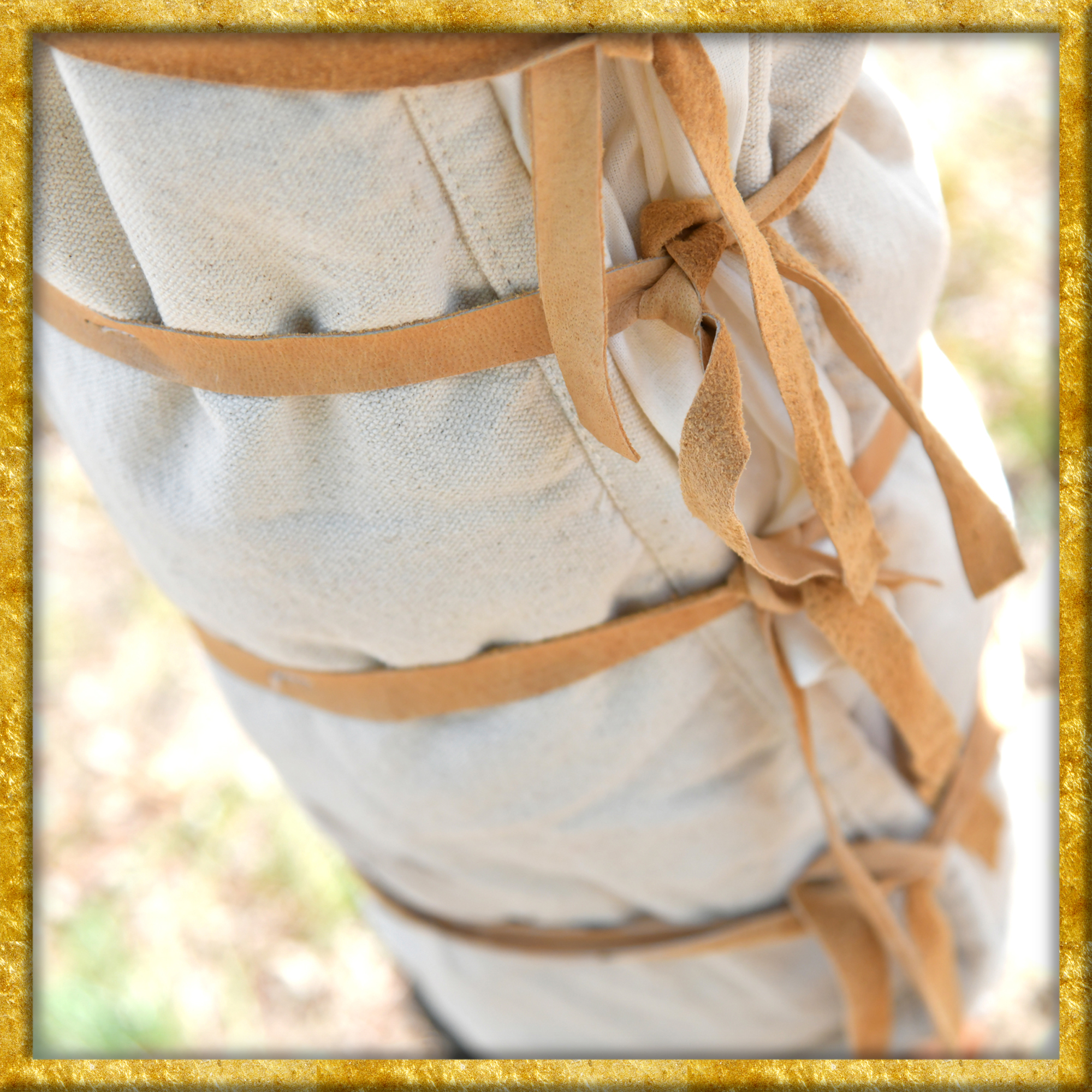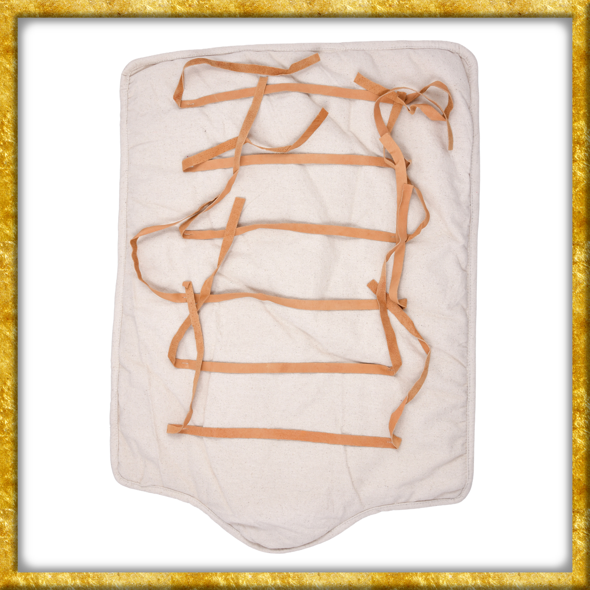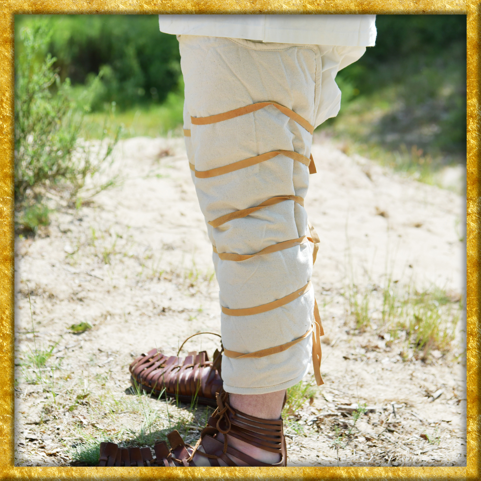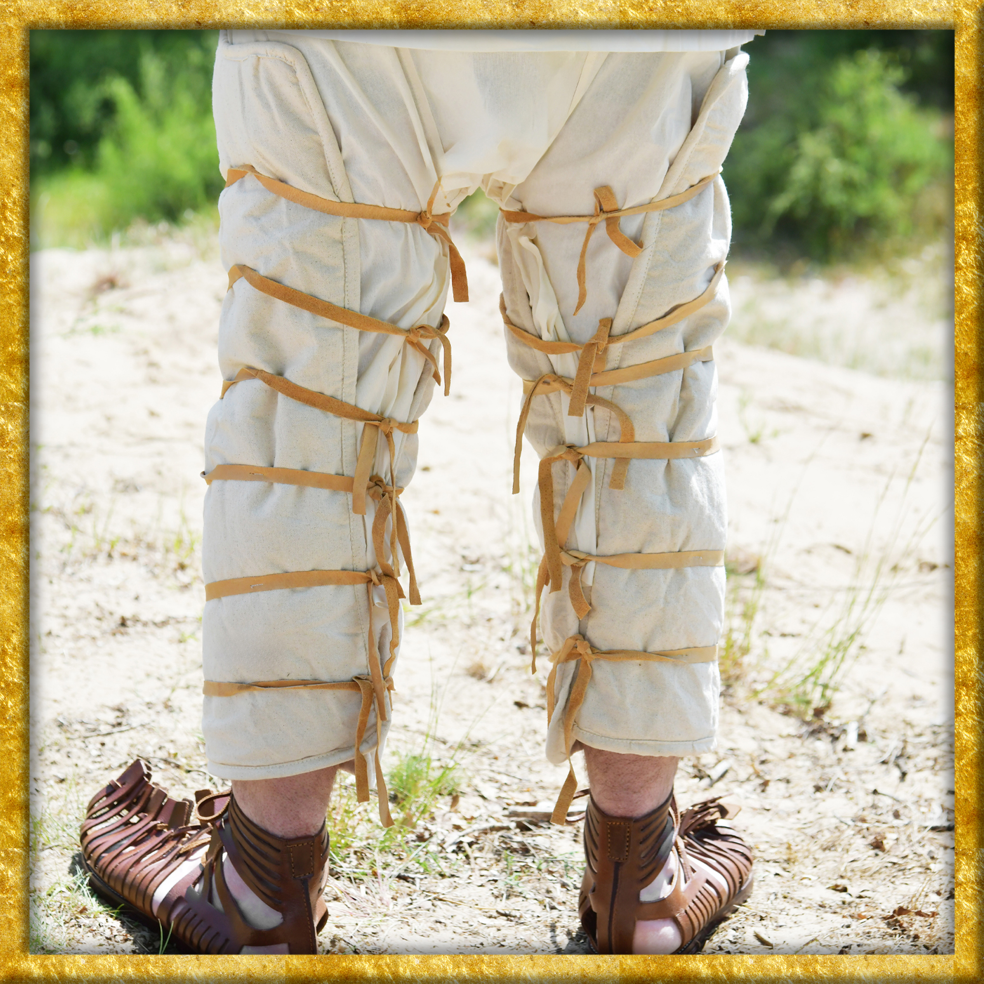 Diese Gladiatoren Beinpolster aus Stoff sind nach zeitgenössischen Abbildungen hergestellt. Das Obermaterial besteht aus Segeltuch aus Baumwolle, dann kommt eine weiche Polsterfüllung aus Polyester und ein Innenfutter aus Baumwolle. Es sind acht Lederbänder angenäht, mit denen man den Beinschützer individuell und passgenau befestigen kann.