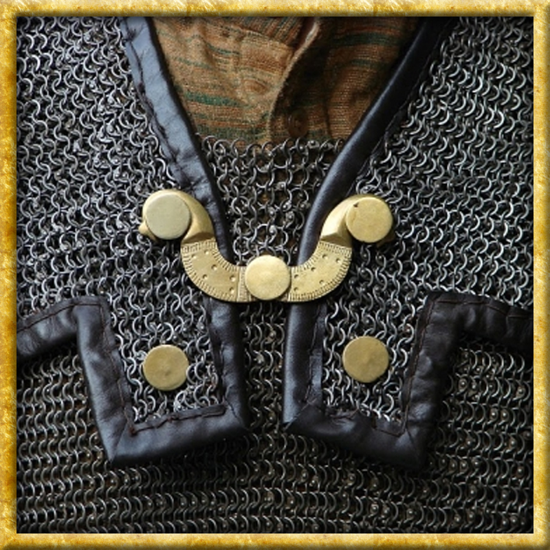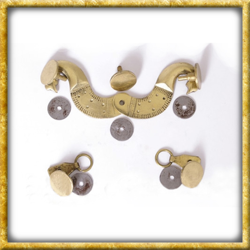 Wir bieten Euch hier ein 14-teiliges Set zur Selbstmonatge von Haken und Knöpfen für das römische Kettenhemd Lorica Hamata. Die Haken, Ösen und Knöpfe sind aus Messing gefertigt, die fünf Konterscheiben für die Köpfe sind aus Eisen.