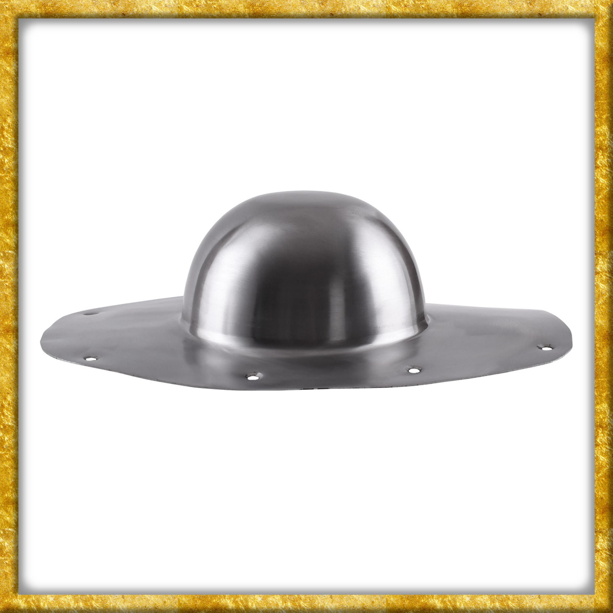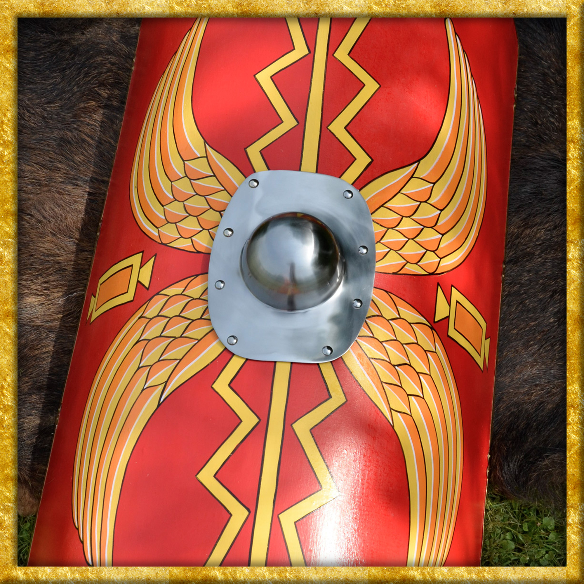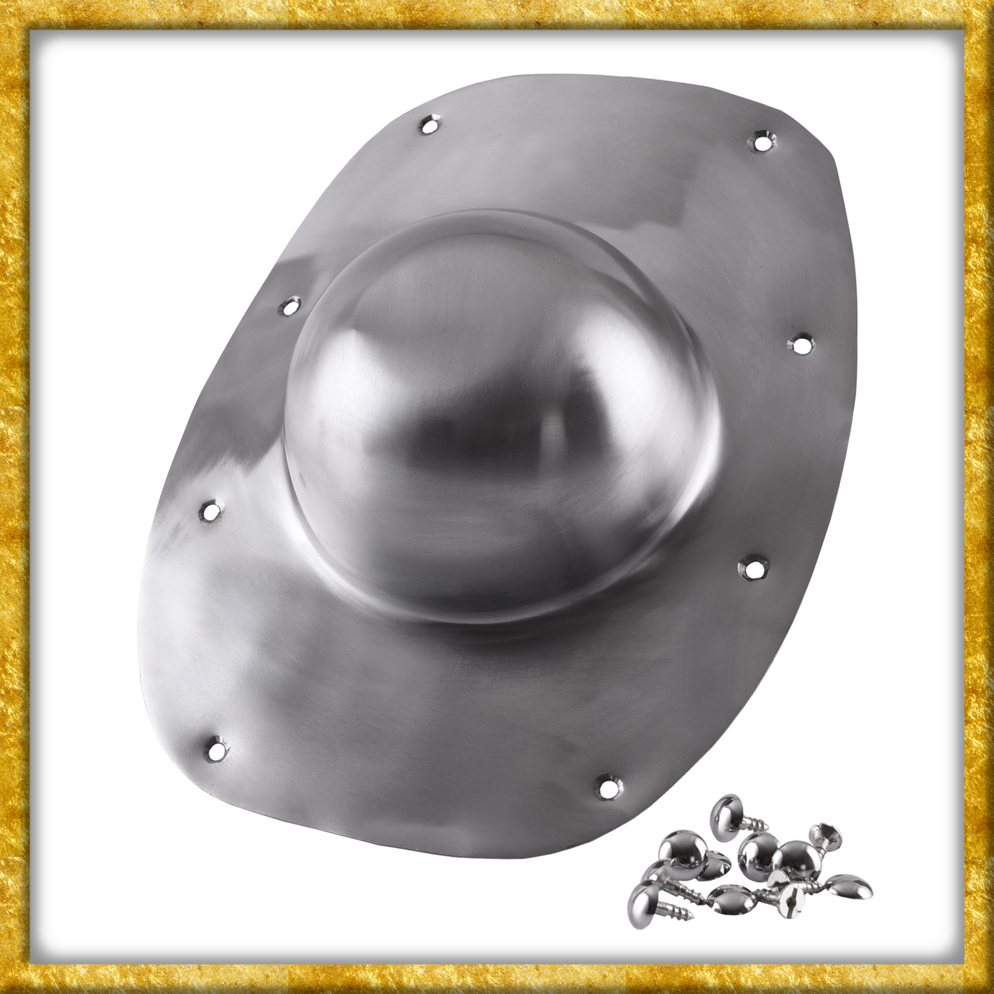 Dieser ovale Schildbuckel, auch Umbo, ist das optimale Zubehör für den anspruchsvollen Reenactor, der seinen Römerschild selbst bauen möchte. Der Umbo ist aus Stahl gefertigt, innenseitig geschwärzt und mit acht Löchern vorgebohrt. Das Befestigungsmaterial, Schrauben mit runden Abdeckkappen aus Stahl ist im Lieferumfang enthalten.