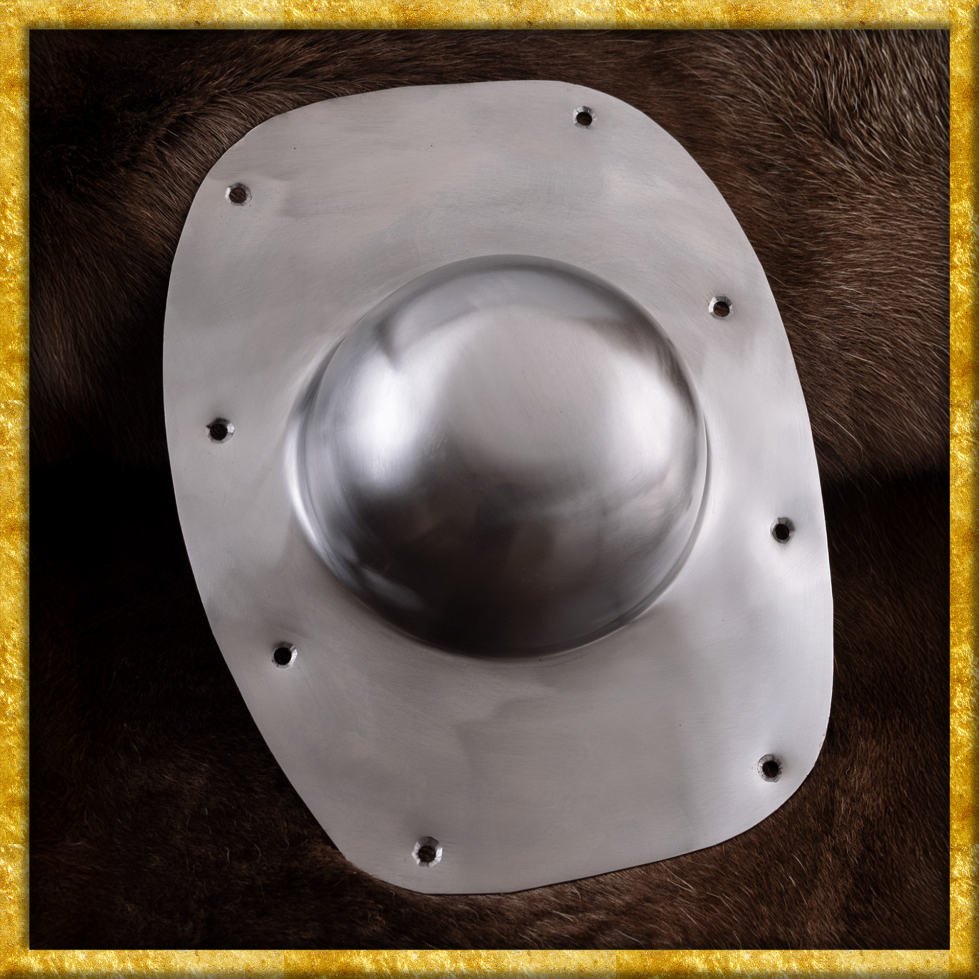 Bitte beachte, dass der Buckel nicht vorgebogen ist. Bei Montage an einem gewölbten Schild sollte er vor dem Zusammenbau der Schildwölbung angepasst werden. Der Durchmesser der Wölbung beträgt ca. 12cm, die Tiefe ca. 7cm.