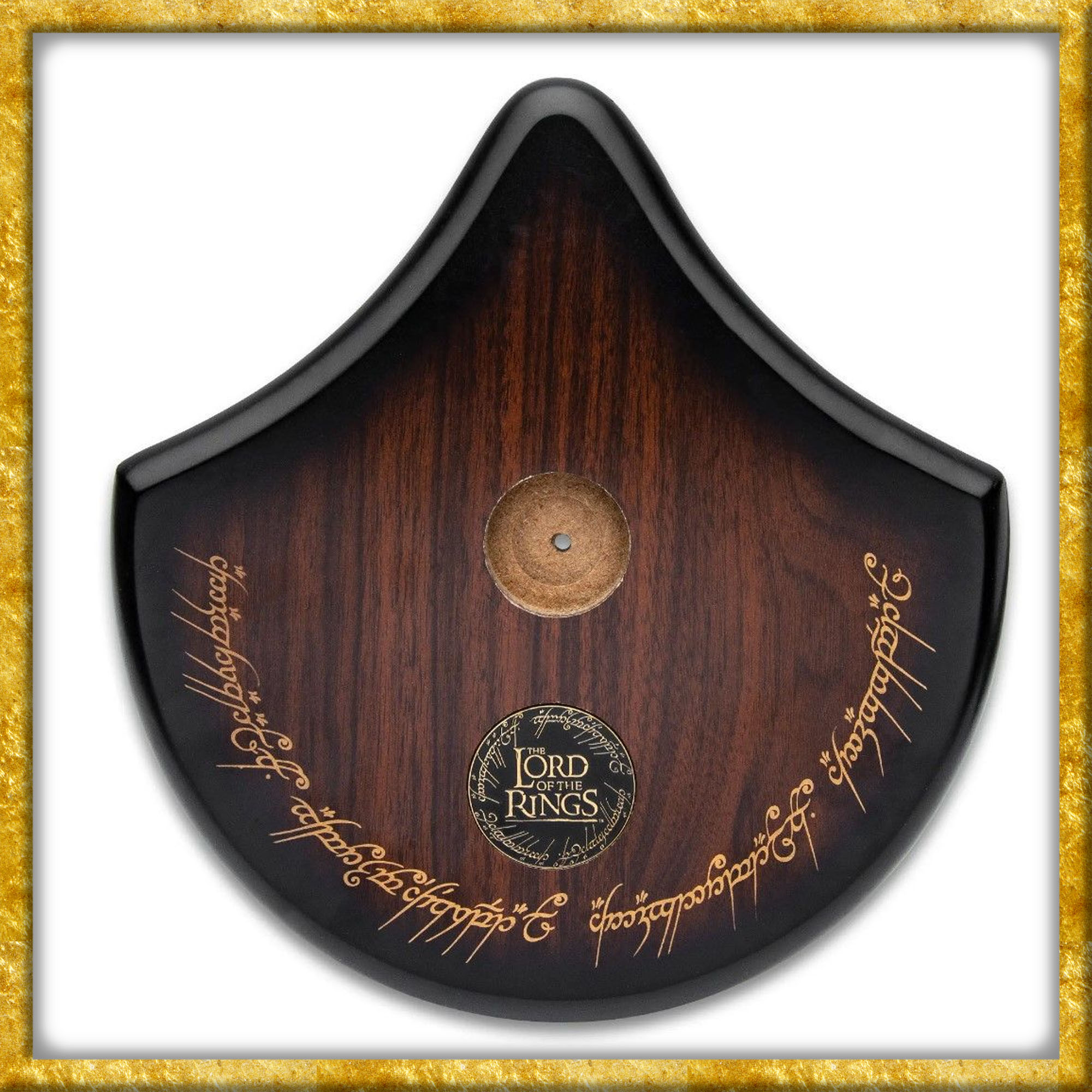 Der Herr der Ringe-Helmständer ist für die meisten Helmrepliken von United Cutlery aus der Herr der Ringe geeignet. Der Ständer hat eine hochwertige Holzkonstruktion, die mit goldenen Elven-Schriftzügen versehen ist. Er wird mit einem schwarz-goldenen offiziellen Der Herr der Ringe-Logo geliefert, das an der Basis befestigt werden kann. Der Schaft des Ständers kann einfach mit der mitgelieferten Schraube befestigt werden. Die Basis des Ständers hat vier Gummipuffer, um Eure Möbel vor Kratzern zu schützen. Der Helmständer hat eine Gesamthöhe von 36,2cm und die Basis misst 23,5cm x 25,4cm.