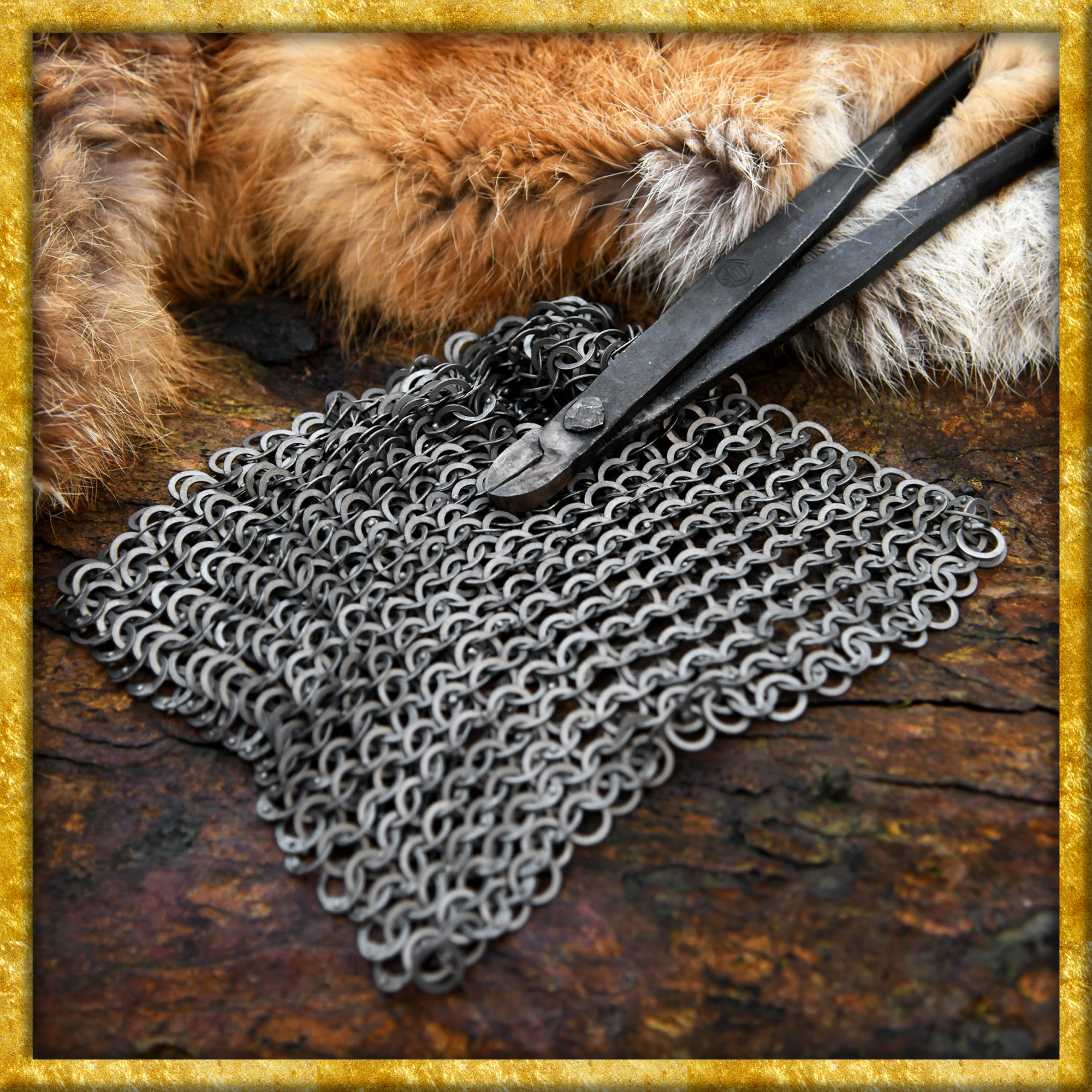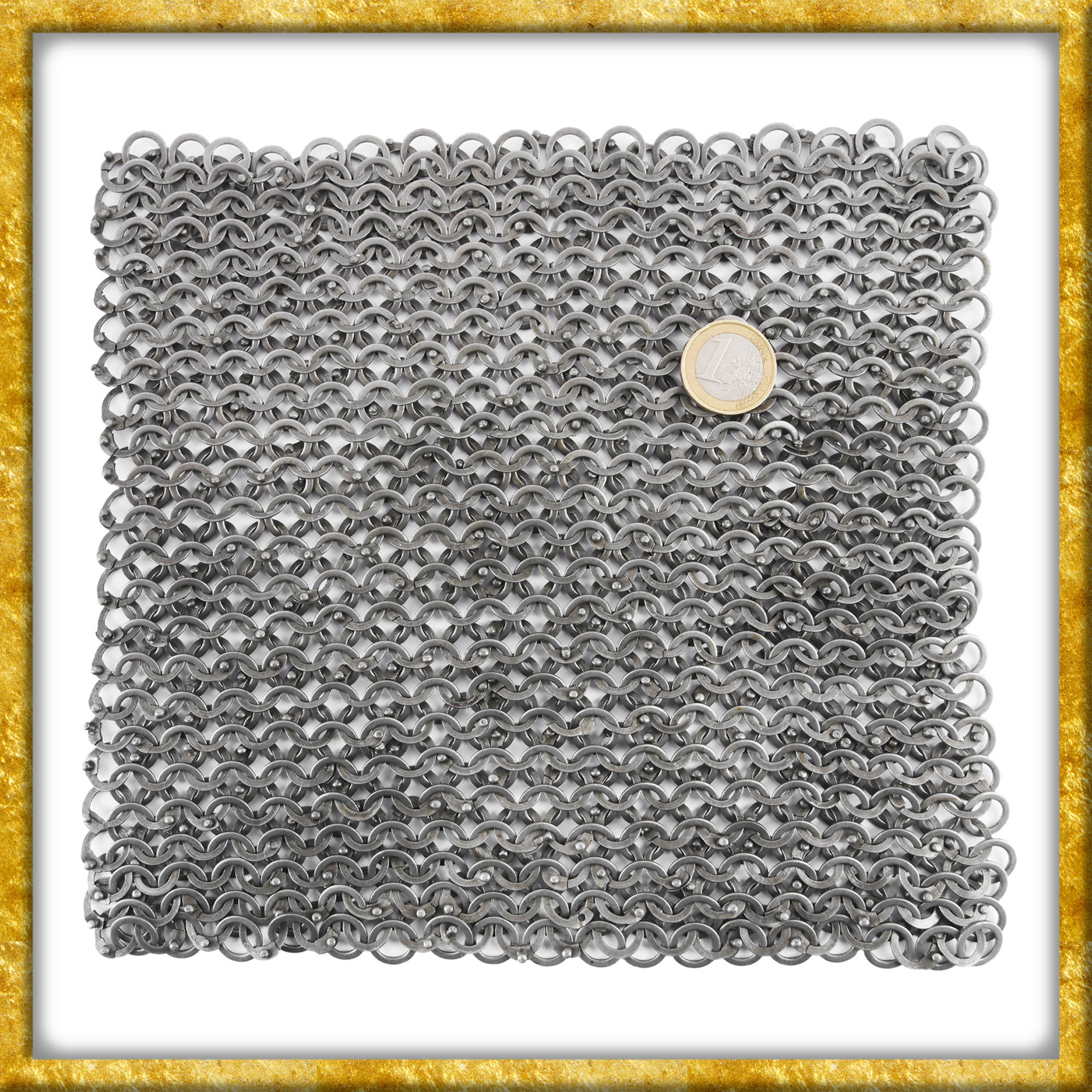Das Kettenstück eignet sich hervorragend zum Reparieren, Verlängern oder Anfertigen von eigenen, massgeschneiderten Kettenteilen. Die Geflechtart FRM ist ein europäisches Flachringkettengeflecht, welches von der Antike bis ins Spätmittelalter in verschiedenen Abwandlungen und mit unterschiedlichen Ringdurchmessern hergestellt und verwendet wurde. Es besteht aus ausschließlich flachen Kettenringen. Abwechselnd sind Ringe und gestanzte Ringe in der Flechtart 4 in 1 miteinander verbunden. Diese Webart war und ist weniger arbeitsintensiv als voll vernietetes Geflecht, da nur jederzweite Ring vernietet wird. Die Nietung der vernieteten Ringe erfolgt durch Rundnieten, welche einen runden, halbkugelförmigen Nietkopf ergeben. Wir kürzen diese authentische Geflechtart FRM ab, nach engl. Flatring Round rivetsMixed.