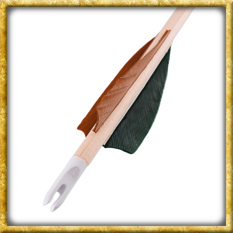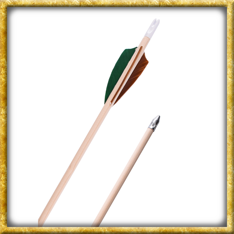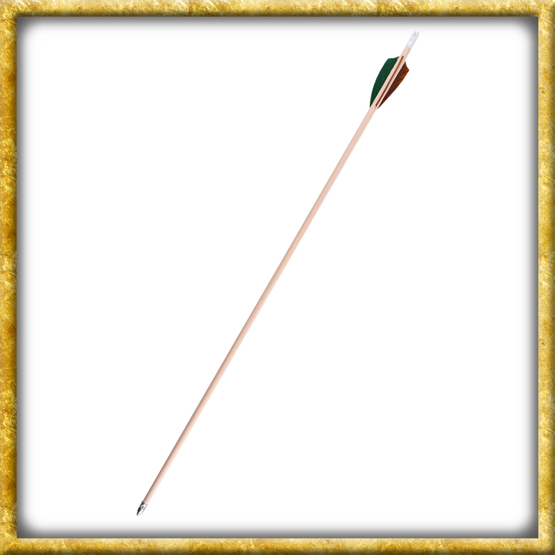 Dieser authentische Mittelalter Fertigpfeil 26 Zoll ist aus Holz gefertigt und verfügt über eine Grün/Braune 3 Zoll Befiederung. Die Nocke ist Weiss und die Spitze ist eine Blechpressspitze.