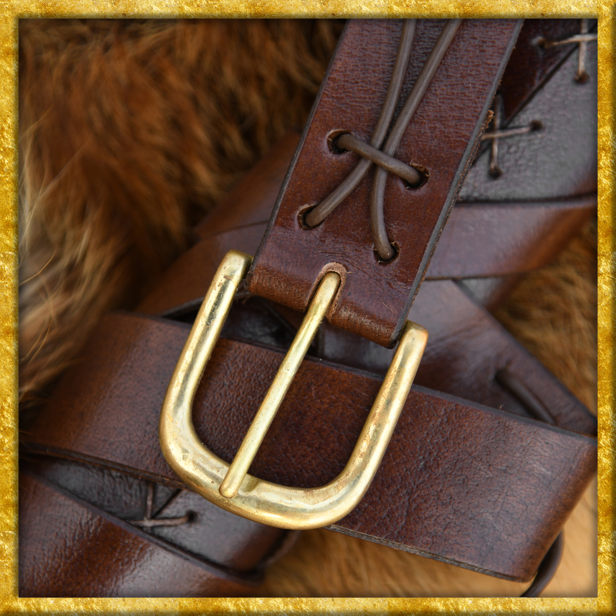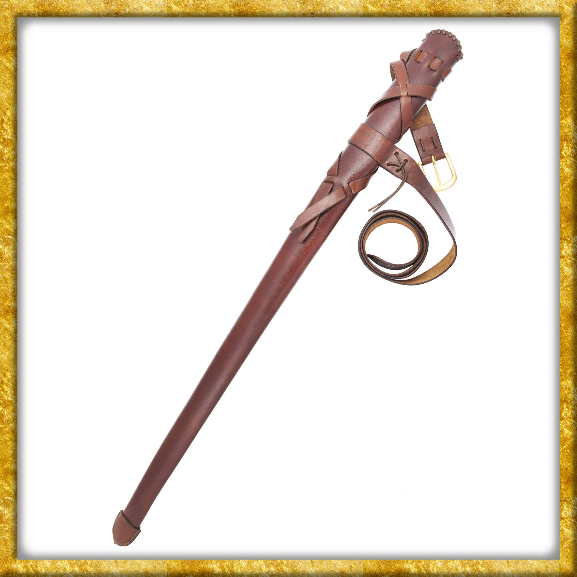 Zum Lieferumfang gehört ein robuster, 3cm breiter, Schwertgürtel, der sehr dekorativ mit der Scheide verbunden ist, und mit einer Messingschnalle abschliesst. Der Riemen lässt sich dank den zahlreichen Löchern auf eine Vielzahl von Grössen passgenau einstellen. Die Länge des Gürtels bei voller Streckung beträgt ca. 105cm.