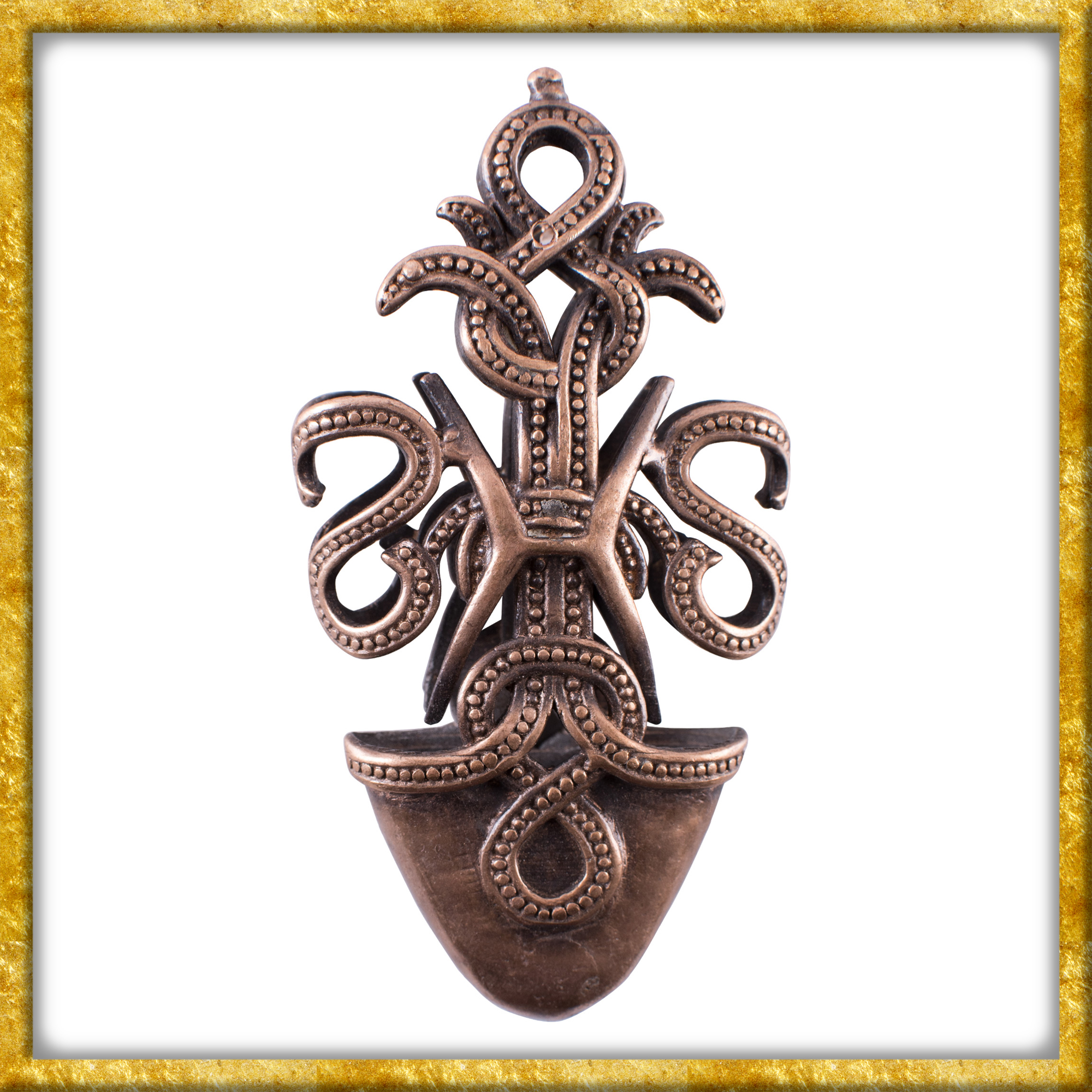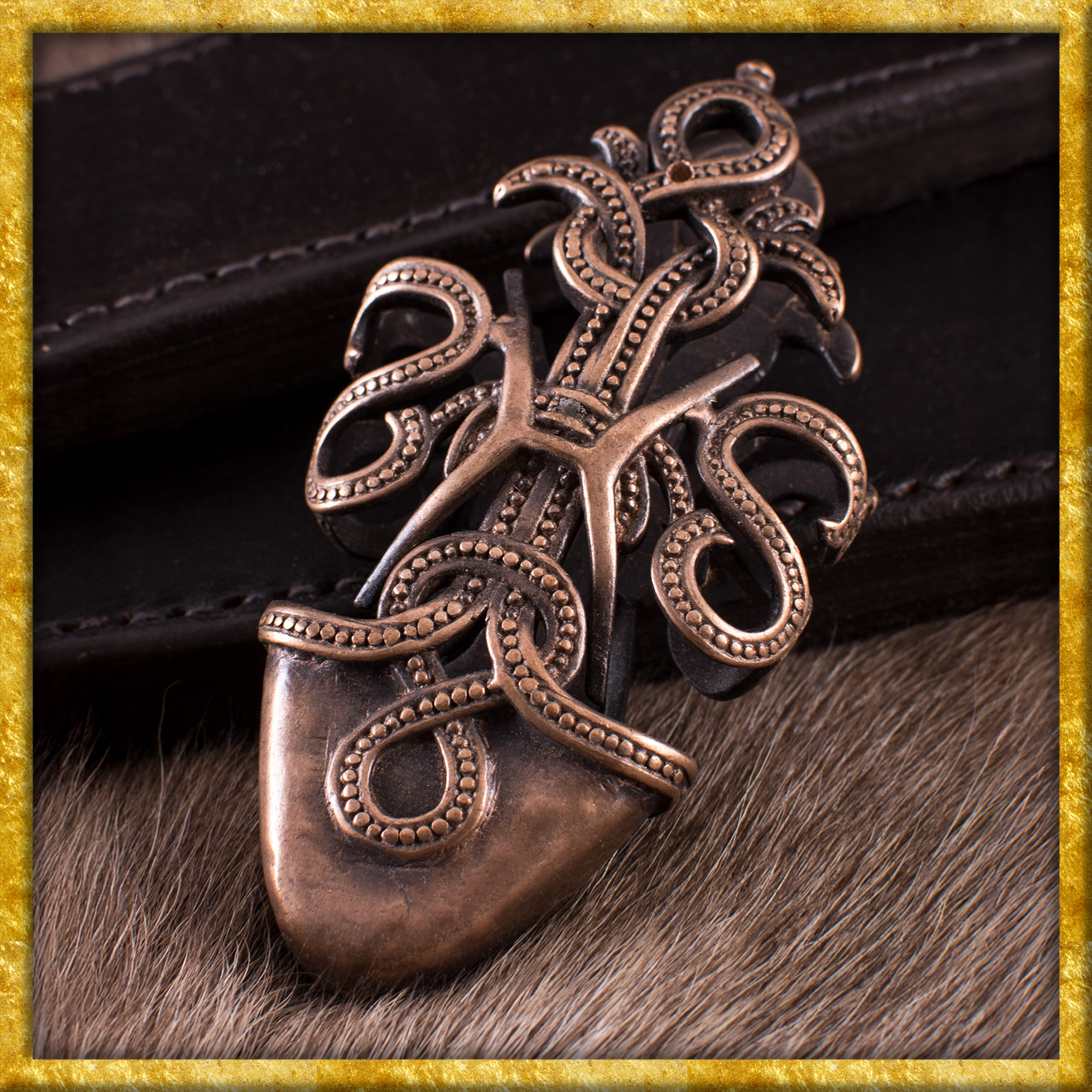 Dieses wunderschöne Scheidenortblech oder auch Ortband aus Bronze ist mit einem Schlangen-Knotenmuster verziert, einem in der keltischen und wikingerzeitlichen Kunst wiederkehrenden Motiv. Dieser Beschlag ist ein ideales Accessoire zum Bauen eigener Schwertscheiden, eignet sich aber auch hervorragend als Ersatzteil für viele bereits existierende Wikingerschwerter. Die Lieferung erfolgt ohne Befestigungsmaterial.