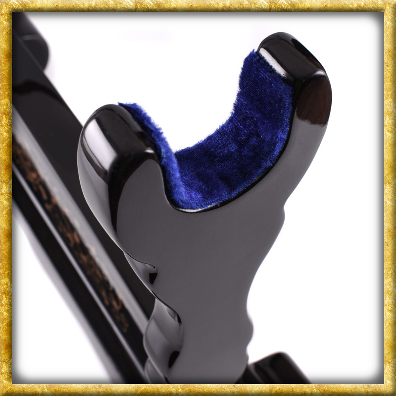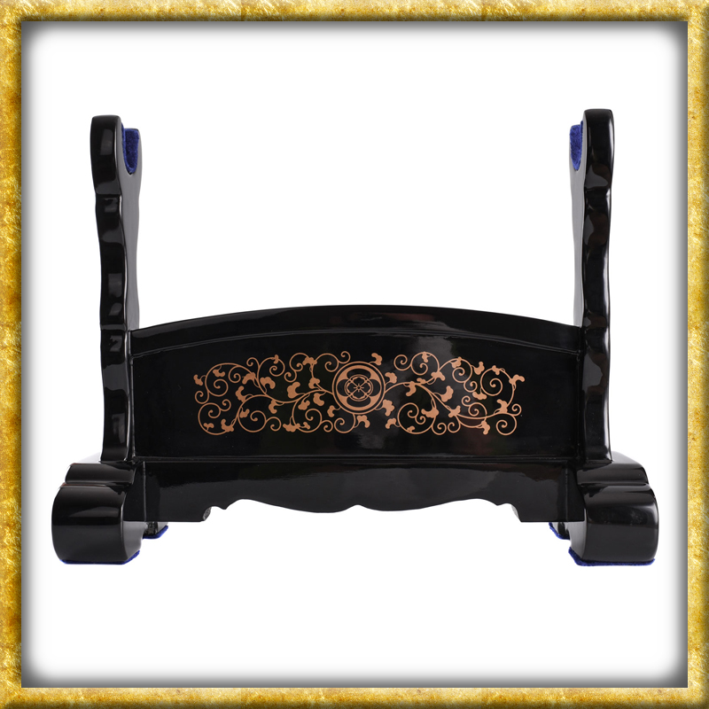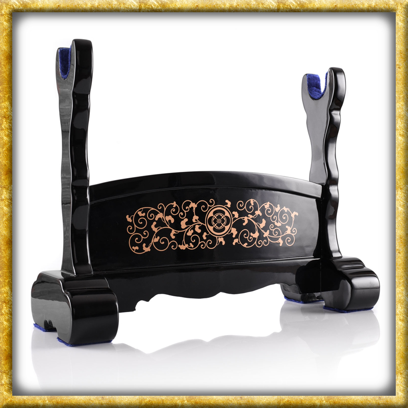 Dieser Schwertständer in Museumsqualität wurde von Hanwei für das Shuihi Tachi gestaltet, ist aber auch ein hervorragendes Display für jedes Katana oder Tachi. Der schwarz-lackierte Hartholz-Ständer hat kunstvolle Verzierungen, die sich um einen zentralen Mon schnörkeln.